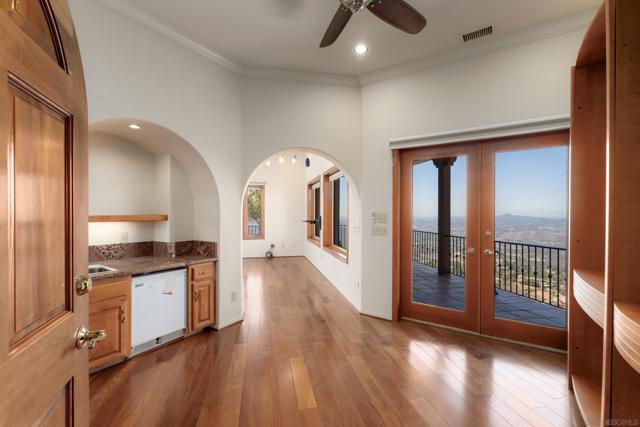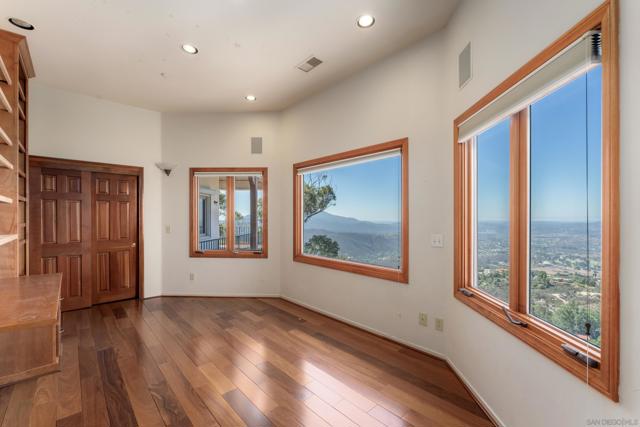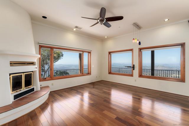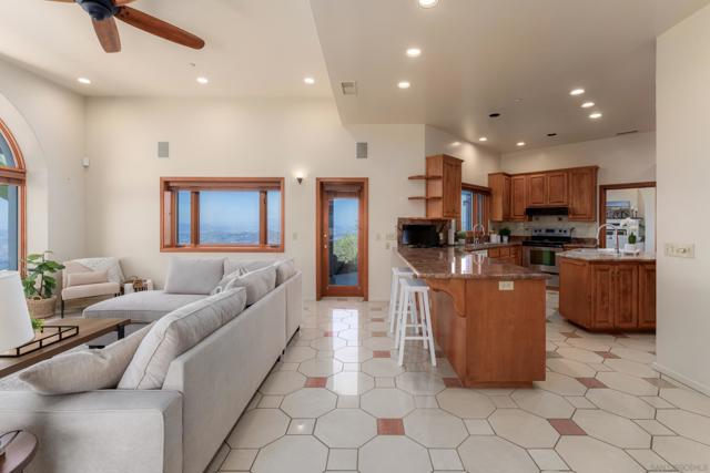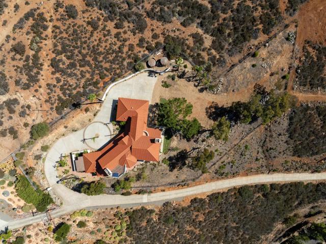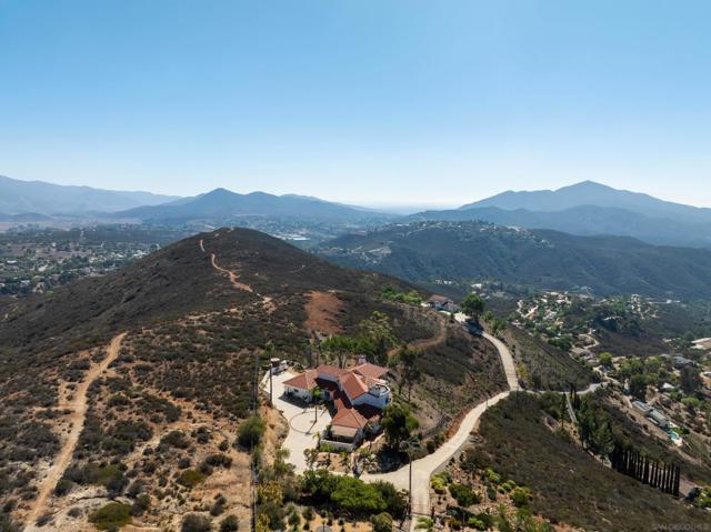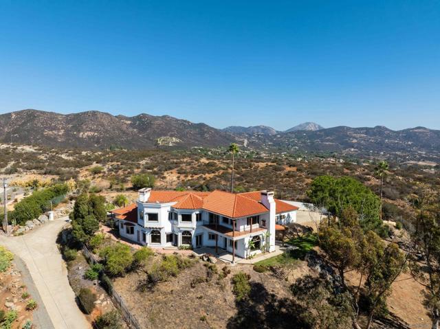 Welcome to 4029 Alta Loma, a striking Mediterranean-inspired residence perched atop a private hilltop in Jamul with sweeping views. Set on more than 5 acres with limited neighbors and the McGinty Mountain trailhead just behind, this custom estate offers an ideal blend of privacy, nature, and modern convenience, all less than 10 minutes from town. Spanning 4,650 square feet, the home features 6 bedrooms and 6.5 baths, thoughtfully designed for both everyday living and large-scale entertaining. Its sophisticated Mediterranean character is showcased with white-washed stucco exterior walls, interior arched doorways, and timeless details. Inside, the expansive great room with fireplace flows seamlessly into a formal dining area and chef’s kitchen with dual refrigerators and abundant storage. Natural stone flooring, a grand staircase with wood banister, wood-framed windows, recessed lighting, and custom finishes elevate the interior. The versatile floorplan includes multiple ensuite bedrooms, office/bonus spaces, and a media room with fireplace. The luxurious primary suite offers its own fireplace, outdoor patio, kitchenette, and spacious walk-in closet. Practical additions such as a powder bath, laundry chute, and LG Signature washer/dryer enhance daily living. Outdoors, two reservoir water tanks, septic system, dual propane tanks, and a private internet antenna provide practical support. A 3-car garage, newer furnace and water heater, and water-softening system add value, while electronic metal window coverings ensures peace of mind.