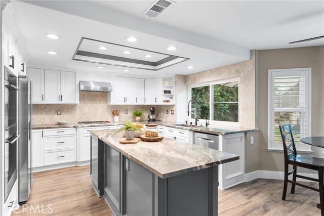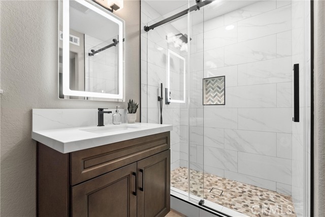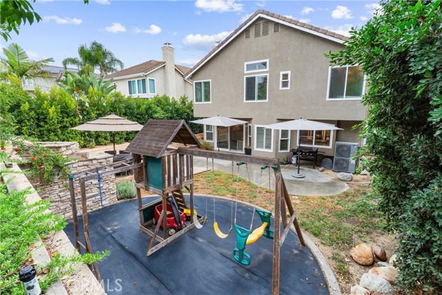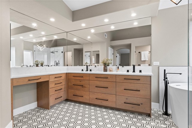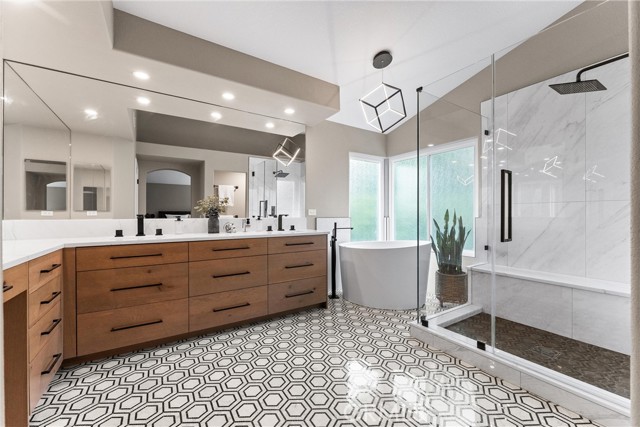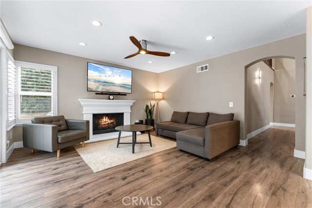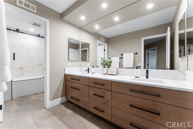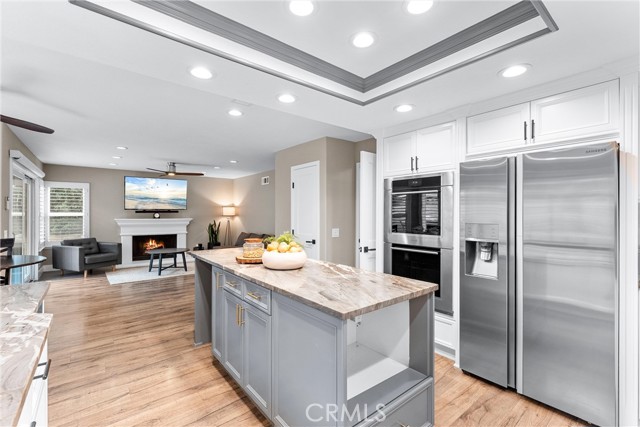 Welcome to Fairmont Terrace, a highly sought-after gated community in Yorba Linda. This beautifully remodeled two-story home blends modern design, smart upgrades, and comfortable living in one seamless package. Step inside and you’ll be greeted by high ceilings, a brand-new custom staircase, and a fireplace featuring a statement marble mosaic design. Every detail in this home has been upgraded, including solid wood doors, elegant casings, recessed lighting throughout, and custom closet organizers in all bedrooms. The heart of the home is the chef’s kitchen, redesigned for both entertaining and everyday living. Quartzite countertops and a marble backsplash pair beautifully with high-end appliances, including a Wolf range and hood, Wolf M Series double ovens, and a Bosch dishwasher. The kitchen features a spacious island and cabinetry with endless storage, as well as custom solid oak shelving in the generous pantry. Retreat upstairs to a primary suite designed to feel like a luxury spa. High ceilings and a stunning bath create a true escape, with custom cabinetry and quartz countertops, a high-end Japanese soaking tub, pebble-stone shower floor, marble mosaic flooring throughout, and a separate space with a remote-controlled Toto toilet. Two additional upstairs bedrooms share a hall bath that has also been fully redesigned, with quartz counters, a custom tub and shower, and a Toto toilet. The downstairs bedroom and full bath have likewise been fully remodeled, providing comfort and flexibility for guests or multi-generational living. Efficiency and convenience are built in with paid-off solar panels, a Tesla Powerwall, whole-home water filtration, reverse osmosis in the kitchen, dual-zoned HVAC with new ducting, and a whole-house fan. The exterior is also newly painted. Step outside to a spacious backyard with a patio and fruit trees, perfect for gatherings or quiet evenings at home. The back slider also features a convenient remote-controlled shade. This home is more than move-in ready — it’s a rare opportunity to own a highly upgraded, energy-smart property in one of Yorba Linda’s most desirable communities, close to top-rated schools, shopping, and dining. Don’t miss this incredible opportunity!
