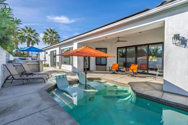 The owners have meticulously RENOVATED and REMODELED this exquisite home with today's CONTEMPORARY DETAILS. Almost too many upgrades to list but include full bathroom renovations, NEW THERMAL WINDOWS throughout, new AC/furnace, new TANKLESS WATER HEATER and OWNED SOLAR!!!! Former orange peel drywall now has smooth finish throughout. Located on a quiet CUL DE SAC within the gates of the beautiful Bermuda Dunes Country Club community featuring a highly regarded 18-hole private golf course. Excitement builds as you navigate the long walkway to the modern glass front doors and step onto the majestic wood plank style ceramic floors. Once inside, you sense refined sophistication. The 2 NEWLY ENLARGED WINDOWS off the kitchen/great room and sliding doors reveal pristine SOUTHERN VIEWS overlooking the sparkling pool and built-in OUTDOOR KITCHEN. The pool even comes with a chiller for those extra hot days! Chef-inspired kitchen with OVERSIZED ISLAND features a Sub-zero built-in glass door refrigerator, undercounter wine fridge and WOLF COMMERCIAL OVEN/RANGE. The primary bedroom on the East wing will be sure to impress the most discerning Buyer. Entering the primary bath, you will feel like you just stepped into a high-end spa with backlit mirrors, large walk-in shower, stand-alone soaking tub separating his & her vanities appointed with marble to the ceiling. Guest bedroom with ensuite bath & walk-in closet in the south wing. Jack & Jill bedrooms located in the west wing. Large laundry room. OVERSIZED GARAGE - park 4 cars! Natural gas firepit. Additional BOAT/TRAILER/RV PARKING SPACE.