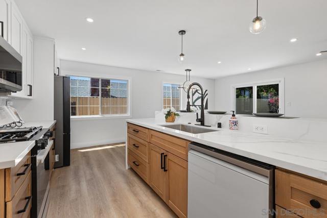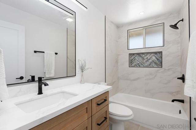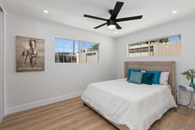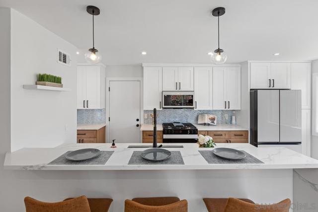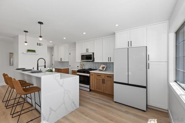 Priced to sell! Beautifully remodeled, single level home on a coveted Mount Street; this one has it all! Step into the open floor plan interior that allows highly functional living; with remodeled kitchen with lots of cabinets and counter space, quartz tops, custom backsplash and new Smart appliances, and 42" bar height counter for eat up dining, is perfect for entertaining. Living area also features a custom tiled fireplace ready for TV, LVP flooring throughout. Nicely appointed remodeled bathrooms with custom tile and white oak vanities. Enjoy San Diego living on the outside of this home featuring large front and rear yards, well manicured, low maintenance landscaping with LOTS of synthetic turf, and large patio for family gatherings. Some other recent upgrades include: new ABS plumbing, quality plumbing and electrical finishes, new doors, baseboards, casing, painting inside and out, new FAU & Mini split AC Condenser, and so much more! The home is located in a central neighborhood in San Diego with easy access to freeways, beaches, parks, hiking, dining, and entertainment, making it perfect for those who enjoy an active lifestyle.