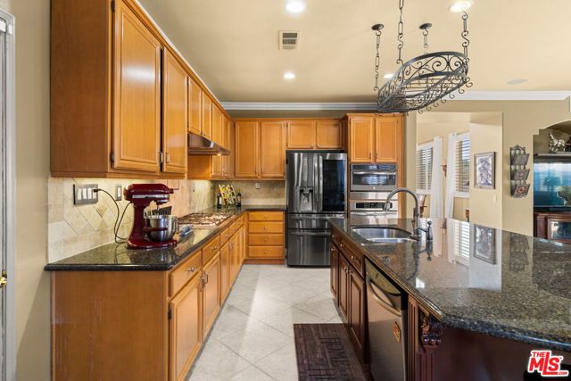 Nestled on a quiet cul-de-sac in one of Rancho Cucamonga's most coveted neighborhoods, this turnkey 5-bedroom home pairs everyday comfort with elevated style. Within the award-winning school district and surrounded by scenic trails and mountain views, the residence spans over 2,900 square feet of thoughtfully designed living space. The entry opens to an airy floor plan where formal living and dining rooms are framed by soaring two-story ceilings, creating a grand yet inviting atmosphere. The kitchen, bright and functional, connects seamlessly to the family room where a cozy fireplace anchors the space. A versatile main-floor bedroom or office and a full bath with shower add convenience and flexibility. Upstairs, the expansive primary suite is a retreat of its own, filled with natural light and sweeping views. It offers a generous walk-in closet and a spa-inspired en-suite bath with dual sinks, a soaking tub, and a separate shower. Three additional bedrooms, a full bathroom, and an upstairs laundry room provide comfort and ease for everyday living. The backyard is a private oasis designed for both relaxation and entertaining. A fully upgraded in-ground pool and spa take center stage, complemented by an outdoor fireplace, multiple dining areas, and a large grassy yard, all set against the dramatic backdrop of the mountains. Additional features include solar panels, a three-car garage with ample overhead storage, an extended driveway with room for multiple vehicles, and a wide paved side yard ideal for RV or boat parking. Just minutes from top-rated schools, shopping, dining, and major freeways, this home offers the best of both convenience and lifestyle in a truly sought-after community.