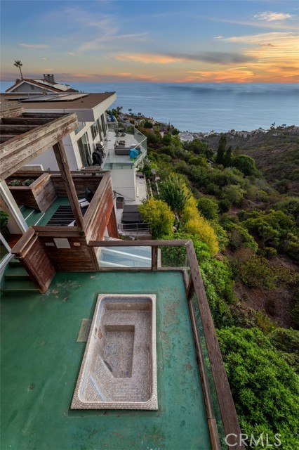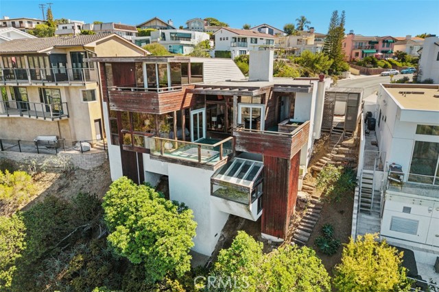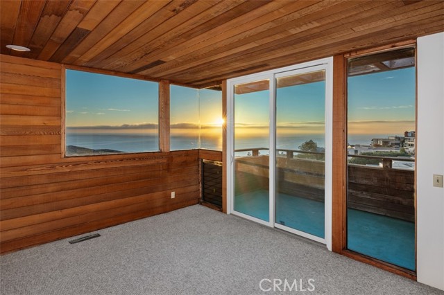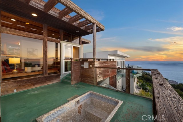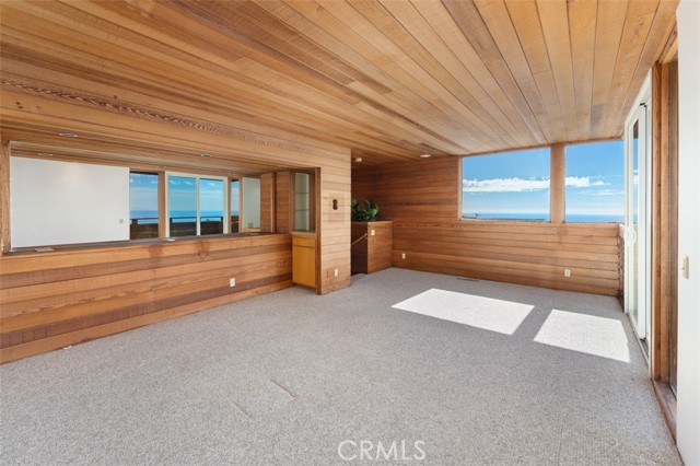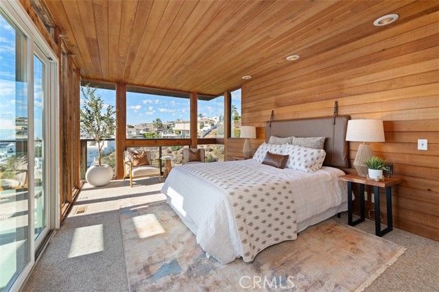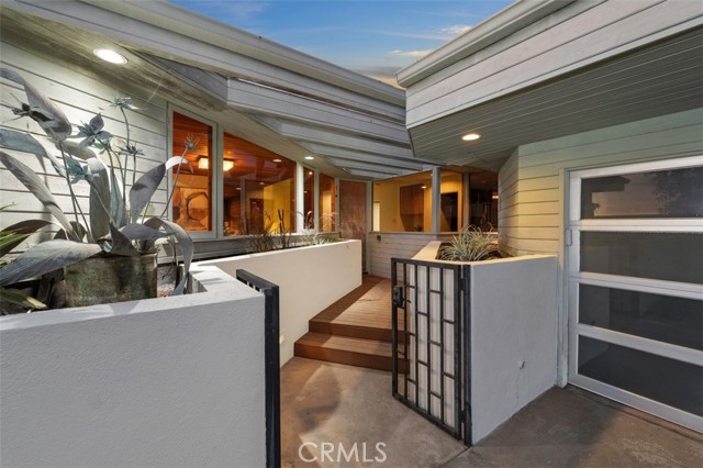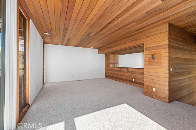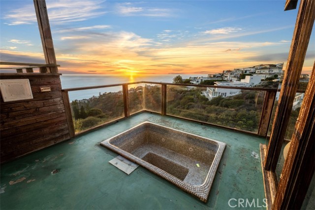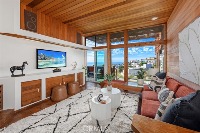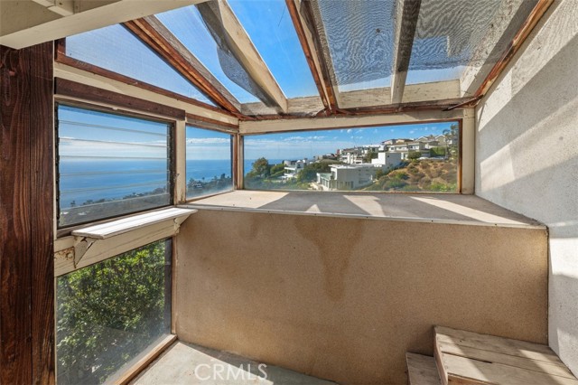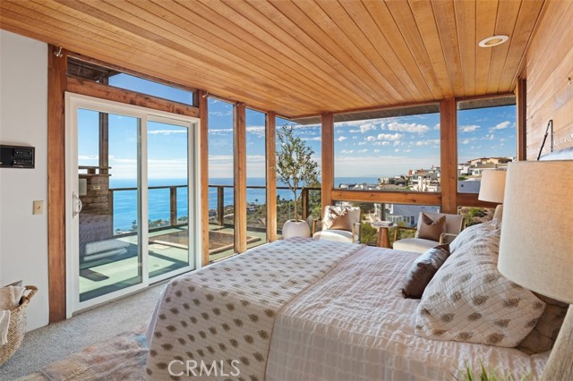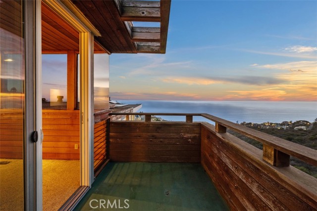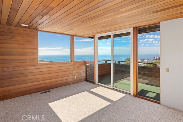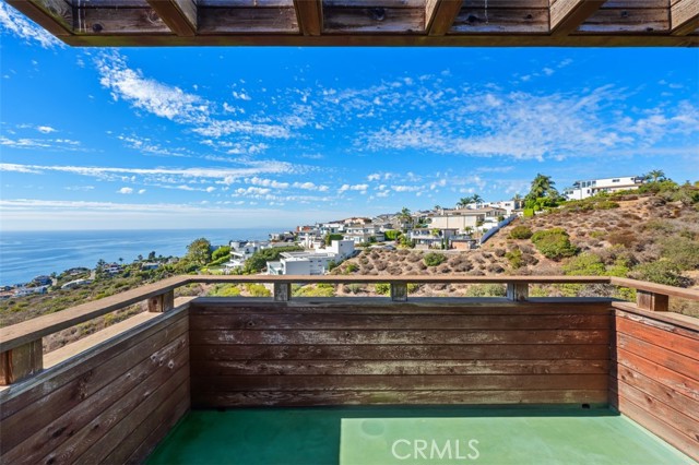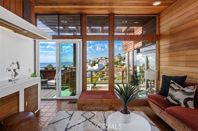 Perched atop Balboa Avenue, just steps from Moulton Meadows Park, this 1977 mid-century residence offers panoramic views of the Pacific Ocean, canyon, and coastline. Designed by award-winning architect Blair Ballard, recognized by the Laguna Beach Architectural Guild for excellence in residential design, this home reflects Frank Lloyd Wright’s organic architecture philosophy of blending structure and setting in harmony. Its multi-level layout features cedar plank walls and ceilings, expansive glass, strong horizontal lines and a timeless mid-century modern aesthetic. Two exquisite handcrafted stained-glass installations by Mogens Abel, revered wood carver and longtime Festival of Arts exhibitor, are set in the entry and kitchen ceilings and beautifully infuse the space with color, artistry and Laguna’s creative spirit. The primary suite offers stunning ocean views through walls of windows and includes a walk-in closet and a step-down shower with a full-length view window. Sliding glass doors open to the deck with a sunken jacuzzi for enjoying the spectacular sunset views over Victoria Beach. Two additional bedrooms off the main entrance hallway are ideal for a home office or guest room. Both the family room and upper-level den offer captivating ocean views and refreshing coastal breezes. The side yard patio opens to a trellis covered potting shed and leads down the hill to an ocean-facing greenhouse. While the home requires some restoration, it is solidly constructed and full of character, including the original built-in seating, hardware and cabinetry. Don’t miss this rare opportunity to personalize and revive a living piece of Laguna Beach’s celebrated art culture and architectural legacy.