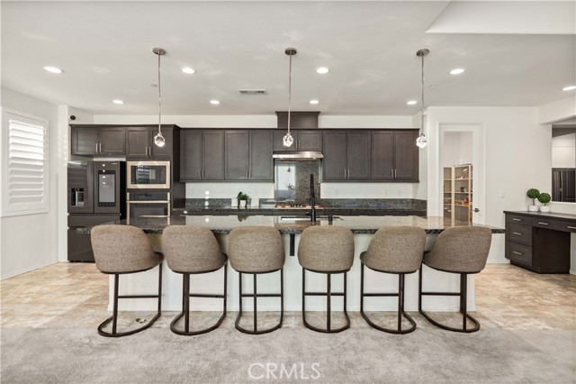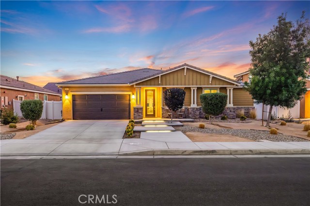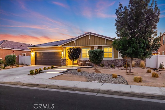 This beautiful 4 bedroom, 4 bathroom single story home offers PAID OFF SOLAR, over 3,000 sqft of living space, and sits on a spacious 7,851 sqft lot in a clean, newer community with no HOA! Built in 2021, this property combines desert modern design with top-of-the-line smart home features and energy efficient upgrades throughout. As you pull up, you're welcomed with gorgeous curb appeal featuring a stone-accented exterior, beautiful drought-tolerant landscaping, an elegant custom front door, and custom-lit concrete stairs that lead you right to the entry. There's also a cozy seating area in the front yard, perfect for enjoying your morning coffee while taking in the peaceful sunrise. Inside, you're greeted with high ceilings, large windows that allow an abundance of natural lighting, and a bright, open floor plan that flows perfectly from the kitchen to the family room, perfect for entertaining guests! The kitchen features granite countertops, stainless steel appliances, a large island with bar seating, beautiful pendant lighting, a walk-in pantry, and shaker cabinets with plenty of storage. The spacious family room is complete with a sleek gas fireplace, built-in Sonos ceiling speakers, and smart blinds that work with the smart home system. Just off the kitchen, you'll find a large formal dining area that's currently being used differently, but offers plenty of room for a full dining setup and is equipped with smart blinds as well. All four bedrooms are generously sized and each offers either a private or nearby bathroom, plus walk-in closets! The primary suite is tucked away for extra privacy and includes a spa-like bathroom with dual sinks, a soaking tub, and a large walk-in closet. Tech lovers will appreciate the fully integrated Control4 + Josh.AI smart home system, CAT6 wiring, fiber internet, smart blinds, energy efficient double pane windows, tankless water heater, and best of all; owned, paid-off solar! The backyard is ready for your dream setup,Whether you envision a lot pool, outdoor kitchen, or relaxing garden. This home is walking distance to Marie Kerr Park, where you can enjoy summer concerts and watch the 4th of July fireworks show right from your yard! Close to Rancho Vista Golf Course, Antelope Valley Mall, shopping centers, restaurants, schools and Freeway for easy commuting.
