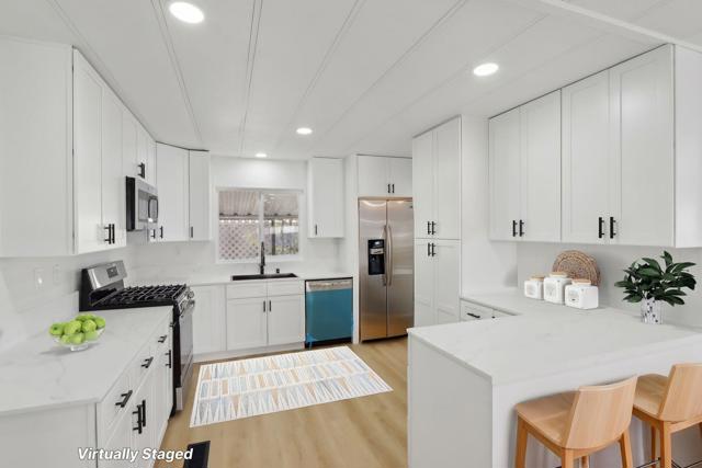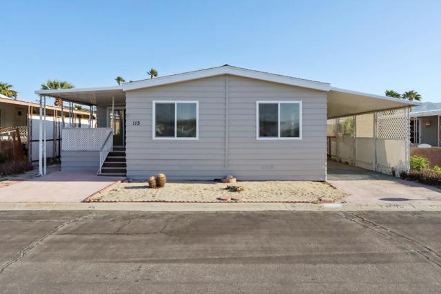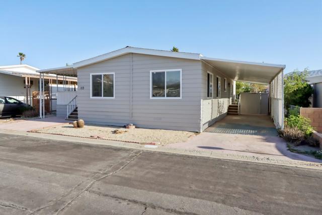 COMPLETE INTERIOR REMODEL! This beautifully reimagined home blends modern upgrades with open, comfortable living. The expanded kitchen and vaulted ceilings create a bright, airy feel that connects seamlessly to the family and dining rooms, perfect for both daily living and entertaining. Luxury vinyl flooring, quartz countertops, stainless steel appliances, energy-efficient windows, and recessed lighting are found throughout. From the living room and raised front porch, enjoy sweeping Southwestern mountain views. The chef's kitchen flows to a spacious family room with slider access to the front patio, while the dining room offers built-in cabinetry for added storage and display. The primary suite features a spa-inspired bath with shower stall, free-standing soaking tub, and generous vanity space. The laundry room is designed for convenience with a sink and extensive cupboard storage. Sky's Haven is one of Desert Hot Springs' premier 55+ gated communities, featuring three pools, spa, clubhouse, fitness center, sauna, billiards, and park area, along with a full calendar of social and recreational activities. Best of all, you OWN THE LAND with low HOA dues, and all utilities are billed through the HOA. Ideally located just 15 minutes from Palm Springs and 20 minutes from Morongo Casino Resort & Spa in Cabazon, this home offers both comfort and lifestyle in a highly desirable setting.