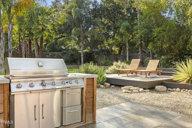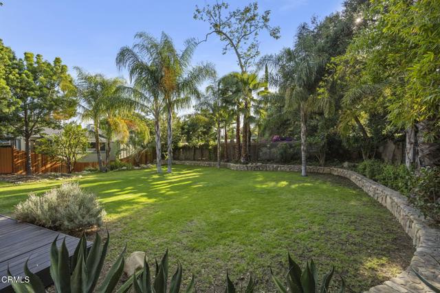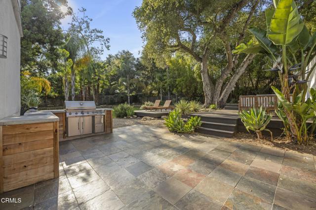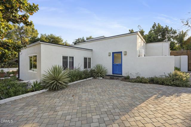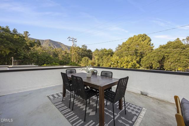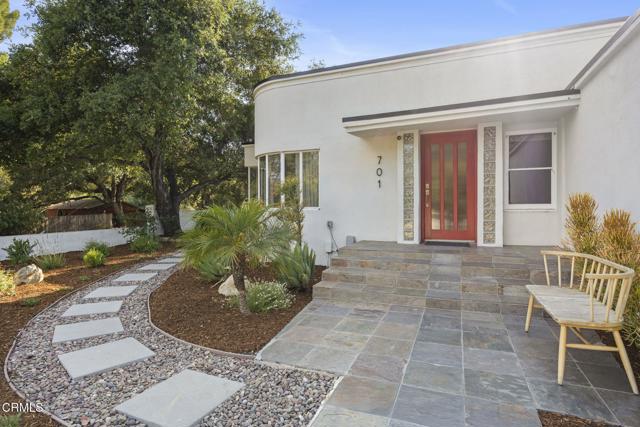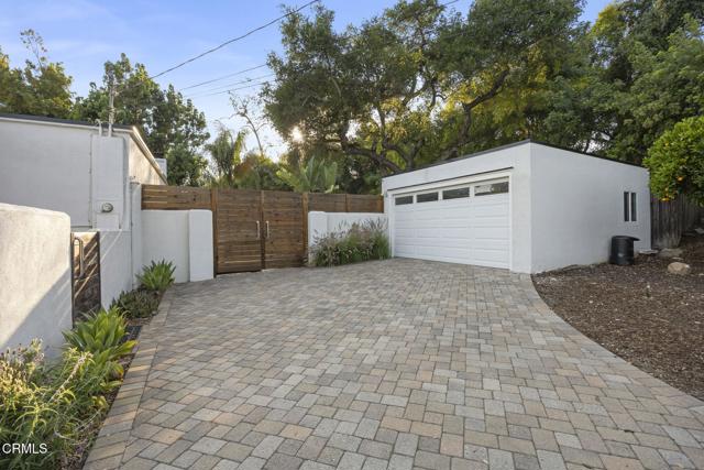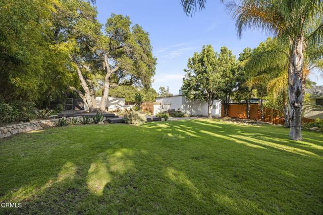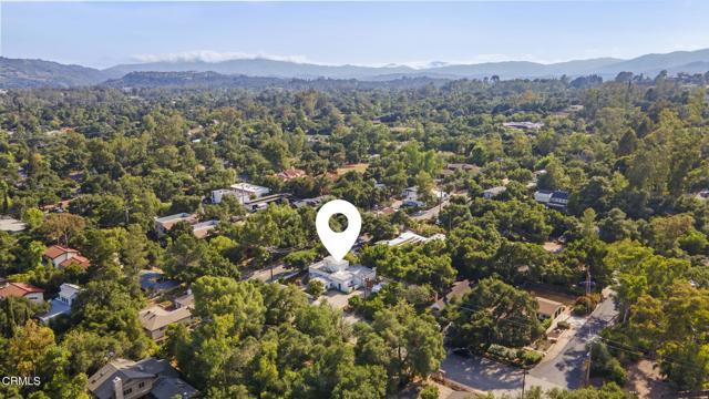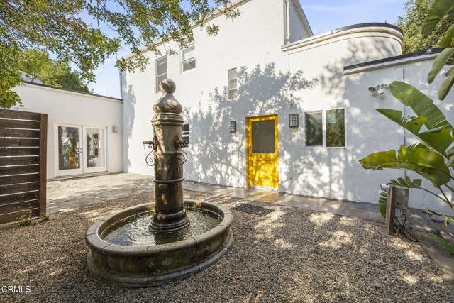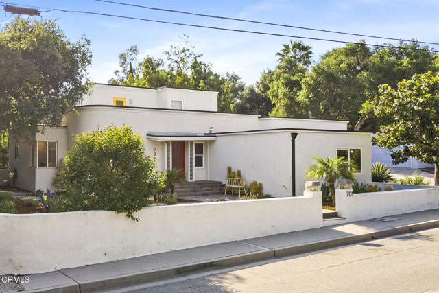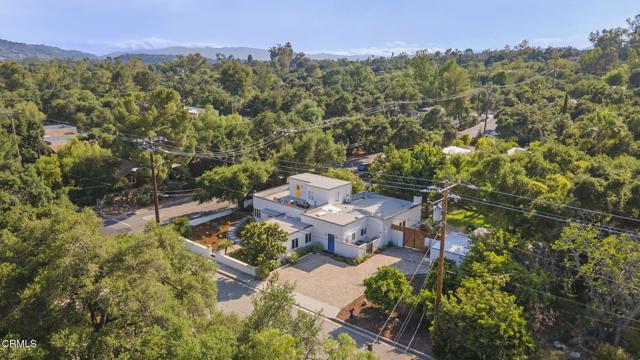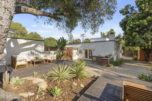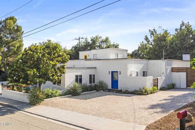 With an enviable location at the upper end of Canada St just blocks from downtown Ojai, this one of a kind 4 bedroom 4 bath Art Deco home features curved lines with a Mid Century feel. Upon entering you are greeted with ample windows allowing natural light to filter in. A gourmet kitchen opens up to the generous living room and dining room area equipped with a cozy fireplace and french doors leading out to the spacious backyard. Upstairs you will find a separate guest wing with its own private rooftop patio to enjoy the mountain views. Situated on .38 acres with decks for lounging, fruit trees, a fountain and mature landscaping. Additional features include a detached 2 car garage and an outdoor BBQ area. A true retreat in the heart of Ojai!