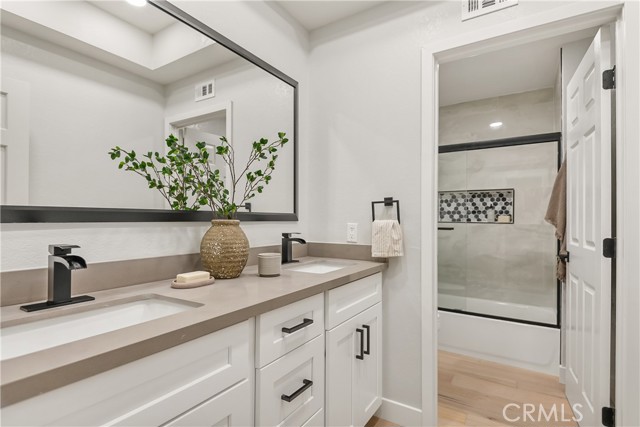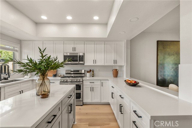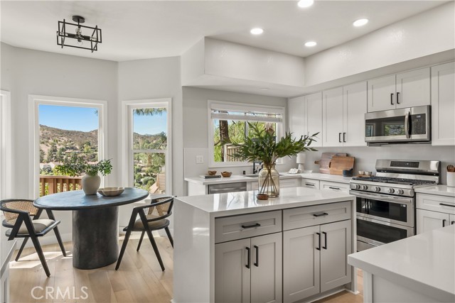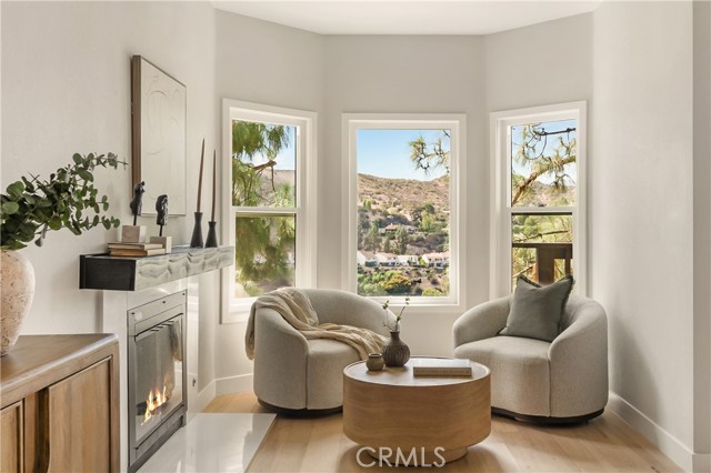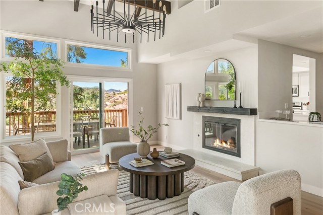 Welcome to the coveted gated community of Westlake Pointe, where this brand-new, fully reimagined residence is framed by sweeping valley and mountain vistas. This end-unit townhome blends timeless modern opulence with enduring quality, featuring vaulted ceilings with exposed wood beams where natural light pours across every corner of living space. The vast, open family room is steps away from a designer kitchen featuring quartz countertops, a standalone island, stainless steel appliances, a wine bar, and a formal dining area ideal for gatherings. The lower level offers a private en-suite bedroom or office with mountain views and a hand-laid tile shower. Upstairs, the serene primary suite boasts vaulted ceilings, a spa-inspired bath with a soaking tub, walk-in shower, two expansive closets, fireplace, and breathtaking views. Two additional spacious bedrooms open to a private deck for relaxing outdoors. Every detail has been upgraded, including sealed solid wood Mandalay Hickory engineered hardwood flooring throughout, copper plumbing, brand-new HVAC, electrical, and windows, fully waterproofed patios, and a drip irrigation landscape system. This is simply more than a renovation; this home is a complete reinvention of luxury living in Westlake Pointe.