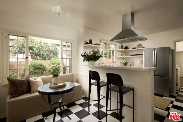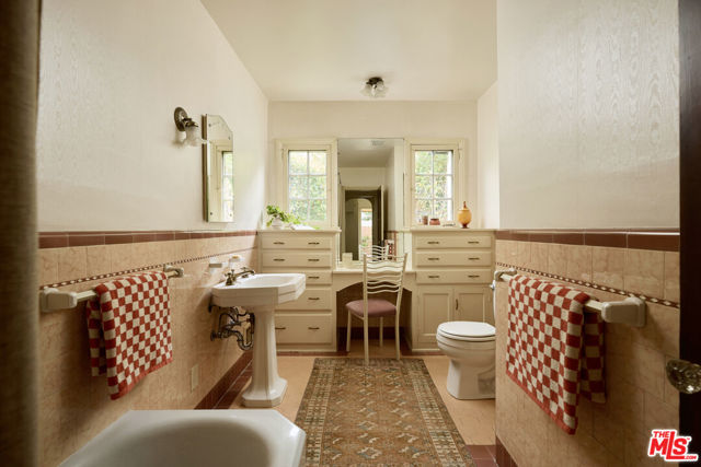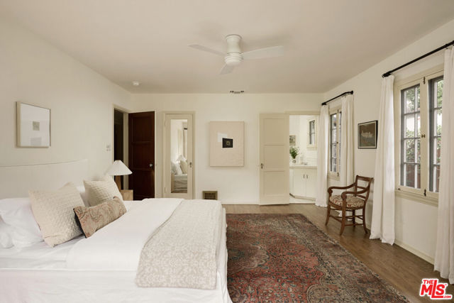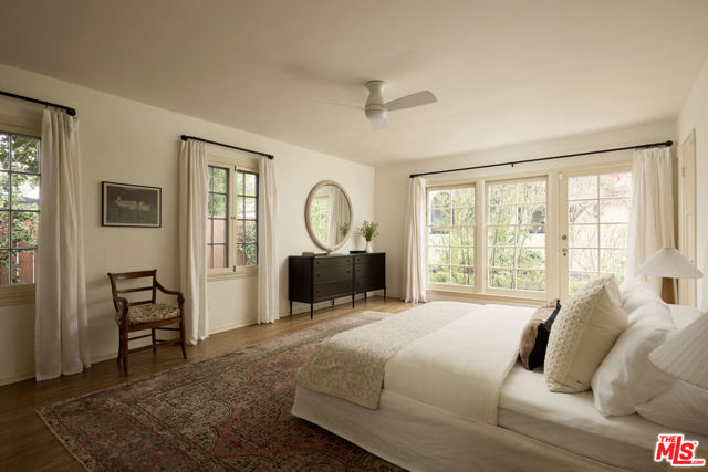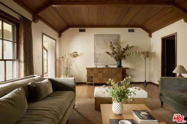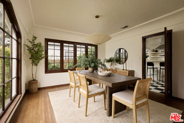 Set behind a classic picket fence and framed by lush landscaping, this 1932 English Tudor radiates timeless character. A brick walkway guides you to the entry, where the interiors reveal a spacious living room filled with natural light. Original architectural details shine here, including a striking wood-paneled ceiling, vintage windows, and a fireplace accented by period lighting. The dining room is anchored by a dramatic arched window and connects to the eat-in kitchen with breakfast bar. Upstairs, a versatile bonus room offers the perfect retreat for work, play, or relaxation. The home provides three bedrooms and three bathrooms, two of which feature private en suite layouts. Outdoors, the whimsical grounds are designed for both beauty and leisure, with a pergola-shaded patio, a stone fountain, and mature fruit trees creating a serene setting. Completing the property is a detached garage draped in bougainvillea - ideal as a studio, office, or guest space. Recent updates include a new roof, HVAC, updated electrical, new insulation, tankless water heater, upgraded sewer line, electric car charger, and more. Adding to the home's character, a hidden wine cellar lies beneath the kitchen, completing this rare 2,000+ sq ft offering in Pasadena's cultural heart.