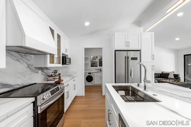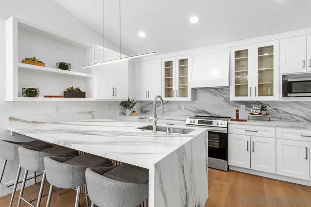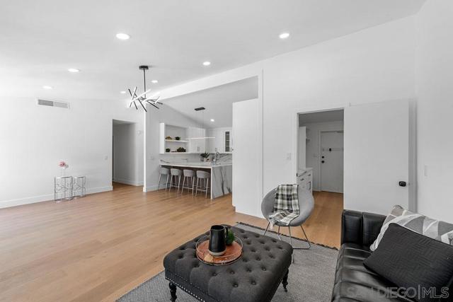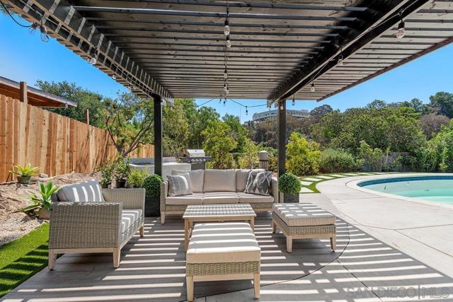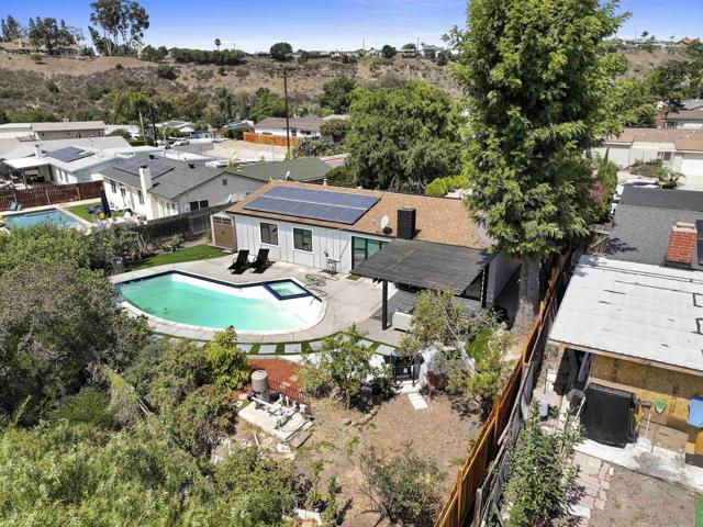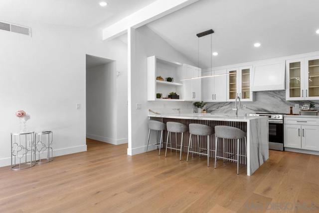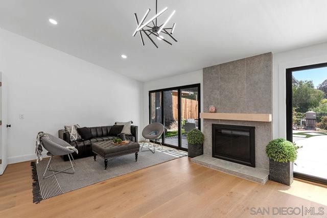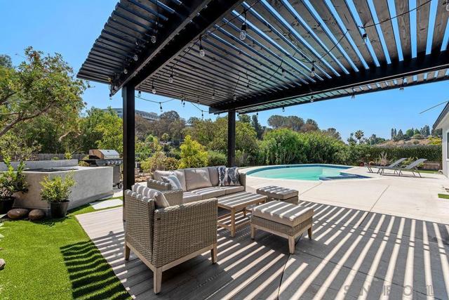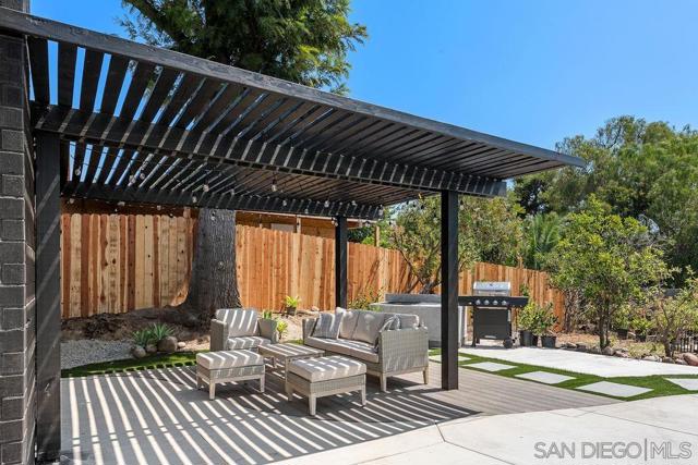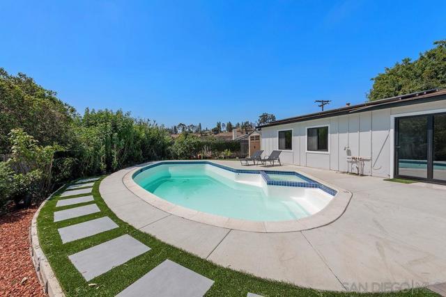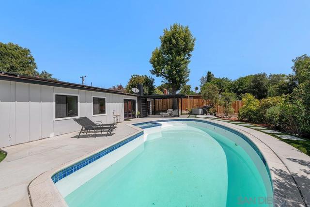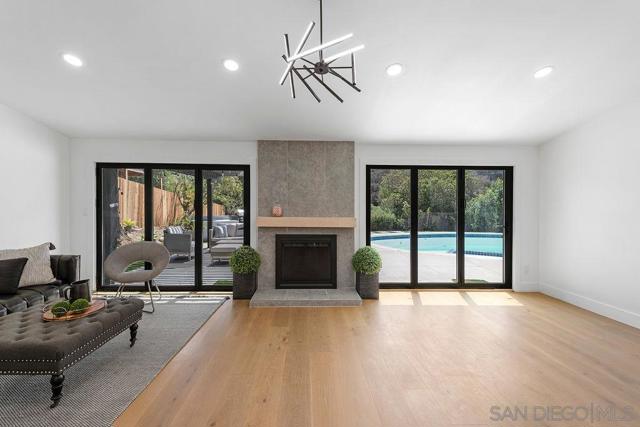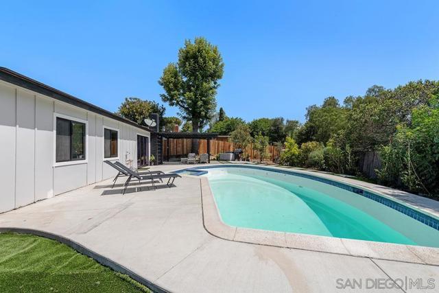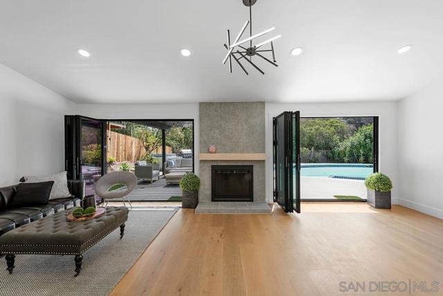 This thoughtfully updated 3-bedroom, 2-bath residence in the heart of Clairemont has been completely reimagined with high-end upgrades, modern finishes, and custom craftsmanship. Ideally located near Mesa College, it offers the perfect balance of style, comfort, and convenience. The spacious open-concept kitchen and living area extend effortlessly to the outdoors through dramatic accordion-style glass doors, capturing the essence of Southern California indoor-outdoor living. The chef’s kitchen showcases quartz countertops, a large island, premium stainless steel appliances and custom cabinetry. A bright, inviting living room with a cozy wood-burning fireplace provides the ideal space for both relaxation and entertaining. Elegant engineered wood flooring, a brand-new washer and dryer, and central air add to the home’s comfort and appeal. Step outside to a private backyard retreat featuring a sparkling pool and spa, an outdoor dining pavilion with built-in BBQ, lush landscaping with mature fruit trees, and sweeping canyon views. A spacious covered patio and energy-efficient solar system complete this exceptional property.