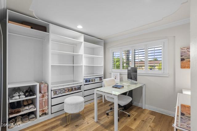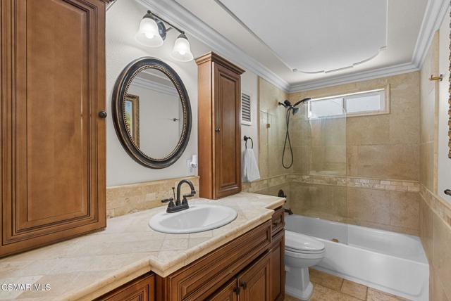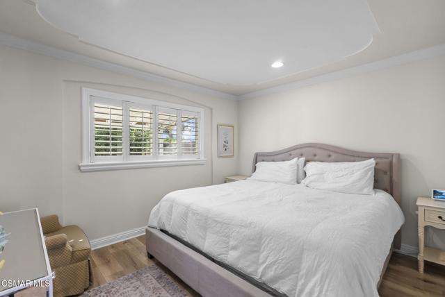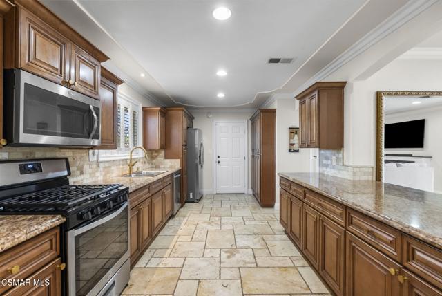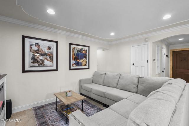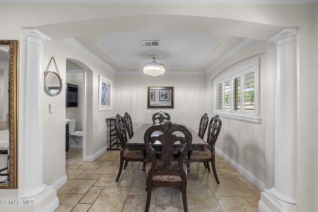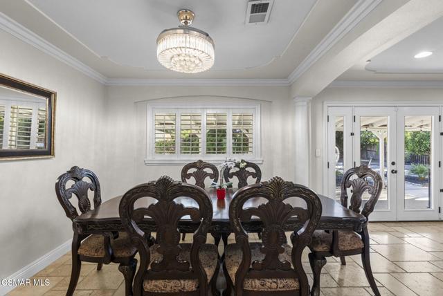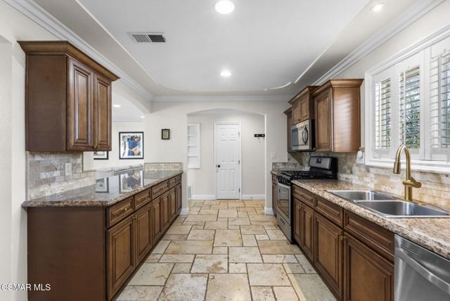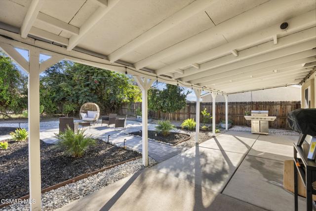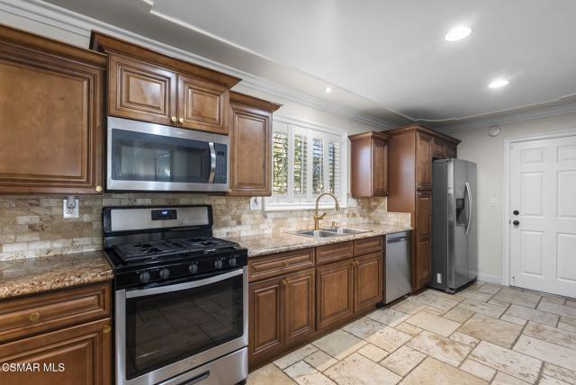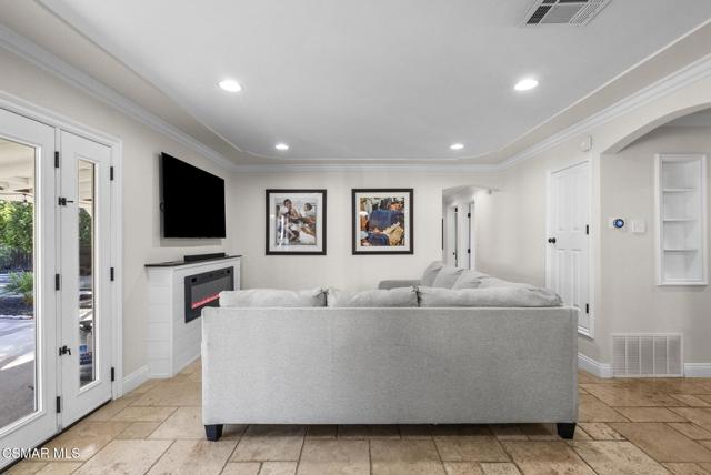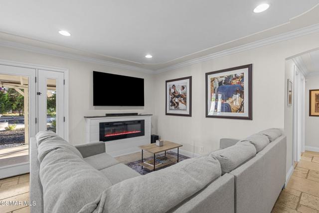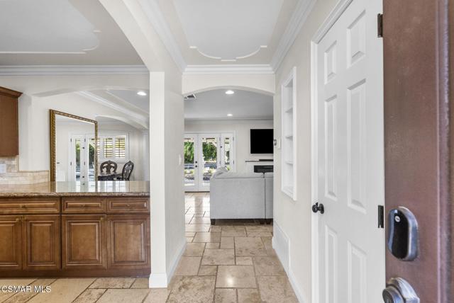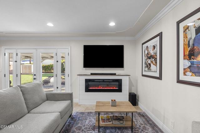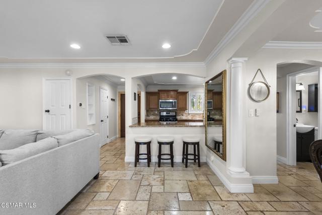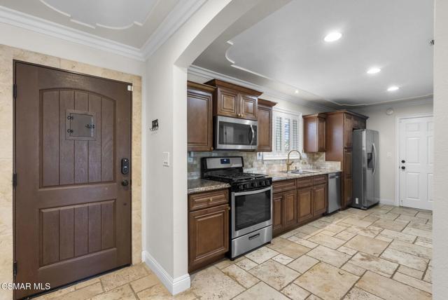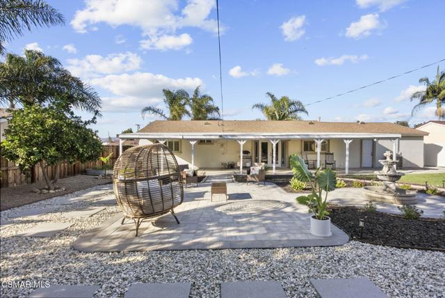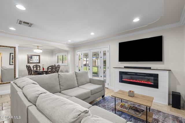 This stunning home offers a seamless open layout and an expansive backyard, perfect for both entertaining and everyday relaxation. From the moment you arrive, the curb appeal shines with elegant plaster finishes and lush mature landscaping.Step inside to an inviting open floor plan with custom French doors leading to a serene backyard retreat featuring a covered patio, fruit trees, and a garden. With ample space for an ADU or pool, the possibilities are endless.The chef's kitchen is equipped with espresso custom cabinetry, granite countertops, stainless steel appliances, and a stylish pass-through bar top--ideal for casual dining or buffet-style entertaining.Throughout the home, you'll find luxurious touches: Travertine Versailles flooring, crown molding, recessed lighting, custom doors, and a cozy fireplace. Both bathrooms have been tastefully remodeled with Travertine finishes, dual sink in hallway bath,, and custom cabinetry. Bedrooms feature newer laminate flooring and generous closet space.This flexible floor plan can easily be converted back to a four-bedroom with a second full bath. With smart-home technology and turnkey upgrades throughout, this property is move-in ready and designed for modern living.