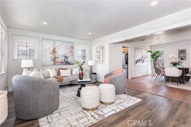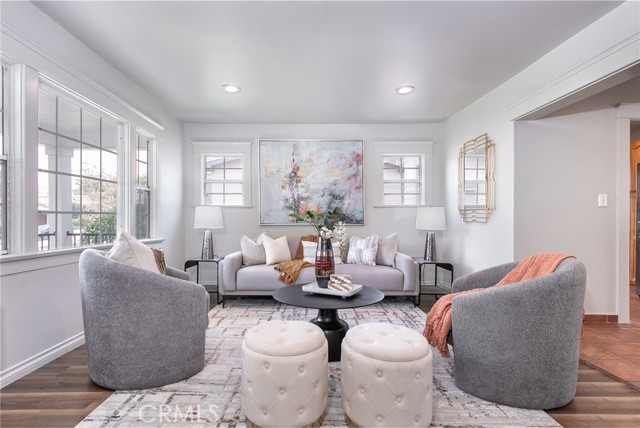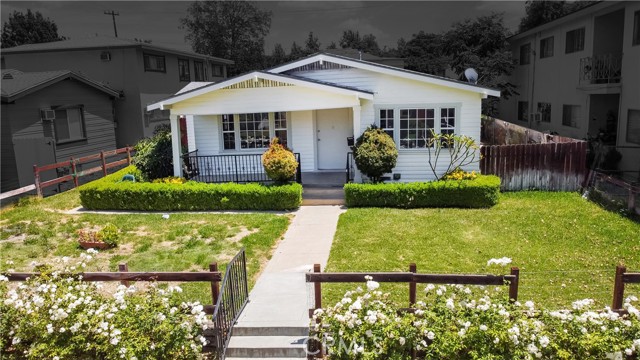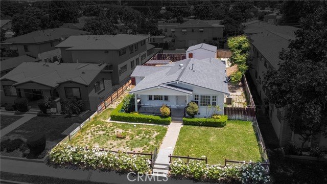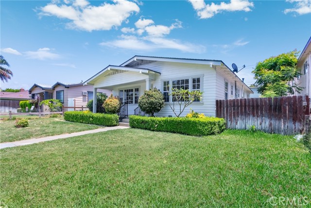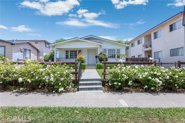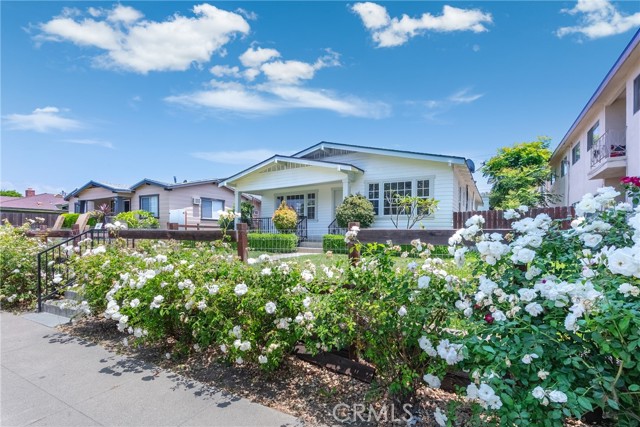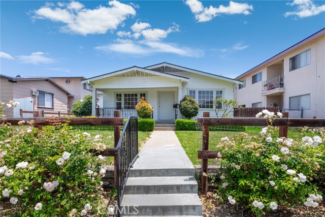 This Craftsman-style home sits in the heart of Uptown Whittier—just minutes from local colleges, shops, cafes, parks, and farmers’ market. The white rose-lined front yard, classic picket fence, and elevated lawn create a timeless first impression, while the spacious covered porch offers a cozy place to relax and enjoy the neighborhood’s charm. The living room features laminate flooring, recessed lighting, and large windows that bring in abundant natural light. It flows into a tiled dining area with backyard views and plenty of space for gatherings. The kitchen offers tiled countertops, ample cabinetry, and convenient access to the laundry area. All three bedrooms include wood flooring, ceiling fans, and built-in closets. The full bathroom features a tiled tub/shower combo. Recent updates include fresh interior paint, large window casings, an upgraded A/C system, newer water heater, and sprinkler systems. The backyard is ideal for outdoor living, with a pergola-covered patio, mature trees, and open space for gardening, recreation, or future landscaping. A detached rear structure offers additional storage or creative use. Rear alley access and an extra parking spot beside the garage provide added convenience. Zoned R3 (buyer to verify), the lot offers excellent potential for an ADU, additional units, or long-term investment. Combining original charm, thoughtful upgrades, and future possibilities, this home is a rare opportunity in one of Whittier’s most desirable neighborhoods.