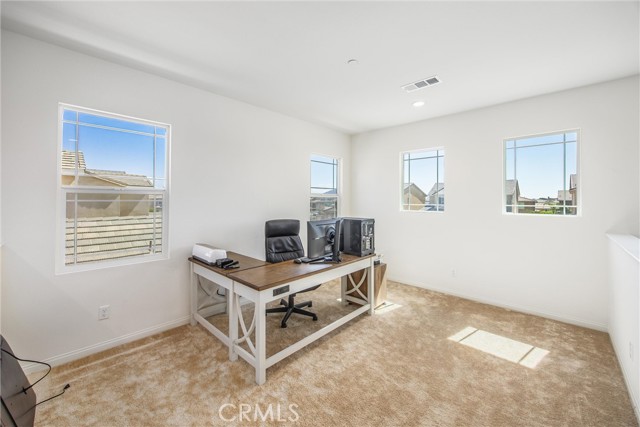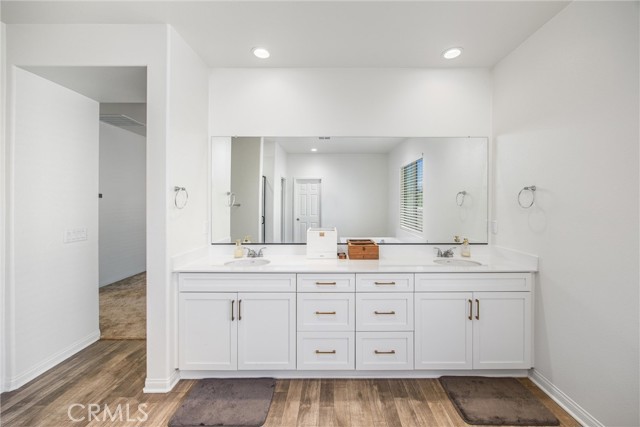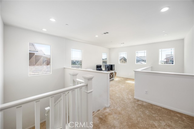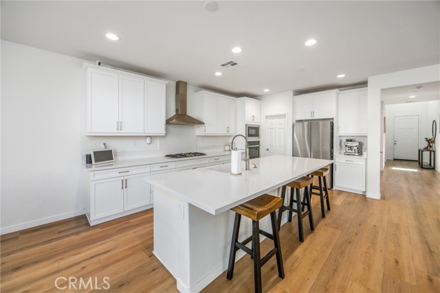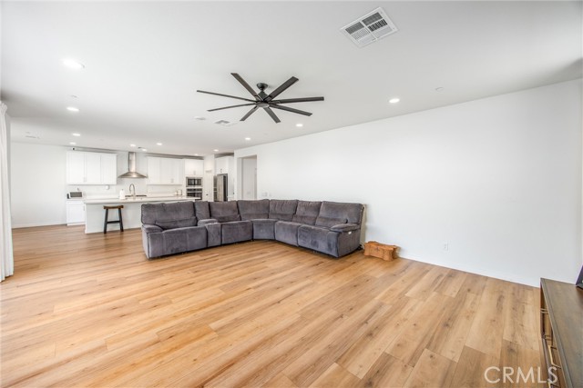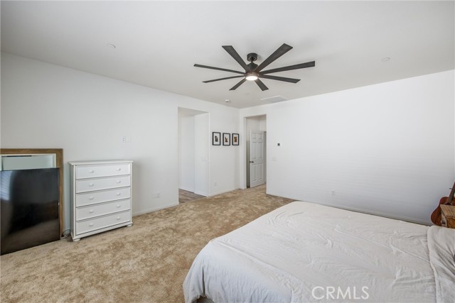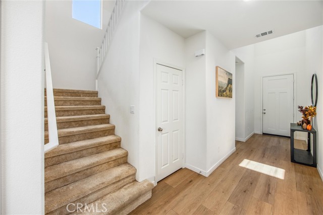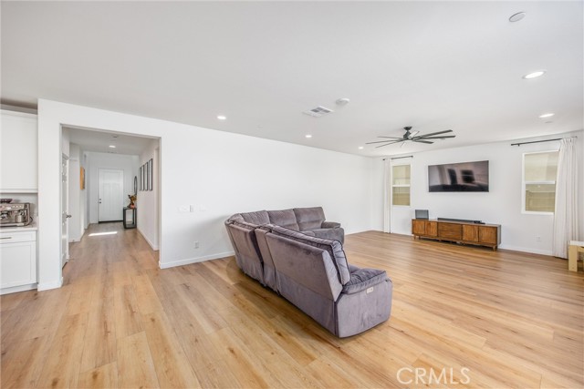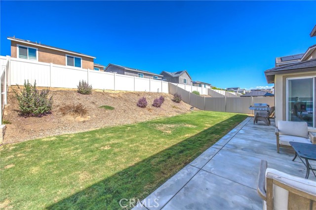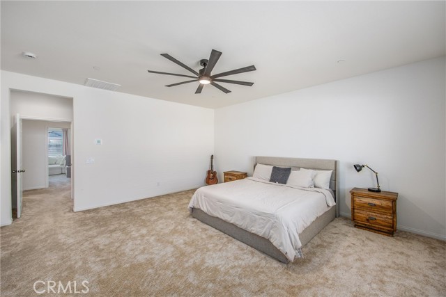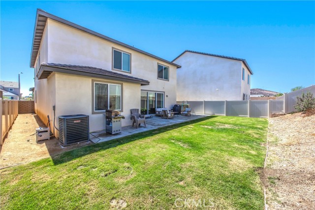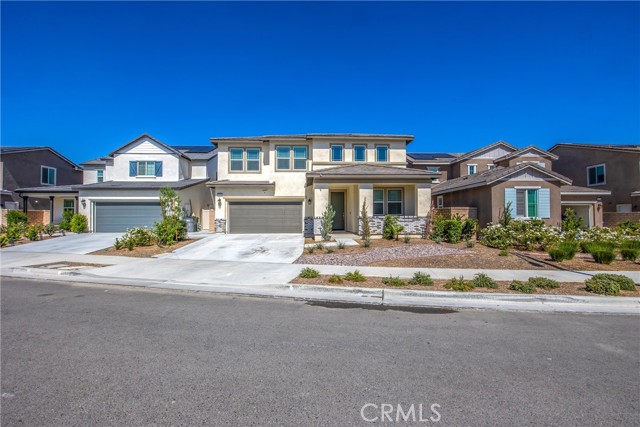 Welcome to 30542 Gonsalez, a beautifully upgraded home located in the highly sought-after Braverde community of Menifee. This spacious 5-bedroom, 4-bathroom residence offers 2,935 square feet of thoughtfully designed living space on a generous 6,050 square foot lot, combining modern luxury with practical function to support your indoor-outdoor lifestyle. This home showcases a number of major builder upgrades, including PAID-OFF SOLAR, an extended living room with a triple-panel sliding glass door, and elegant maple-painted shaker cabinetry throughout the kitchen and bathrooms. The chef-inspired kitchen features quartz countertops, a quartz undermount sink, and is pre-wired for two pendant lights over the island, as well as a dining chandelier and entryway chandelier. All bedrooms are prewired for ceiling fans, offering comfort and efficiency throughout. The open-concept main level is enhanced with luxury vinyl plank flooring, upgraded baseboards, and an abundance of natural light that flows seamlessly through the expansive living and dining areas. The home features a main-level master suite, offering a private retreat complete with its own spa-like ensuite bathroom—ideal for multigenerational living or added privacy. A separate guest bathroom is also located downstairs for added convenience. Upstairs, you’ll find an oversized loft, perfect as an additional living space, game room, home office, etc. — plus three additional bedrooms and a full laundry room with custom cabinetry. The home also includes an oversized garage, offering plenty of room for extra storage, a home gym setup, or even a golf cart. Outdoor upgrades made after closing further elevate the property’s appeal. Enjoy extended driveway space, a fully finished concrete patio and side yard, a custom irrigation and drainage system, and a lush backyard lawn—all designed for low-maintenance living and year-round enjoyment. A gas line is already run to the back patio, ready for your future BBQ or outdoor kitchen setup. With energy-efficient features like a tankless water heater and fully paid-off solar system, this home is built for comfort, efficiency, and long-term savings. This home offers a family-friendly setting with easy access to top-rated schools, outdoor recreation, and vibrant community events—all within walking distance. Don’t miss your opportunity to own a thoughtfully upgraded, move-in ready home in one of Menifee’s premier communities.