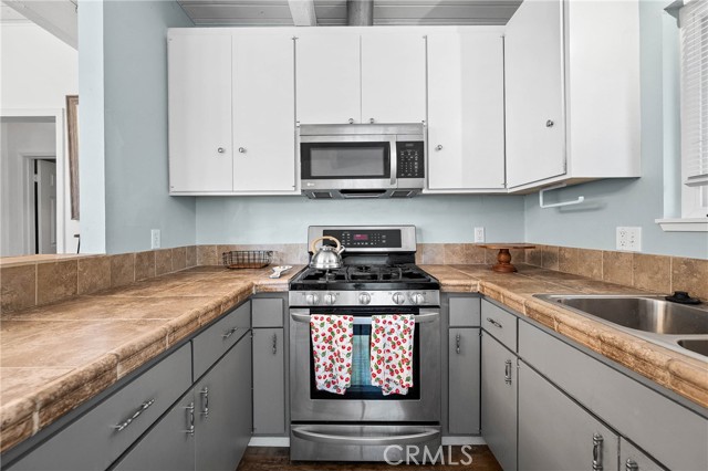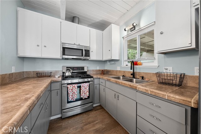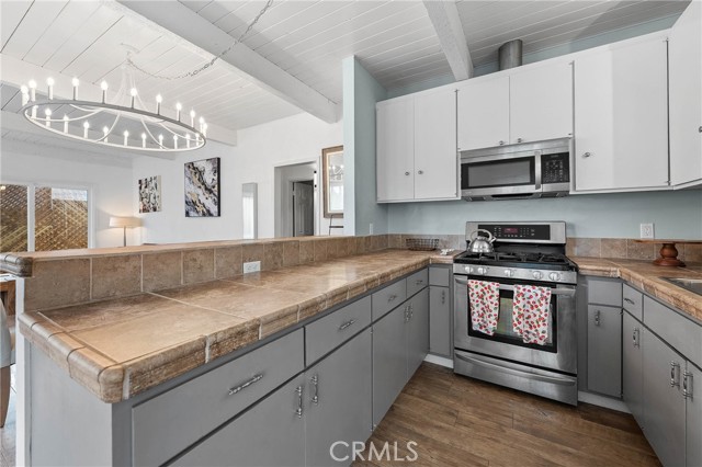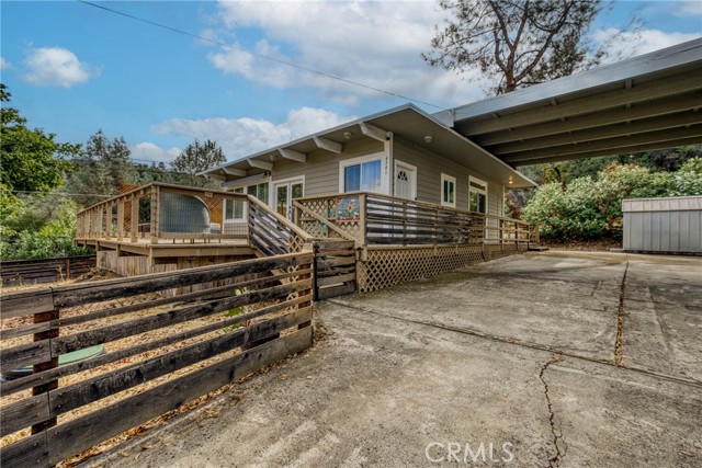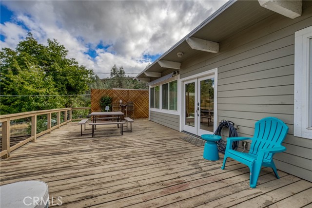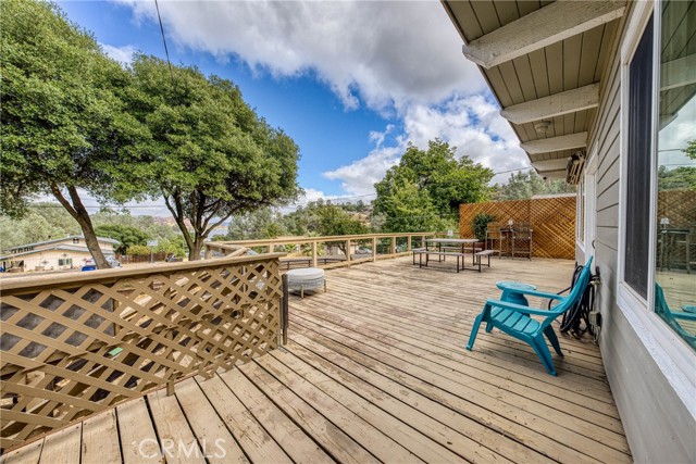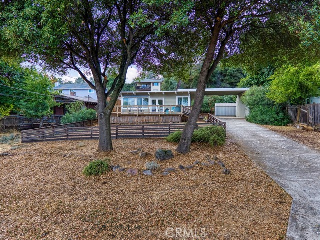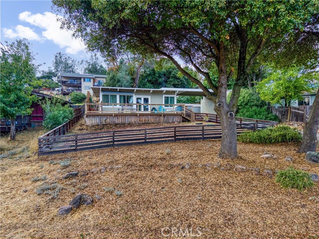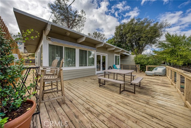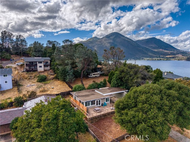 This charming modernized single-level mid-century style lake view home that has been recently upgraded to reflect modern styling. The home features new windows and French doors, laminate flooring throughout, and a light-filled great room with exposed beams and doors that open to a large front deck overlooking the lake. The modern kitchen is equipped with bar counter seating and tile countertops. The stainless steel appliances include a propane range, microwave hood, and refrigerator. The integrated dining room is elevated by a modern chandelier and is located off the French doors that lead to the wrap-around style deck, perfect for entertaining and barbecues. The residence includes two bedrooms that offer slider doors to the wrap around style deck, the rooms are full of natural light. The bathroom was updated with a walk in tiled shower, wainscoting and a single furniture style vanity. Outside, you will find an attached carport with built-in storage, a laundry room and a long, flat driveway that accommodates many cars. The front yard is fenced and is graced by oak trees and nature sightings. Located in Kelseyville Riviera, the home is close to schools, shopping, and the lake. Enjoy country living in a centrally located community in Lake County, California, just 2.5 hours from San Francisco and 2 hours from Sacramento.