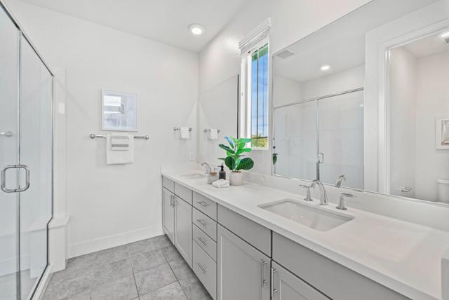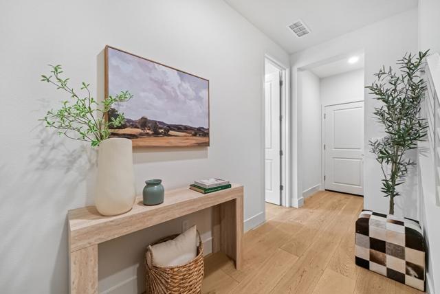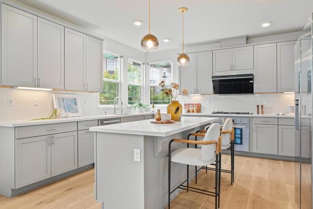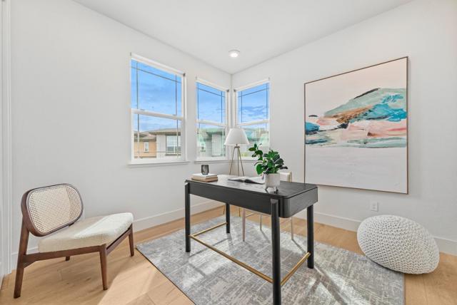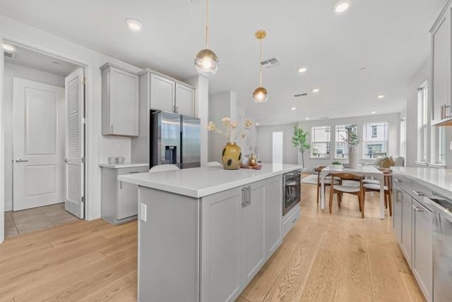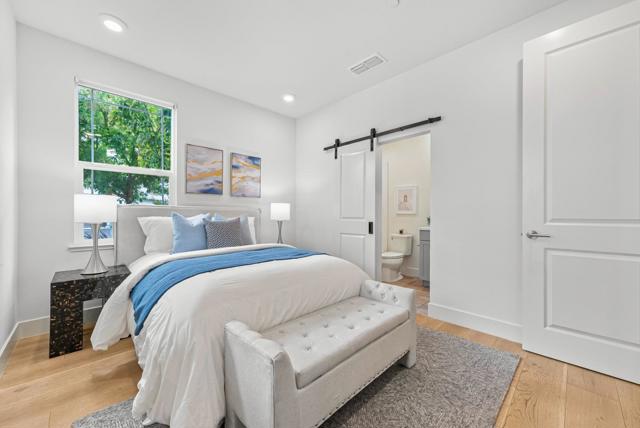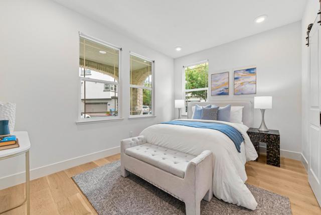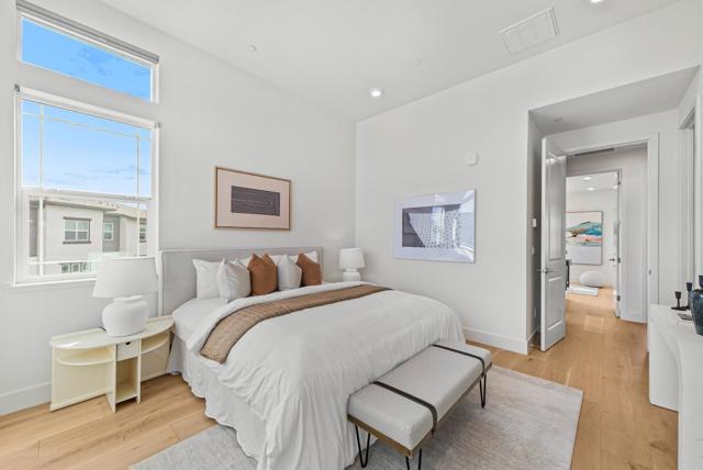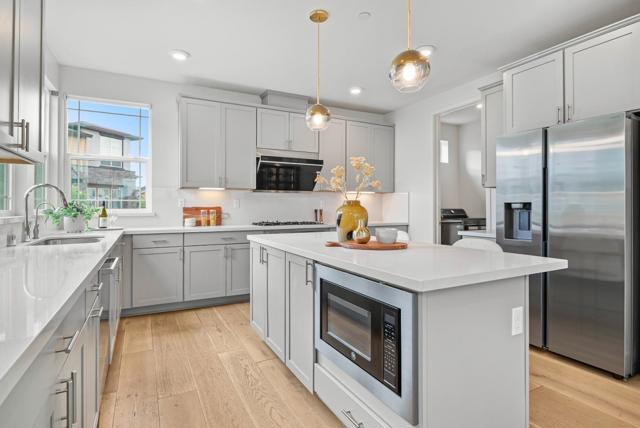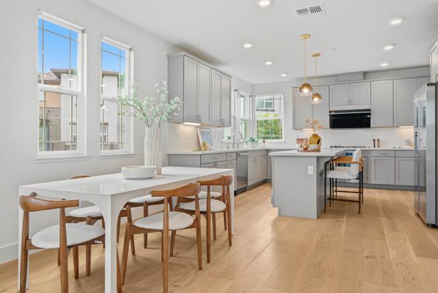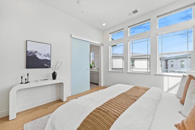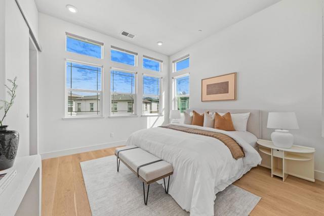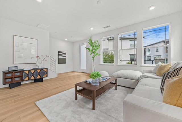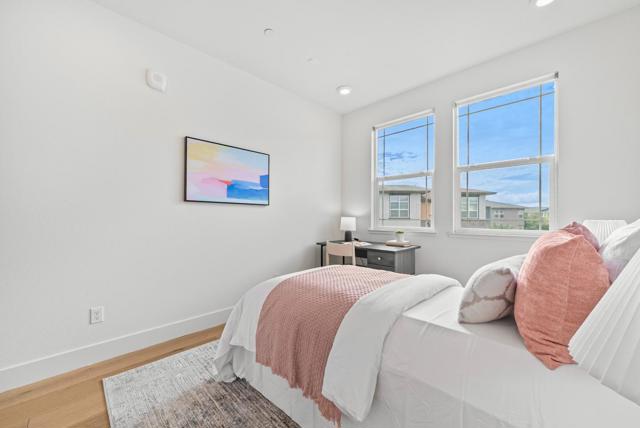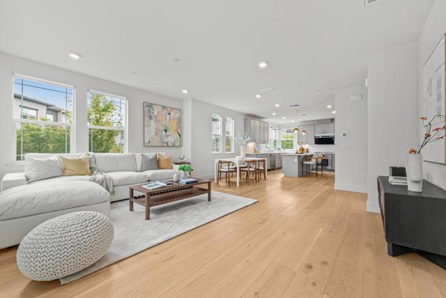 Located in the highly sought-after Nexus at the Vale community in the heart of Sunnyvale, this rare corner end-unit townhouse showcases 4 bedrooms and 3.5 baths across three thoughtfully designed levels. With a desirable southeast-facing orientation, the home is filled with abundant natural light. Built in 2018, the residence features two master suites. one conveniently located on the first floor for added flexibility, and another upstairs boasting soaring 11-foot ceilings and a custom walk-in closet. The second level presents an open-concept layout with a bright and spacious living room, complemented by a chefs kitchen with quartz and granite countertops, stainless steel appliances, a central island, an oversized walk-in pantry, and access to a generously sized private balcony and patio. Additional highlights include upgrades for a new refrigerator, engineered hardwood flooring, contemporary-style cabinet, EV charger pre-wiring, and smart home features, as well as an attached side-by-side 2-car garage. Enjoy community amenities like parks, playgrounds, and a clubhouse, all just minutes from major tech companies, Caltrain, Lawrence Expressway, HWY 101 and 237, shopping, dining, and more. This home perfectly blends modern luxury, comfort, and unbeatable location. Don't miss it!