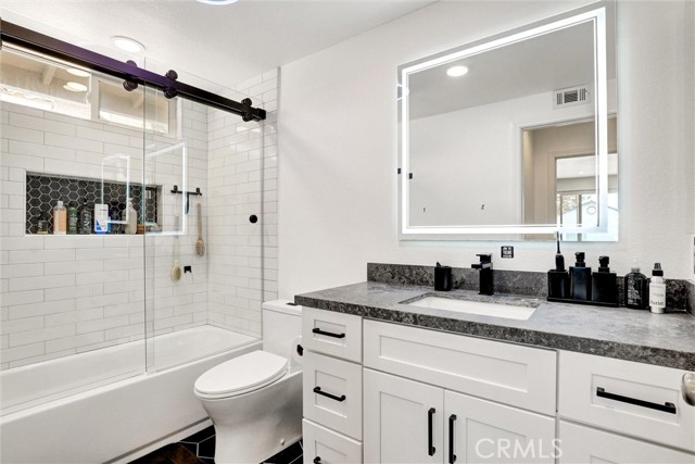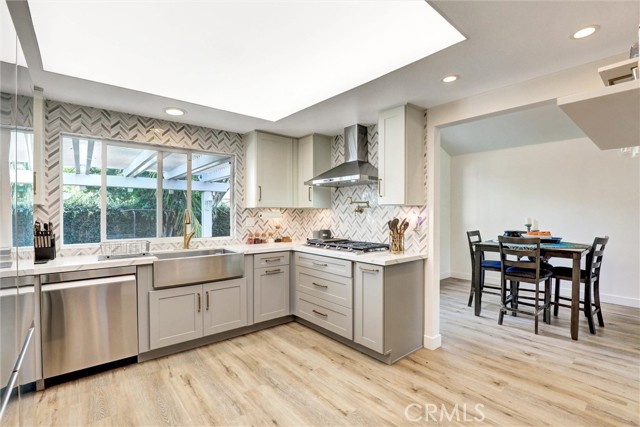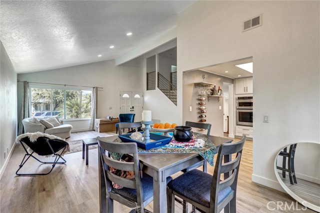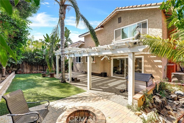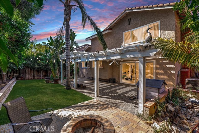 Must See - Located on a cul-de-sac in the Serrano Park community, this 4-bedroom, 3-bath, two-story home was remodeled in 2023 including the kitchen, flooring, plumbing, and electrical, and is move-in ready. The main level features a double-door entry, vaulted ceilings in the living and dining area, and a remodeled kitchen with quartz counters, gas stovetop with pot filler, and stainless-steel appliances (2023). Additional upgrades include a roof replacement in 2021, dual-paned windows, Nest thermostat, artificial turf in the front and back, updated furnace and refurbished AC approximately eight years ago, recessed lighting, insulated garage door with updated Wi-Fi motor, and leased solar panels to be assumed by the buyer. The first floor also includes a bedroom and full bath with shower, while the upstairs bathrooms come with lighted anti-fog mirrors, Bluetooth exhaust fans, and modern finishes. The backyard features turf and drought-friendly landscaping, a koi pond, Alumawood patio cover, paver firepit and conversation area, pebble tech slab, and raised planters. Serrano Park HOA amenities include two pools, four tennis courts, clubhouse, BBQ area, tot lot, and greenbelts with walking trails, with convenient access to nearby parks, shopping, dining, and schools.