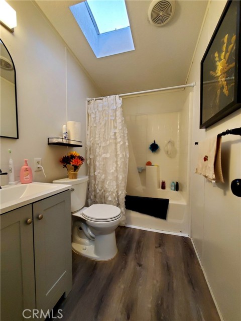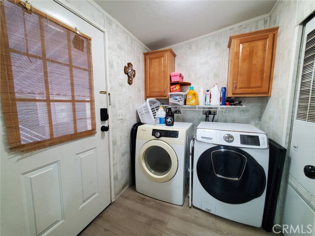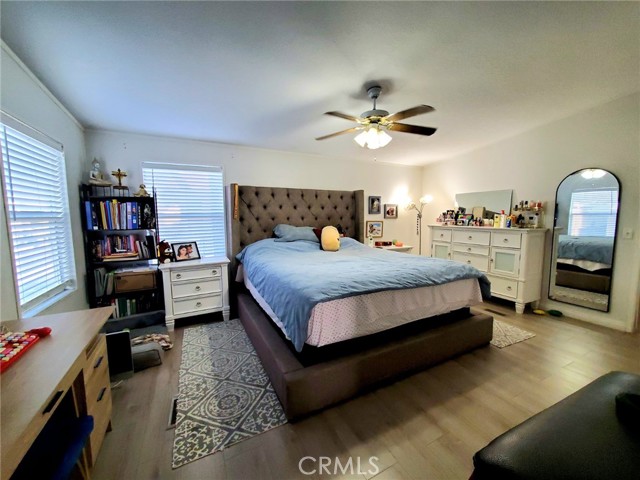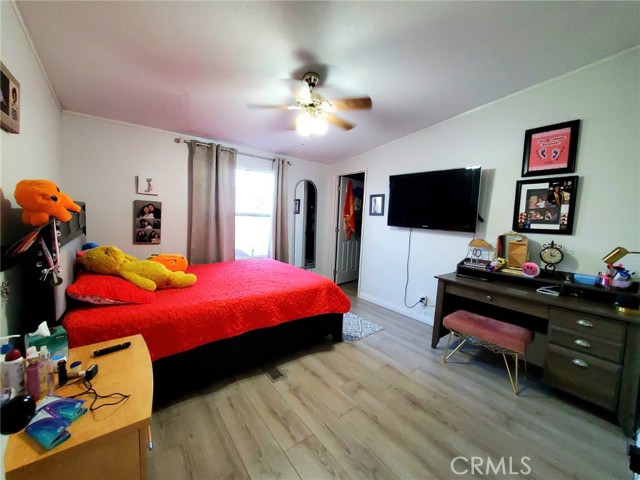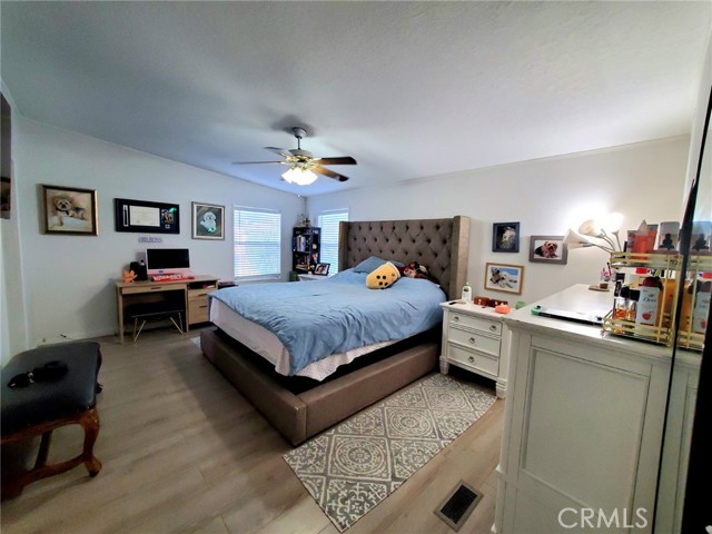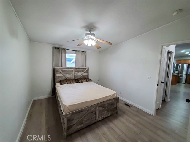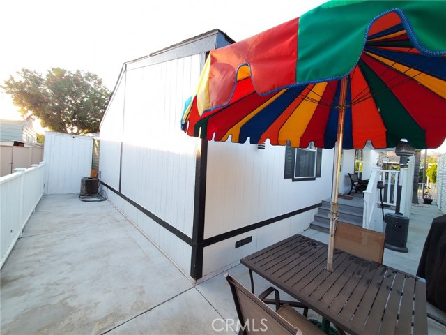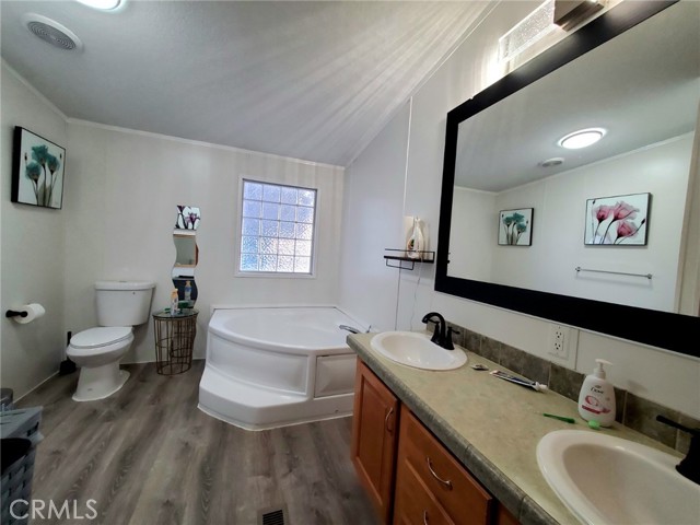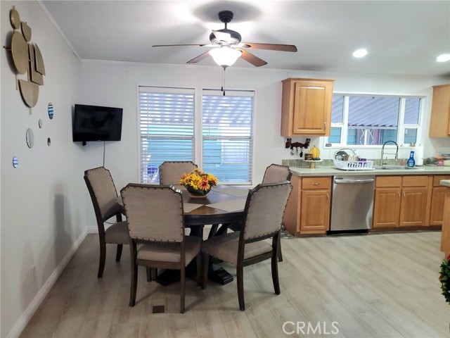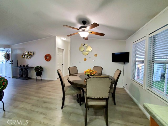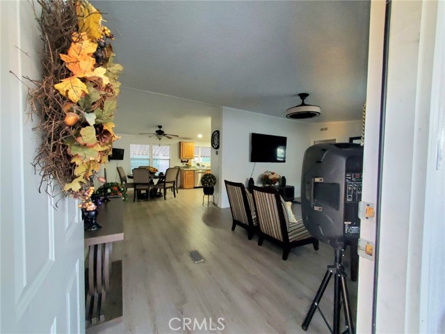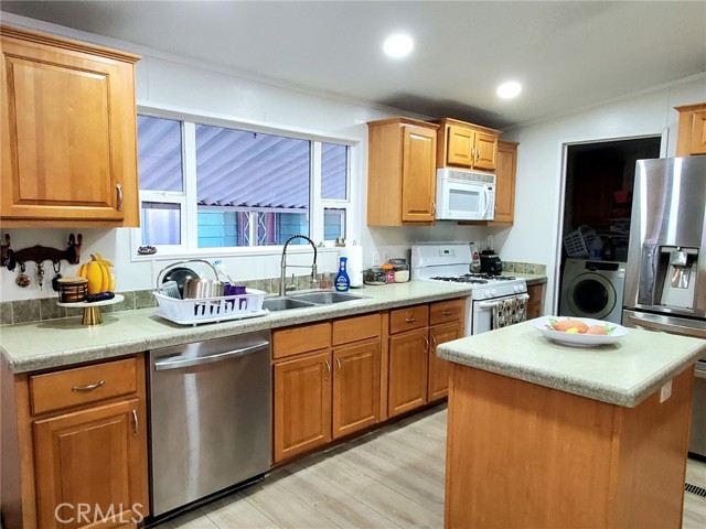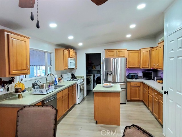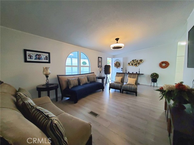 Welcome to this beautifully upgraded home in a family park! This home has many features including new laminate flooring throughout, new exterior paint, a concrete patio and fenced in yard. Upon entering the home you are invited into with a large living room which has a picture window and flows into the dining room. The dining room has a ceiling fan and is open to the kitchen. The kitchen features an island, a large pantry, tons of cabinets, stainless steel dishwasher and refrigerator along with a built in microwave. The laundry room is off the kitchen and leads to the carport, it has room a for side by side washer and dryer and has additional storage. The primary bedroom is in the front of the home and has a large closet and a private bathroom. The primary bathroom has a double vanity, garden tub and large walk in shower. The other two bedrooms are on the other the side of the home and both have walk in closets. The main bathroom has a skylight, shower/tub combination and large vanity. This home has a gated entry with a large front porch and cemented side and back yard for low maintenance. This home is turnkey and ready for its next owners, schedule your appointment today!