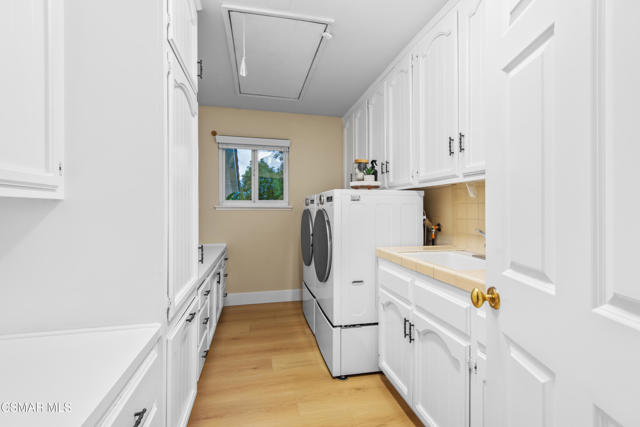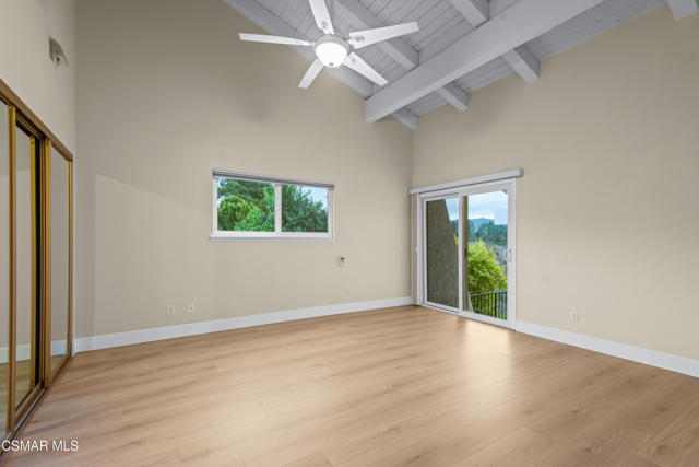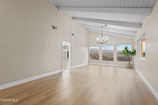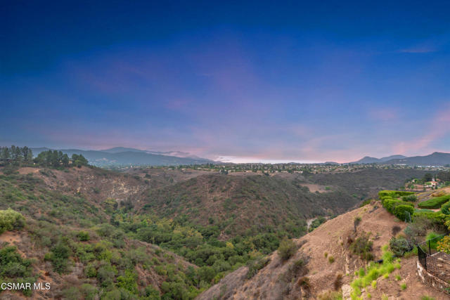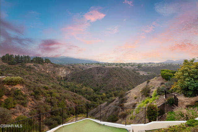 Ultimate Thousand Oaks View Estate ideally located at the end of a serene cul-de-sac in the heart of the Conejo Valley. This extraordinary Mediterranean retreat offers panoramic views of the Barranca and the Santa Monica Mountains, and it's surrounded by the scenic hiking trails of Wildwood. This approximately 4,000 sq. ft. estate features 4 bedrooms plus an office and 3 1/2 bathrooms. Step inside and be immediately greeted by vaulted beamed ceilings and walls of windows that frame dramatic views from nearly every room. The spacious living area is highlighted by a striking floor-to-ceiling rock fireplace, creating a warm focal point for gathering. The open concept floor plan flows seamlessly into the dining and entertaining spaces, with natural light pouring in from every angle. On the lower level there's a massive bonus/game room with its own breathtaking views, a perfect entertainment hub. The outdoor living has expansive jet lined views with patios, fire pit, professional landscaping, and a private putting green, all designed to maximize the home's hillside setting. This is a very special offering, a rare opportunity to own one of the most view-centric homes in Thousand Oaks, blending privacy, space, and unmatched access to nature in a way that is seldom available.