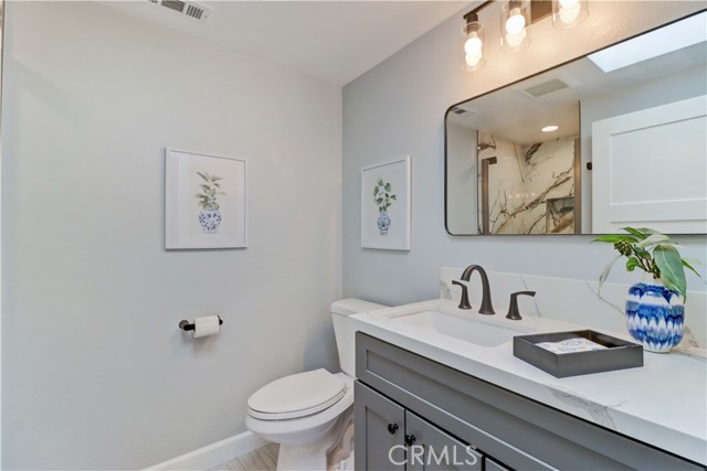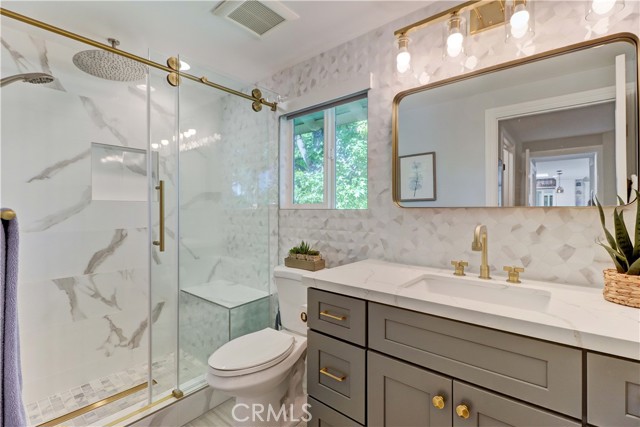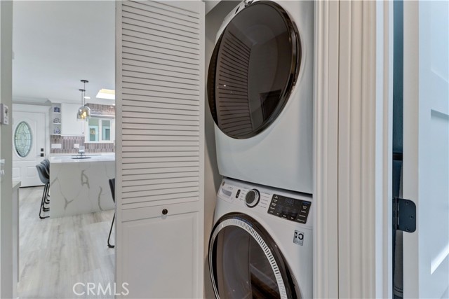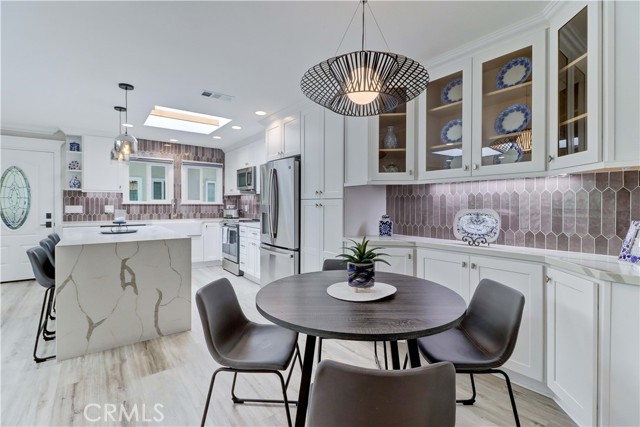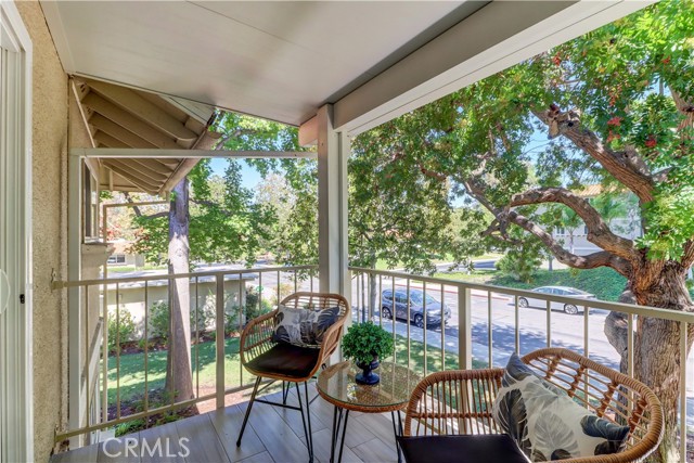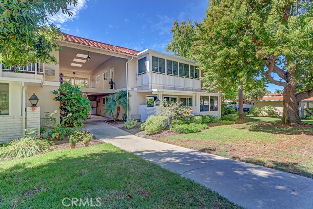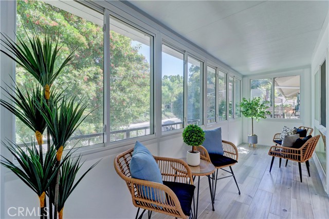 Gorgeous remodel + amazing Nob Hill location close to Aliso Creek! Fully remodeled in 2022 and lightly lived in since as part time home. "Casa Linda" floorplan - popular because there are NO STEPS but you still have an UPSTAIRS feel from the balcony - the best of both worlds! Prepare to be impressed by this beautiful home featuring a great room naturally lit by skylights with exposed wood trellis beams and chef's kitchen centered around the large Calcutta quartz waterfall island with pendant lighting. Expanded kitchen enjoys added cabinets into the dining area including upper cabinets with glass fronts for display plus pantry area. Cooking will be a joy in this space - stainless appliances, farmhouse sink, tile backsplash, cabinetry with soft close drawers and doors and abundant natural light. The focal point of the living room is an electric fireplace with tiled feature wall, built-in shelves and storage on each side. Living room also houses a large walk-in closet for additional storage space and front door with leaded glass insert provides a beautiful entry. Enclosed east-facing balcony allows for additional living space not included in the square footage including a small outdoor area also accessible from the guest bedroom and relaxing tree-filled view. Back inside, you'll love the central HVAC, recessed lighting, upgraded crown and base molding, smooth ceilings, bull-nose corners, vinyl plank flooring and dual pane windows with custom window coverings. Guest area enjoys a spa-inspired bathroom including dramatic tiled shower with glass door and both bedroom areas have recessed lights and stylish ceiling fans. Primary suite features reconfigured bathroom area behind the privacy door, large tiled shower, on-point vanity with gold fixtures plus an extra window. Enjoy walk-in closet in the primary bedroom and and organized closet space in the guest bedroom. Stack washer/dryer in hallway closet. Spectacular move-in ready home! EXPERIENCE THIS HOME IN THE WALK-THRU VIRTUAL TOUR - CLICK ON THE WHITE CIRCLES TO WALK-THRU, 360 ICON TO GO OUTSIDE AND WALKING PERSON ICON TO COME BACK IN! Laguna Woods Village residents enjoy a 27-hole championship golf course, a 9-hole executive par 3 course, pickleball and tennis courts, lawn bowling, gyms, clubhouses, swimming pools, horse stables, gardening centers, artist studios, computer workrooms and classes + over 200 clubs and organizations.