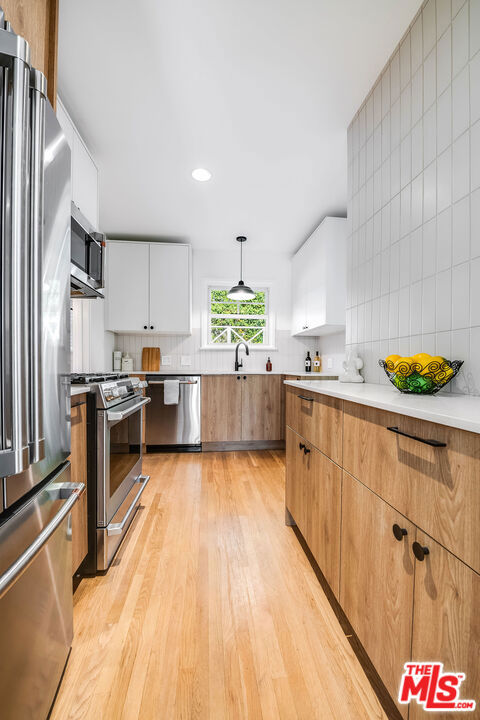 Tucked into the heart of iconic Beachwood Canyon, 2446 Cheremoya Avenue offers a refined blend of character and modern refinement. This thoughtfully updated two-bedroom home, complete with an additional office/bonus room, has been fully renovated and lovingly maintained. Inside, natural light pours through Marvin energy-efficient windows, highlighting recently refinished hardwood floors, crown molding, and classic baseboards. The inviting layout flows into a modernized kitchen outfitted with sleek cabinetry, Cafe appliances, a handcrafted Fireclay tile backsplash, and ample storage perfectly suited for both everyday living and entertaining. Every detail reflects quality and care: updated plumbing, smart home technology from Nest and Lutron, Hunter Douglas ceiling fans, and a custom California Closet system. The detached two-car garage extends the home's versatility, featuring an EV charging station, Gladiator shelving, and generous storage space. Outdoors, a beautifully landscaped, two-level backyard sets the stage for California living at its best. String lights, mature greenery, and multiple seating areas create the perfect atmosphere for private relaxation or lively gatherings under the stars. From this coveted location, you'll enjoy quick access to the Hollywood Sign, Beachwood Cafe, Bronson Caves, Los Feliz shops and restaurants, and some of Los Angeles's most beloved hiking trails. With its character, comfort, and convenience, 2446 Cheremoya Avenue is more than move-in ready -- it's a true Canyon retreat.