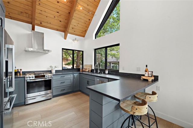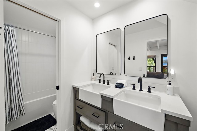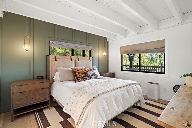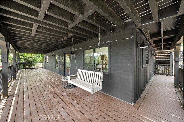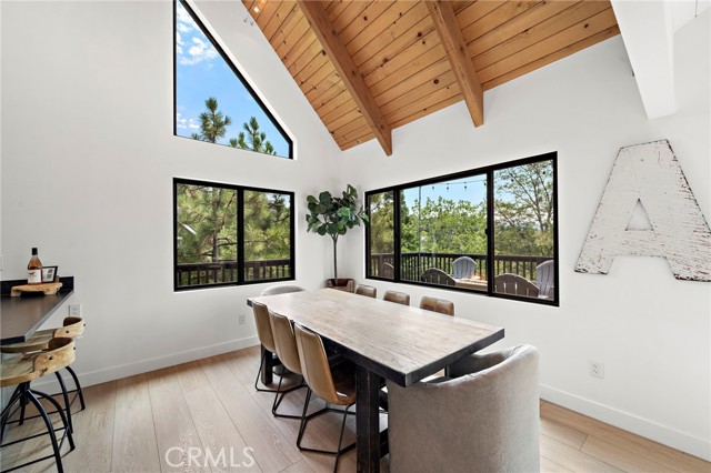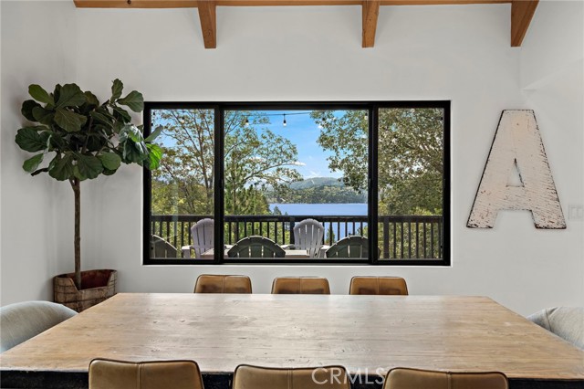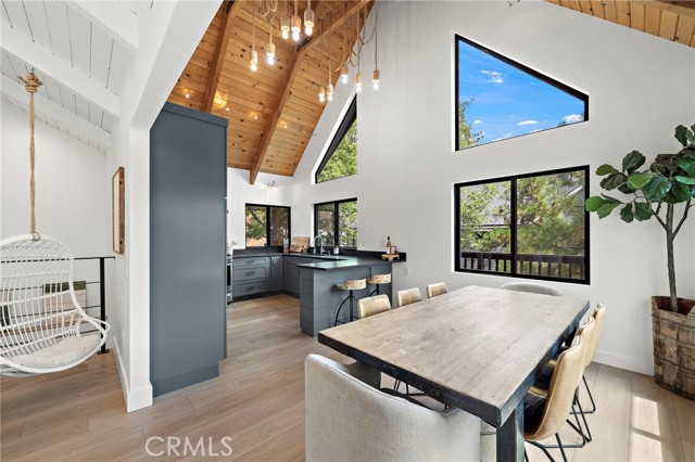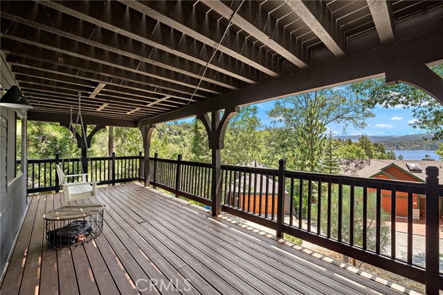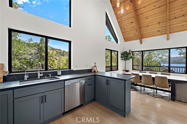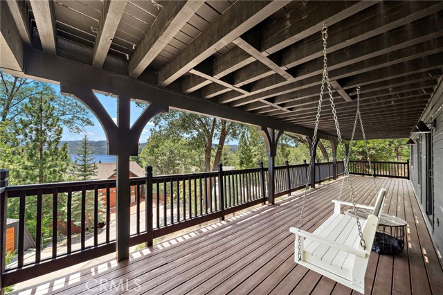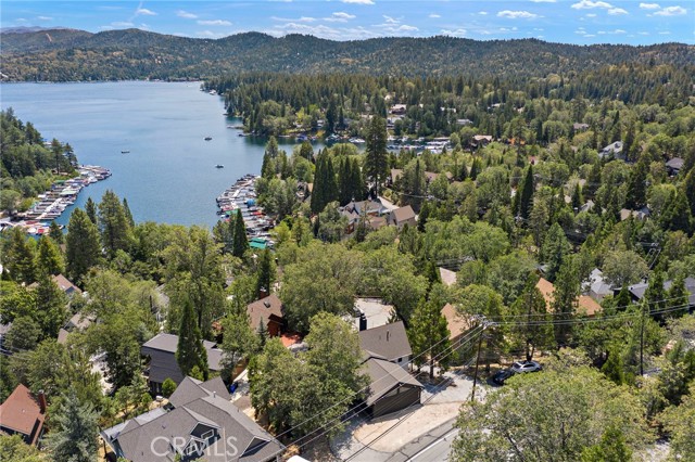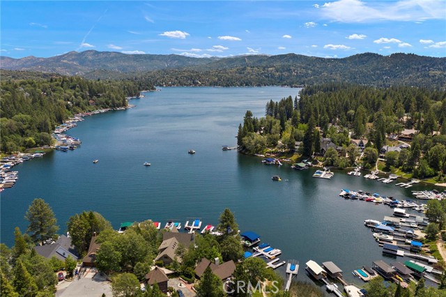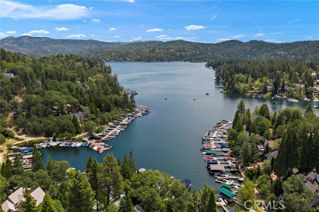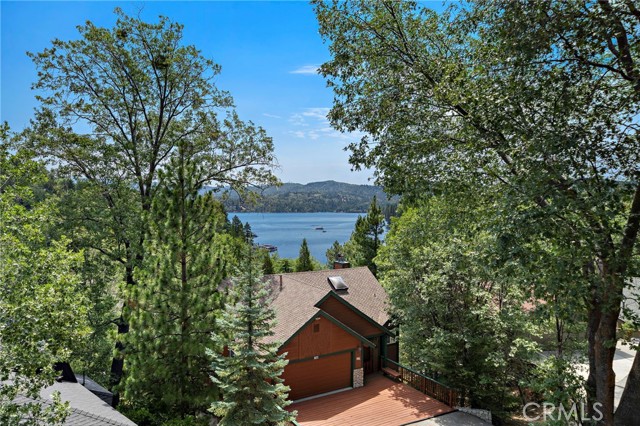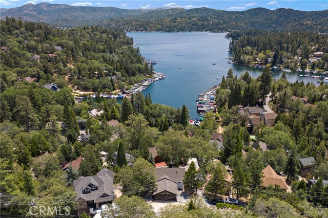 This stunning 4-bedroom, 3.5-bath mountain retreat combines modern upgrades with timeless lodge-style charm, offering captivating lake views from nearly every window. Thoughtfully remodeled in 2020-2021, the home features a bright open floor plan perfect for both comfort and entertaining. The main level showcases a dramatic great room with vaulted ceilings, expansive windows, recessed lighting, and a cozy gas fireplace that opens to a large entertainer’s deck. The remodeled kitchen is a chef’s dream with stainless steel appliances including a refrigerator, shaker-style cabinetry, pantry with pullout shelves, granite counters, peninsula with seating, and large windows framing the view. Two primary suites with spa-inspired baths—one on the main level and another on the lower level—provide privacy and flexibility, while two additional bedrooms and a spacious family room with a second fireplace and walk-out access to the lower deck with a swinging bench create the perfect retreat for family and guests. Outdoor living shines with two expansive decks crafted in durable Trek decking, ideal for gatherings, dining, or simply enjoying the mountain air and lake views. Additional highlights include dual HVAC and A/C systems with split thermostats, vinyl flooring throughout, inside laundry with washer and dryer, a finished pull-through two-car garage with automatic doors on both sides, and ample guest parking. Sold fully furnished for a true move-in ready experience, this home is ideally located just above the trails of North Bay Cove with lake rights, peaceful morning walks, sunset strolls, and easy access off Bay Road with level parking. Just minutes from Blue Jay and Lake Arrowhead Village shops and dining, this exceptional property offers the perfect blend of modern amenities, mountain appeal, and lake lifestyle—whether as a primary residence, weekend escape.