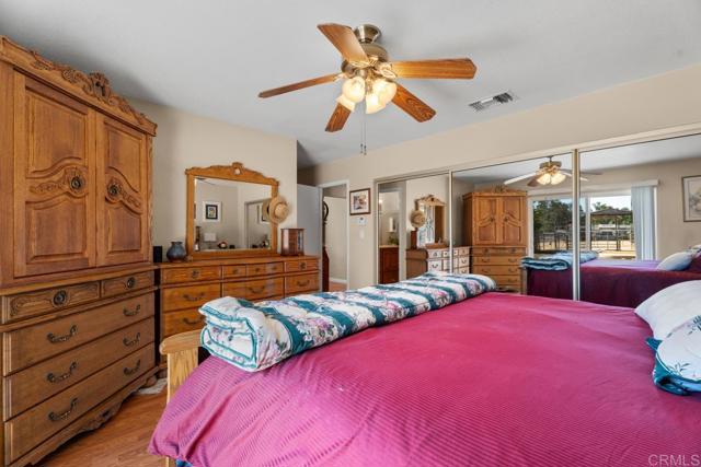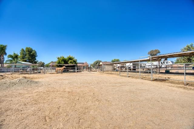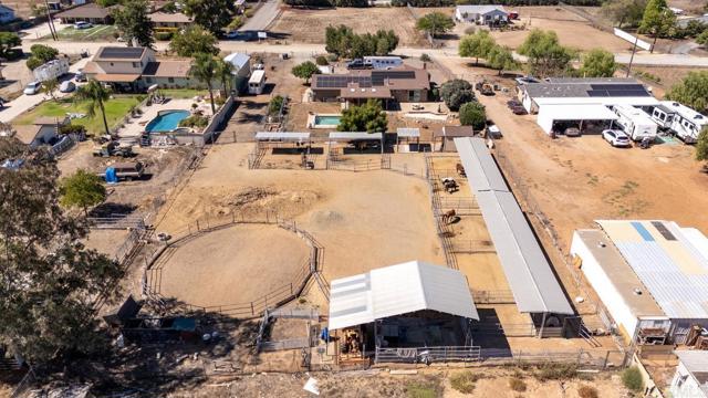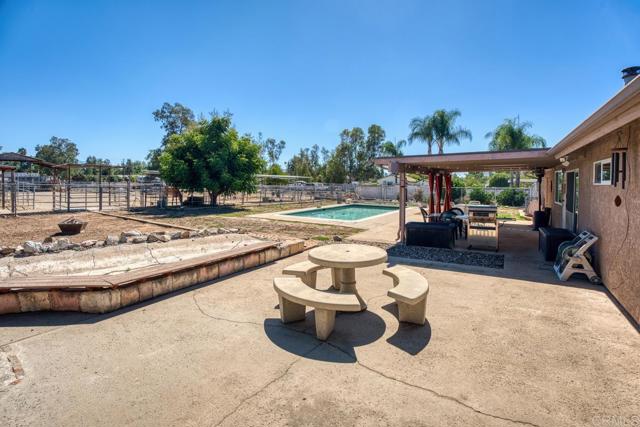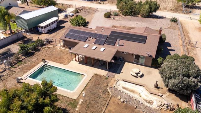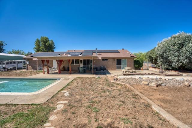Welcome to this beautifully upgraded property, thoughtfully designed for comfortable living and equestrian or animal use. This home and ranch-style setting combine modern amenities, energy efficiency, and extensive outdoor features. Inside, the home boasts custom-built bathroom cabinetry with maximum storage, and elegant travertine countertops. The kitchen is enhanced with granite tile counters, a brand-new refrigerator, microwave, and a spacious pantry complete with ShelfGenie pull-out drawers and organizers. Dual-paned windows, a who house vacuum system, a newer water heater, a new heater, and a Mirantec garage door opener with a newer garage door ensure both comfort and efficiency. Energy features include 26 solar panels, 2 Tesla Powerwalls, a Tesla EV charger, and a new Lopi wood-burning stove, offering sustainable living without compromise. A home security system adds peace of mind. Outdoors, the property is fully fenced and cross-fenced with a powered front gate. Equestrian enthusiasts will love the impressive 108-ft steel beam custom horse structure, 6 oversized 24x24 corrals, an additional 12x24, a 54-ft round pen for exercising, 2 wash racks/grooming stalls, and a hay barn with electricity. A 12x10 wood shed/tack room adds convenience. The backyard is perfect for entertaining or relaxing, featuring a covered patio, a sparkling above-ground 3-5-3 pool with a new upgraded variable-speed pump, and raised garden beds for your seasonal plantings. Mature fruit trees—olive, grapefruit, lemon, tangerine, lime, avocado—and blackberry vines provide an abundance of fresh produce right at home. The roof was completely redone in 2009, and plumbing extends throughout the property, making every corner functional. This unique property offers a rare combination of modern upgrades, energy independence, and equestrian amenities, creating a private retreat with everything you need.