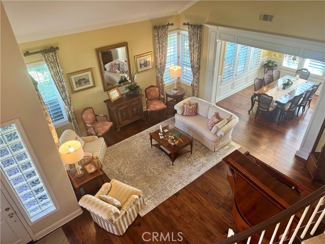 Welcome home to "Casa Loma Alta del Sur" - the house on the south hill! This stunning 4 bedroom, 3 1/2 bathroom, 3 car garage home has been beautifully updated with impeccable taste and quality finishes and is located at the end of a cul-de-sac street in Dove Canyon, a sought-after private gated golf community*The minute you walk into the entry and living room, you will feel enveloped in this exceptional residence as you look around at the spiral staircase with white spindles and stained cap, high ceilings, custom woodwork, gorgeous dark wood floor, high-end carpet, plantation shutters, 2-tone paint, glass block windows and so much more*The dining room is beautiful with a custom wood frame entry inviting you in, and wainscotting on 3 walls*The remodeled kitchen has custom Omega white cabinets with a coffee wash, granite countertops, quartz and stone full backsplashes, a large center island with a 6-burner black Decor down-draft cooktop and a wine rack*There is a walk-in pantry and high-end appliances including a Kitchen Aid refrigerator and Bosch double ovens, and the adjacent breakfast room has 2 Renaissance sliding doors to bring in the light*The warm family room has a fireplace, a custom built-in desk and wet bar*Travel up the staircase to enter the double doors to a gorgeous primary suite with retreat, 2 closets and a remodeled bathroom with slipper tub, large shower with frameless enclosure, custom Omega white cabinetry with divided vanities, marble countertops and Baldwin crystal knobs*Down the hallway you'll find 3 secondary bedrooms, 1 with its own remodeled bathroom with a shower, refaced cabinets and a vessel sink and the other 2 bedrooms share a remodeled bathroom with a free-standing white wood vanity with quartzite countertop and a tub/shower with a newer shower enclosure*Features include newer double-paned windows, newer HVAC, concrete tile roof, Ecobee thermostat system, Toto and Kohler toilets and sinks, Restoration Hardware mirrors and lighting, mirrored closet doors, and much more*Enjoy your private backyard with a large pool and spa with dark Pebbletech finish, custom-built brick and tile dining center with Viking stainless steel barbeque and refrigerator, a newer patio cover and a peaceful view of mature trees and the mountains*Enjoy Dove Canyon amenities including pool and spa, tennis and pickleball courts, Sycamore Park with tot lot, basketball court, and a guard-gated entry*Attend excellent Saddleback USD schools*No Mello Roos.