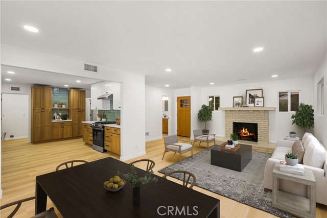 Welcome to 21032 Baltar Street, a beautifully renovated pool home that blends modern comfort with timeless California style. This 4-bedroom, 3-bath residence features a new roof, new HVAC system, and a highly desirable floor plan with finishes curated by Maverick Design. Inside, discover designer-selected flooring throughout, a poised fireplace, and an inviting, open layout ideal for both everyday living and effortless entertaining. The chef-inspired kitchen has been tastefully elevated with gorgeous new cabinetry, quartz countertops, a full-height backsplash, and a dedicated coffee station flanked by dual pantry cabinets. A new gas range and modern hardware complete this stylish, highly functional space that flows seamlessly into the dining and living areas. The primary suite, adorned with vaulted ceilings, offers a peaceful retreat with private backyard access - perfect for morning coffee poolside or unwinding in the evening. The updated en-suite bath boasts spa-inspired tilework, a walk-in shower, and polished fixtures. Three additional bedrooms and two more well-appointed bathrooms, including a secondary en-suite and another with a dual vanity, provide flexibility, comfort, and thoughtful design. Head outside to your own private oasis, complete with a shimmering pool, generous patio space for lounging and barbecuing, and mature landscaping that sets the stage for gatherings year-round. Additional highlights include new windows, a two-car garage with new motor, and a spacious laundry room with utility sink. Ideally located near Westfield Topanga, The Village, parks, and local favorites. Bring on the hype, this one absolutely deserves it!