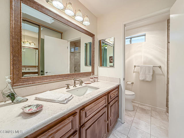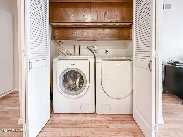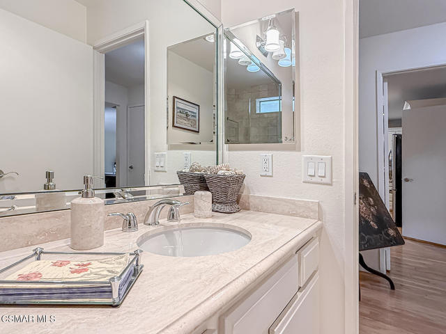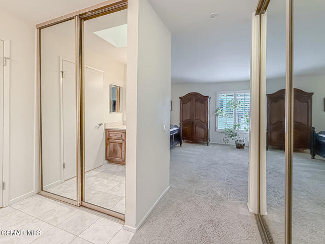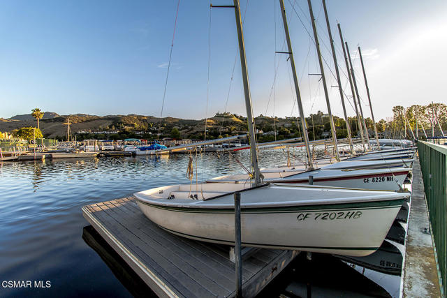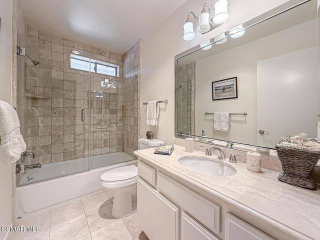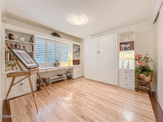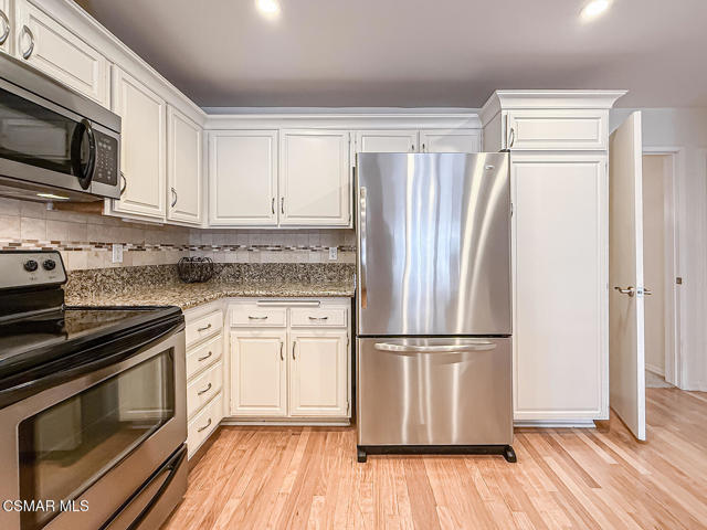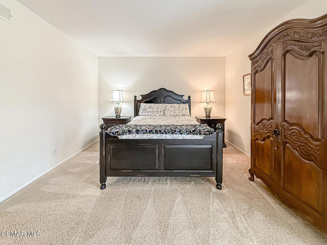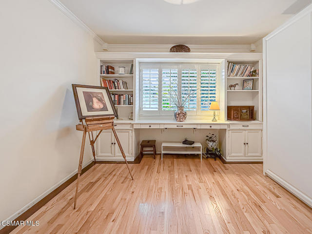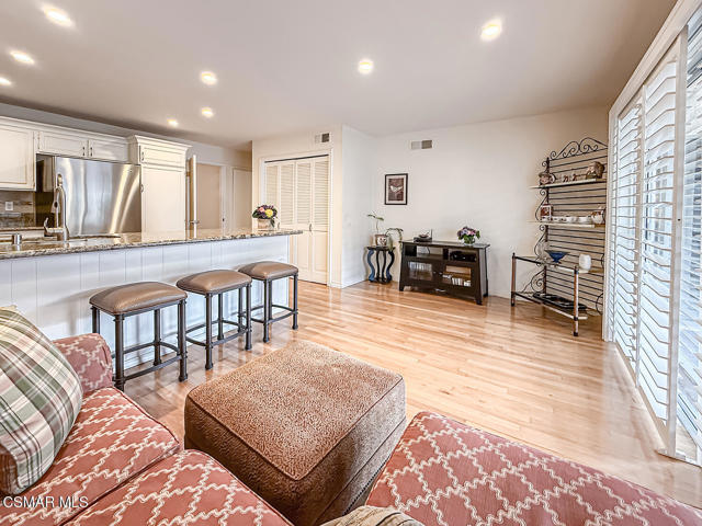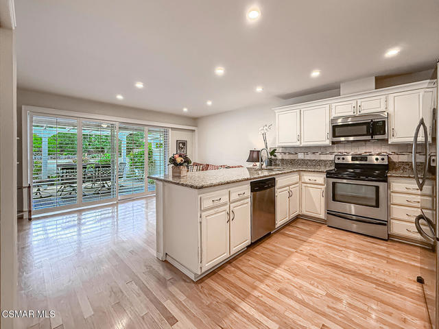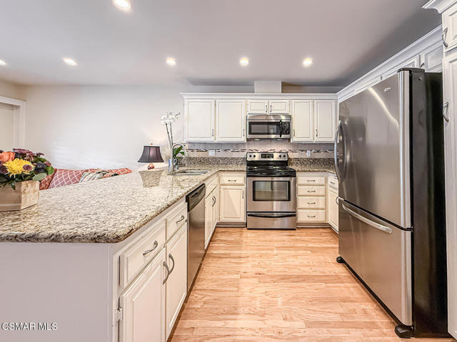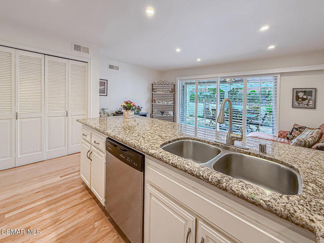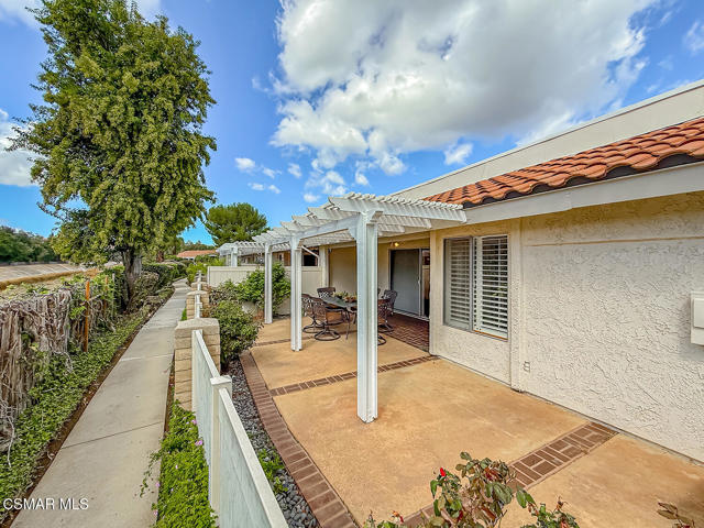Charming Single-Story Retreat in the Heart of Westlake Village with NO Interior Steps, NO Rear Neighbor, CORNER Location, PRIVATE Front & Back Patios, UPGRADED Kitchen & Baths, and WALKABILITY to Westlake Lake! Tucked within the peaceful and well-maintained community of Triunfo West, this 2-bed / 2-bath home offers a bright floorplan with community features including TWO Pool & Spa areas! From the moment you enter the gated front patio--lined with lush greenery--you'll appreciate the sense of calm and comfort that defines this property. Step inside and you're welcomed by HANDSOME real wood flooring and an open-concept Living & Dining Room with plush carpet, a dual-sided fireplace, and THREE pairs of tall windows that overlook the patio, bathing the space in natural light. The upgraded Kitchen boasts attractive granite countertops, mosaic-tile backsplashes, a stainless-steel sink, and matching Frigidaire stainless-steel appliances--all complemented by ample cabinetry & pantry storage! A bright and inviting Family Room sits just off the Kitchen, enjoying large sliding glass doors that open to the backyard and frame serene green views. Tucked behind bifold doors, the indoor Laundry Area flanks the Kitchen to make laundry effortless & convenient! The spacious Primary Bedroom is a peaceful sanctuary with tall windows & sliding glass doors to the backyard, and TWO mirrored closets. Its en-suite bathroom features an upgraded stone-topped vanity with skylight above, plus a separate water room with fully revamped shower, artistic tilework, and frameless glass doors. The Secondary Bedroom offers excellent flexibility--perfect for guests or a home office--with wood flooring, a FANTASTIC Murphy bed, built-ins, and views of the front patio. The full Hall Bathroom has also been redone with upgraded tile floors, a built-in stone-surfaced vanity, and a redone tub/shower combo with tile surrounds + frameless glass doors! Step outside to your PRIVATE backyard retreat--with NO rear neighbor--only peace and greenery beyond! Enjoy the covered concrete patio and side pathway which showcases a VIBRANT row of blooming rose bushes in every shade--pink, red, yellow, orange, white and more! Your 2-car garage is directly accessible from the front patio and is complete with built-in cabinetry. Residents of this sought-after community enjoy access to TWO sparkling pools & spas, shuffleboard courts, greenbelts, and scenic walking paths--all just moments from Westlake Lake, boutique shopping, and fantastic restaurants.This is the kind of peaceful, bright, and thoughtfully updated home that rarely comes available in such a prime Westlake Village location--don't miss it!