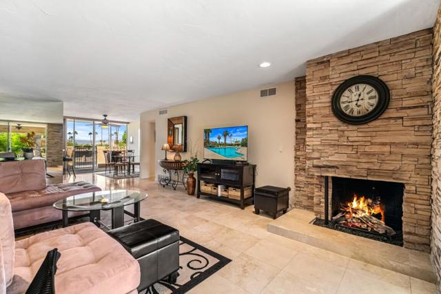 Beautifully updated and move-in ready! This 2-bedroom, 2-bath Sandpiper unit offers 1,300 square feet in a historically designated area of Sandpiper in Palm Desert. The condo features a combination of tile flooring in the main living areas and carpet in the bedrooms. Both bathrooms have been updated with granite countertops and walk-in showers with glass enclosures. The living room includes a corner fireplace rarely seen in this Sandpiper floor plan, and all of the living room walls are finished in a textured natural stack stone treatment in warm desert tones -- creating a clean, modern look with subtle depth and shadowing.The property underwent a full renovation by November 2020 with new kitchen cabinets and granite countertops, all-new flooring, complete interior repainting, a new main bathroom with vanities, and stainless-steel appliances. Kitchen and dining areas open onto a private patio with mountain views and a convenient laundry closet. Enjoy morning sun on your poolside patio overlooking a lush greenbelt with pool and mountain views -- perfect for outdoor entertaining and soaking up the desert lifestyle. It is also eligible for the Mills Act, offering potential property-tax savings. With a minimum one-week rental policy, the property is ideal for both personal enjoyment and rental opportunities. Located just minutes from El Paseo shopping, dining, hiking, and more. Unit is sold furnished and includes one covered carport parking space.