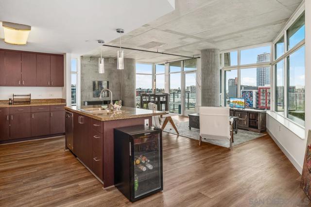 Welcome to Smart Corner, where modern design meets the energy of city living. This expansive 5th-floor corner unit offers 1,422 square feet of stylish, open-concept space with soaring ceilings, exposed concrete accents, and walls of windows that flood the home with natural light. Freshly painted and upgraded with high-quality vinyl wood-plank flooring, this home seamlessly blends sophistication with comfort. The spacious kitchen is perfect for gathering, featuring a central island with a breakfast bar, stainless steel appliances, and ample cabinetry. The open floor plan flows seamlessly into the living and dining areas, while a large covered balcony invites you to enjoy sweeping city views. The split-bedroom layout with 2 well-defined bedroom areas, with a generous primary suite boasting a walk-in closet and ensuite bath, plus an open secondary bedroom area and full bath ideal for guests or a home office. This home includes in-unit laundry and two tandem parking spaces, offering convenience and ease of living. At Smart Corner, you’ll enjoy resort-style amenities including a rooftop terrace with 360° views of the city and bay, a community garden, BBQ area, hot tub, gym, and onsite management with security. Perfectly situated, you’re just blocks from Balboa Park and minutes from Downtown, Little Italy, Petco Park, and San Diego Bay, with easy access to freeways and public transit. Experience the very best of urban living in one of San Diego’s most vibrant communities. Technically, this is a zero-bedroom/studio with open rooms.