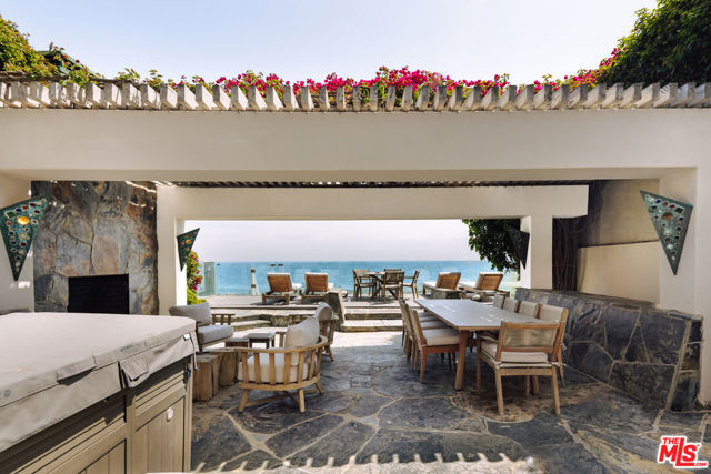 Bold design and modern features coalesce in this newly remodeled three-story beach house. Located in the guard-gated community of Malibu Colony, this 5 bedroom/5 bath home w/custom stone floors, fabric walls, and hand-selected designer elements. Perfect for grand or casual living, the home offers a custom aquarium entry that flows into a sleek, but inviting formal living room and dining area with raised fireplace and floor-to-ceiling wall of glass that opens to a logia covered entertainer's deck with a BBQ island, multiple seating areas and raised wood sun/viewing deck with direct beach access. Black granite, ocean view gourmet kitchen with custom stainless steel finishes and high-end appliances. Intimate family/media room with granite bar area. Gorgeous, ocean view owner's suite with sitting area, high ceilings, and double spa-like baths, plus a third-floor equipped gym that overlooks the suite. Four additional en-suite bedrooms, two-car garage with guest parking. Also for lease $75,000/month.