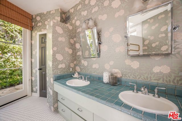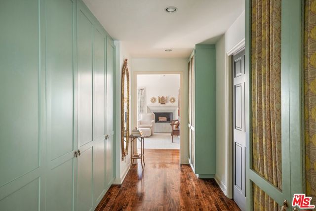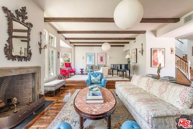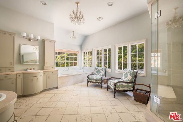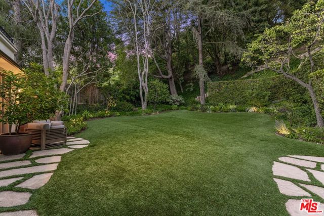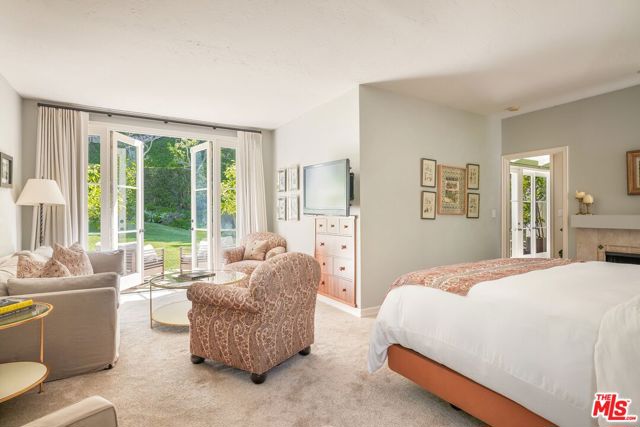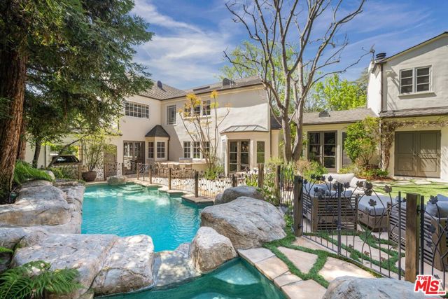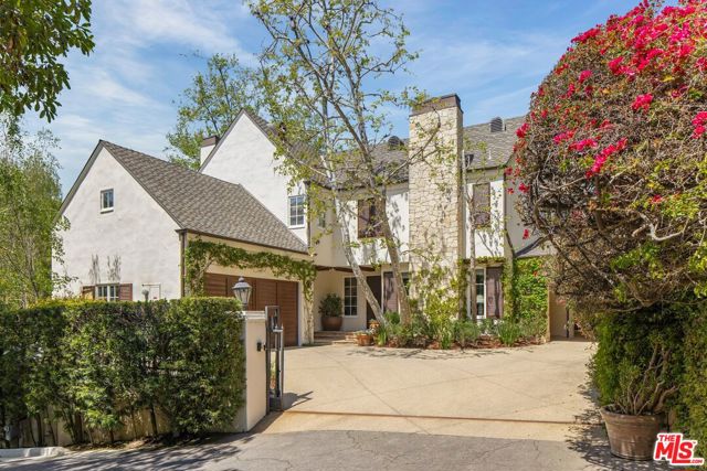 Located and the end of a private drive and tucked away behind a set of gates, this stately 5-bedroom, 6-bath traditional home rests on a 40,873-square-foot flat parcel, exuding charm and timeless sophistication. Sunlight floods the interiors, where nearly every room enjoys a connection to the outdoors and beautiful vistas. The main level opens with a formal living room beneath vaulted, wood-beamed ceilings, flowing into an elegant dining room complete with a fireplace framed by a detailed custom mantel and wet bar. A warm and inviting family room offers the perfect setting for relaxed gatherings. The gourmet kitchen features a center island, professional-grade appliances, and a breakfast nook with French doors opening to the gardens. The grounds, designed by acclaimed landscape architect Garrett Carlson, are a private sanctuary. Lush plantings surround a sparkling pool and spa, a basketball court, and a detached studio ideal for creative pursuits or a guest hideaway.Upstairs, the impressive primary suite boasts treetop views, a walk-in closet, and a spa-like bath with a steam shower, double vanities and soaking tub. Four additional bedrooms, a gym, and a study complete the home. Conveniently positioned near top-rated schools, world-class dining, and cultural landmarks including the iconic Getty Center this residence captures the essence of the California lifestyle.