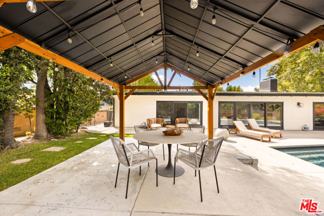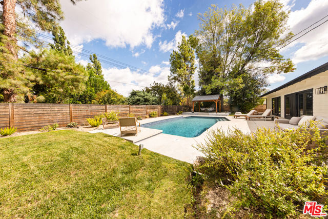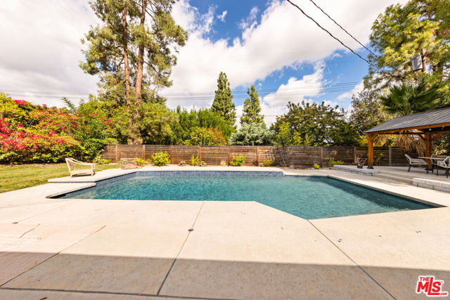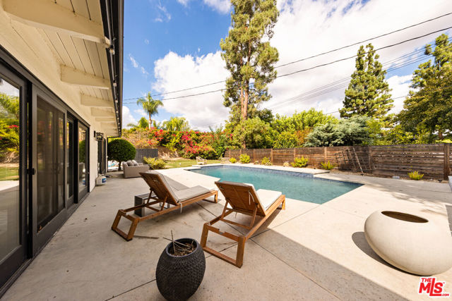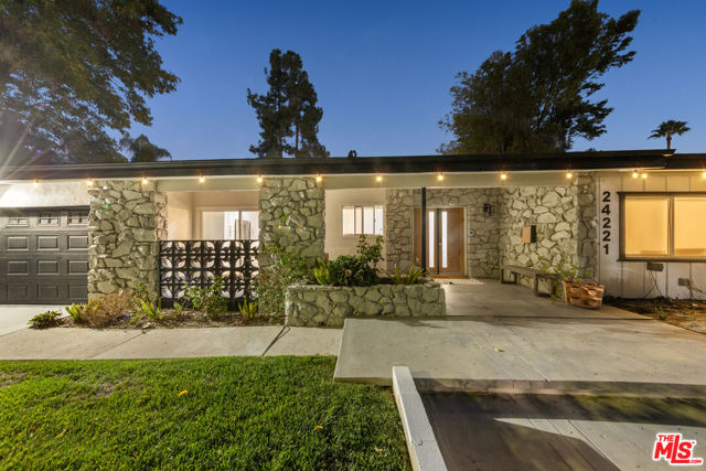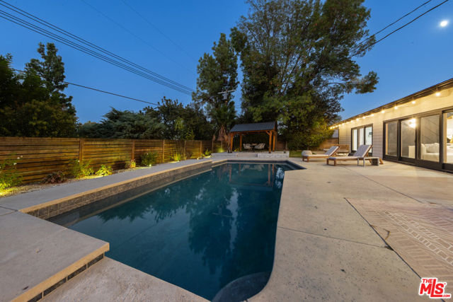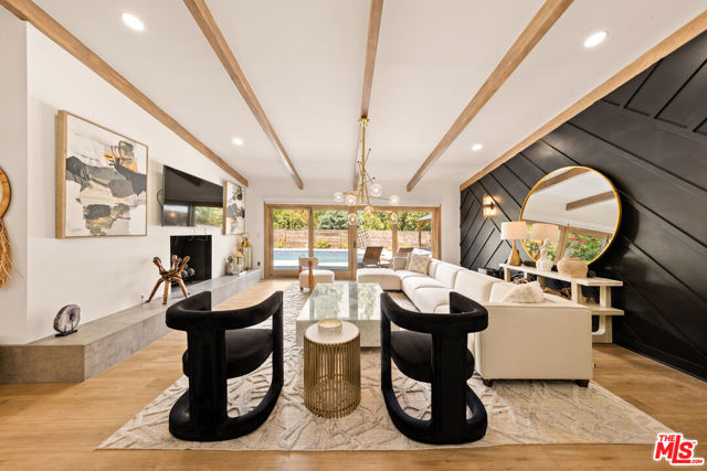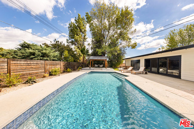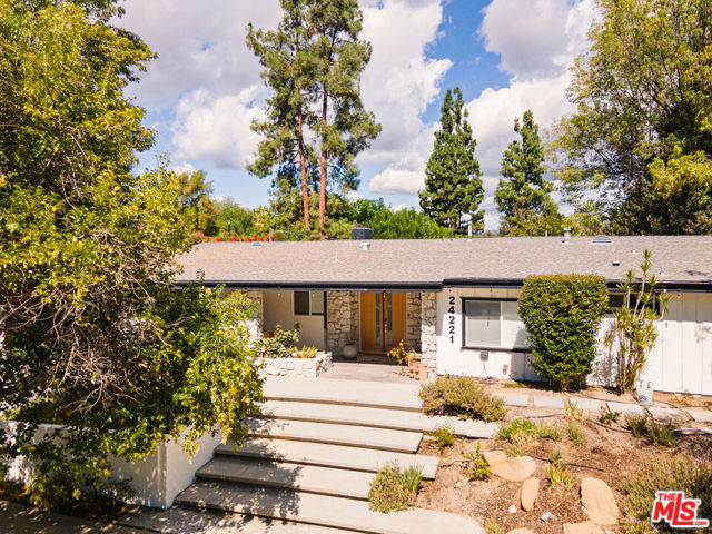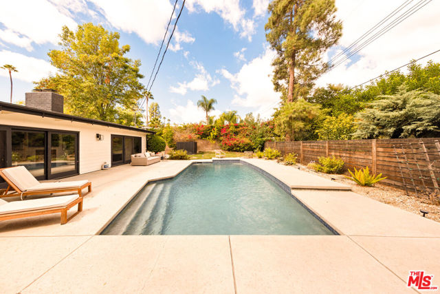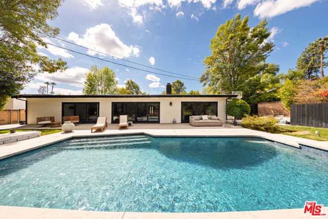 Designed by renowned architect Charles DuBois, this 1964 Mid-Century Modern masterpiece embodies timeless California living. Featuring 3 bedrooms, 2.5 baths, a two-car garage, and 2,401 sq. ft. of refined interiors on a 10,898 sq. ft. lot, the home showcases DuBois's signature open-beam ceilings, rich wood floors, and a wraparound dual fireplace at its center. Enhanced in 2022, it seamlessly blends architectural heritage with modern luxury. The flowing layout connects a grand living area, formal dining room, and chef's kitchen with a spacious island. French doors open to a private, resort-style backyard oasis with a pool, gazebo, and sport court, surrounded by lush landscaping. Perfect for both grand entertaining and quiet retreat. Located within the top-rated Woodland Hills school district, this residence is a legacy of design, reimagined for those who value elegance, comfort, and distinction. Ready to be lived in, cherished, and called home.