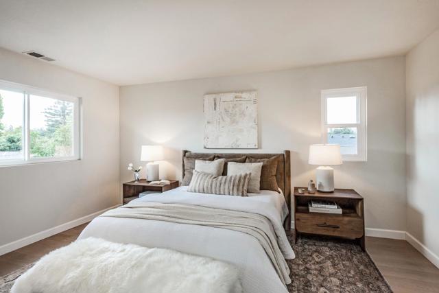 Beautifully remodeled with turnkey appeal, this North Fair Oaks gem showcases modern livability midway between Silicon Valley and San Francisco. The flexible two-story layout features two bedrooms and two remodeled baths, all enhanced by a palette of soft designer colors and white oak engineered hardwood floors. The open living area at the entrance has a modern chandelier and connects seamlessly to the sleek kitchen with a quartzite-topped peninsula with counter seating, custom suspended vent hood, and stainless steel appliances. At the rear of the home is a spacious family room that opens to the private paver-finished rear yard. A main-level bedroom and bath are complemented by the upstairs primary suite with walk-in closet, western hill views, and well-appointed bathroom. Smart features include a Ring doorbell, keyless front entry, and a smart thermostat along with central air conditioning. Roses, geraniums, and a camellia enliven the setting, which has ample off-street parking and an attached 1-car garage. Just blocks from the Redwood City Stanford campus and minutes to Meta headquarters and Highway 101.