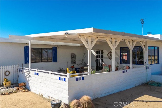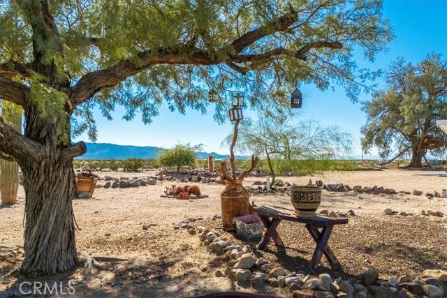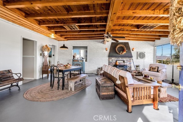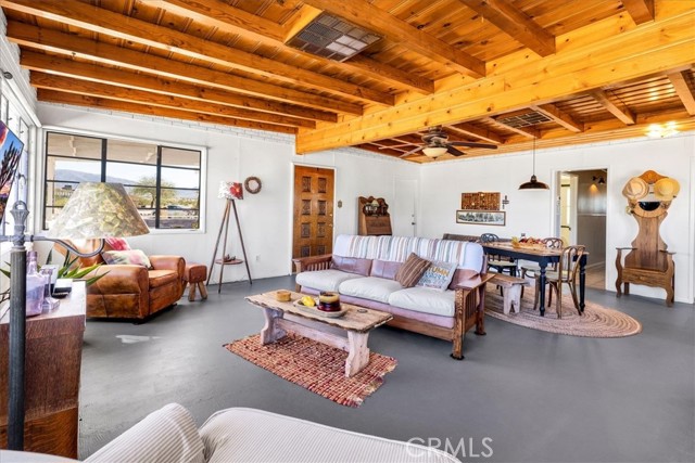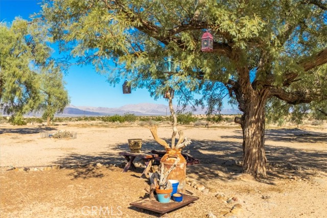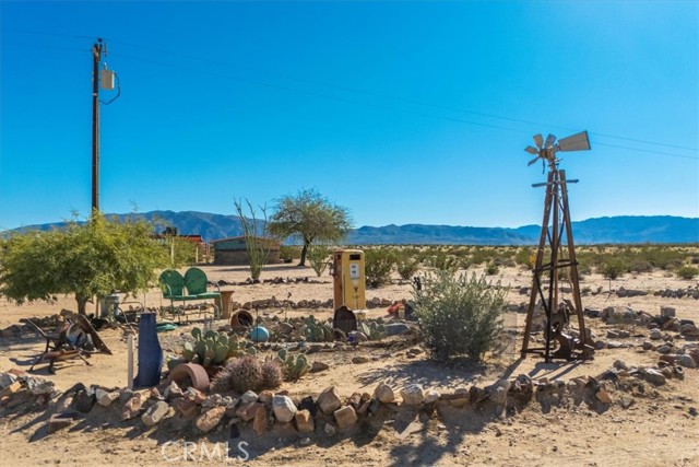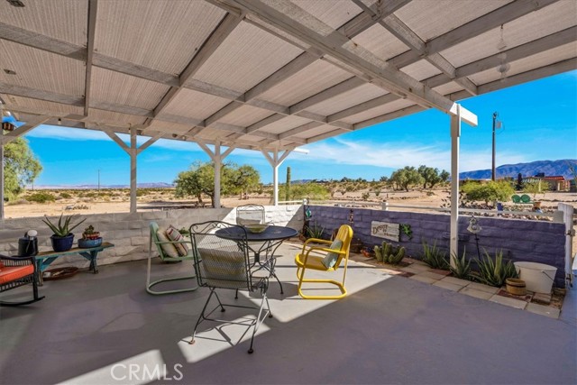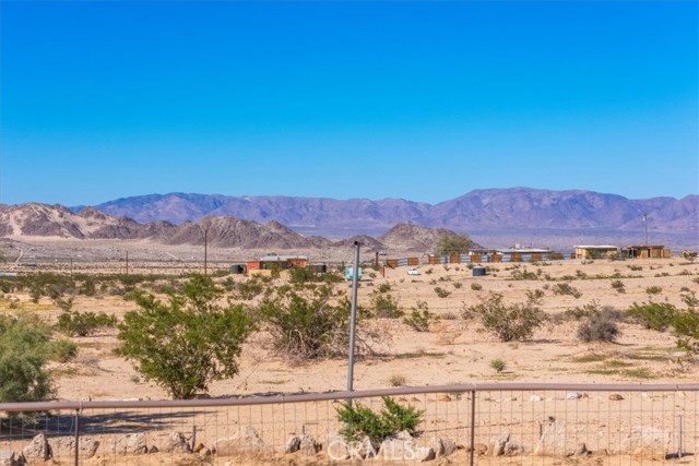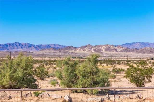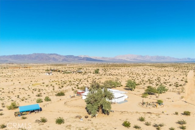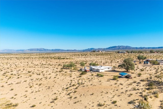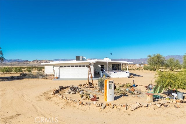 Welcome to 79116 Becker Lane, a lovely 2bed/1bath home nicely situated on a combined 10 ACRES OF LAND (two 5 acre parcels) with stunning panoramic desert and mountain views. Minimalistic living with all the comfort, this home features 1,376 square feet of living space with dual cooling (central AC/heating AND an evap cooler), an attached 2 car garage and a shared well between the two 5 acre lots. The warm and welcoming living room adorns gorgeous knotty pine ceilings, painted concrete floors, a brick-faced fireplace and several large windows that let in an abundance of natural light. The living area flows effortlessly into the quaint kitchen and dining space complete with earth-toned tile flooring, white cabinetry with a corrugated metal backsplash and a kitchen island with a sink and additional storage. The 2 bedrooms are of generous size and feature ceiling fans, concrete floors, built-in closets/shelving & they share the hall bathroom which boasts a dual sink vanity and a shower/tub combo. That's just the inside, outside you'll be delighted to find a large covered patio, mature desert plants and natural landscaping, an oversized carport, a fenced-in yard in the back and ample space to entertain or relax around a firepit on a starry desert night. This home is located less than 15 mins to the JTNP East Entrance as well as local shops, eateries, downtown 29 Palms & more; but still far enough away to fully enjoy all the peace and serenity our beautiful desert has to offer. A property like this rarely becomes available, come take a look & let this home's charming allure do the rest. Your new desert home or weekend retreat awaits.