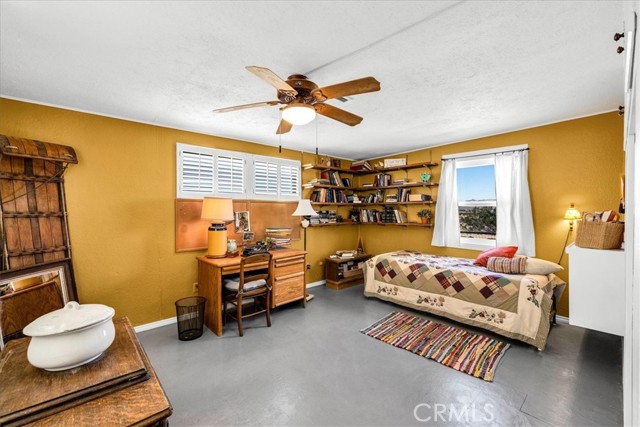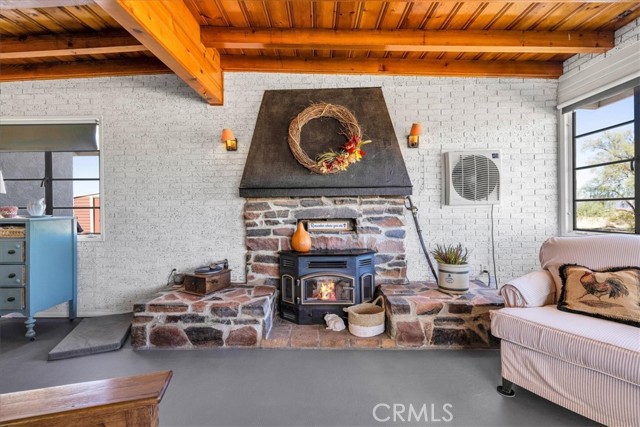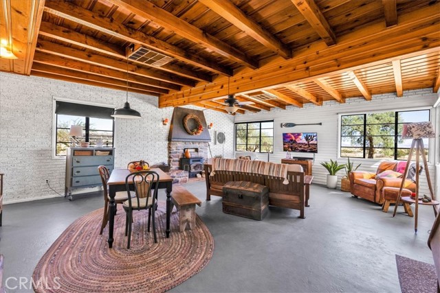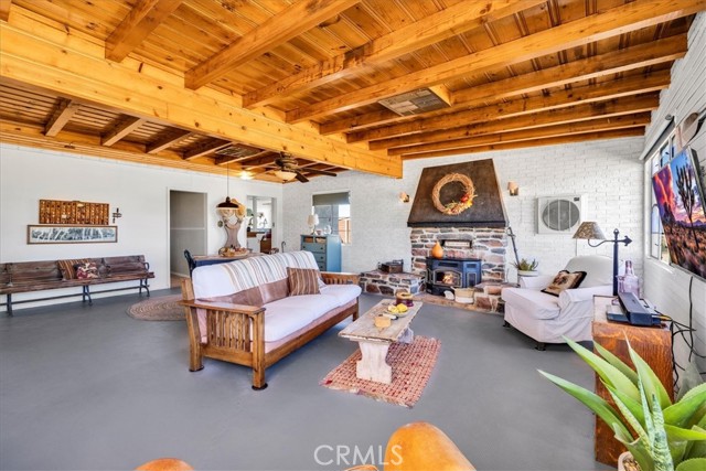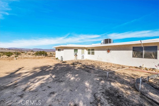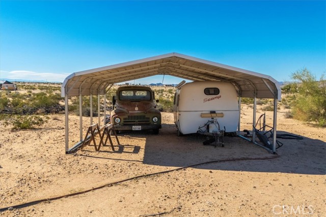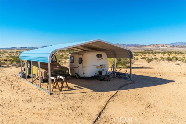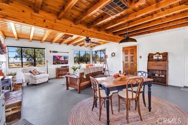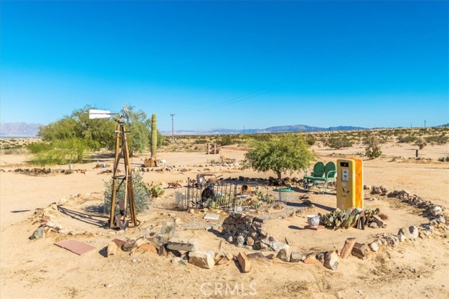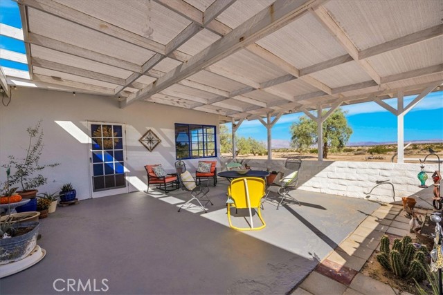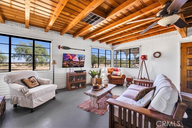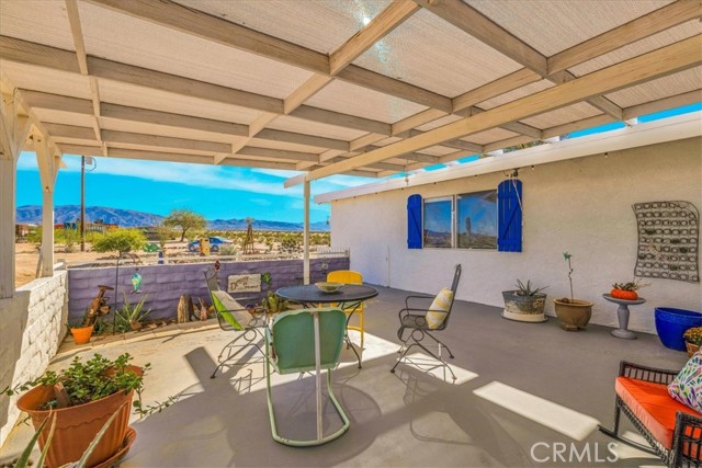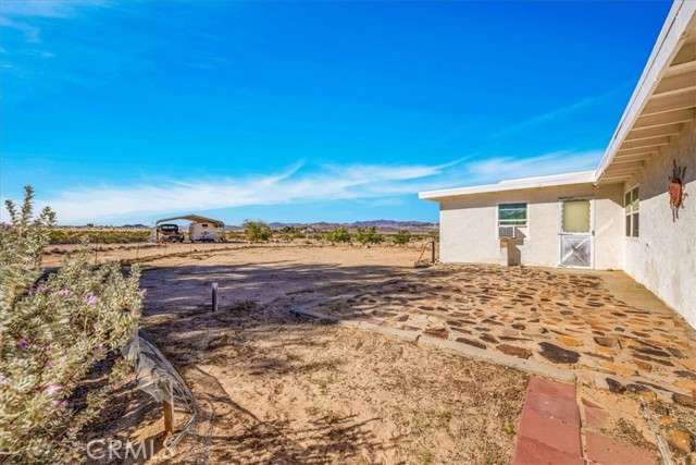 Welcome to 79116 Becker Lane, a lovely 2bed/1bath home nicely situated on a combined 10 ACRES OF LAND (two 5 acre parcels) with stunning panoramic desert and mountain views. Minimalistic living with all the comfort, this home features 1,376 square feet of living space with dual cooling (central AC/heating AND an evap cooler), an attached 2 car garage and a shared well between the two 5 acre lots. The warm and welcoming living room adorns gorgeous knotty pine ceilings, painted concrete floors, a brick-faced fireplace and several large windows that let in an abundance of natural light. The living area flows effortlessly into the quaint kitchen and dining space complete with earth-toned tile flooring, white cabinetry with a corrugated metal backsplash and a kitchen island with a sink and additional storage. The 2 bedrooms are of generous size and feature ceiling fans, concrete floors, built-in closets/shelving & they share the hall bathroom which boasts a dual sink vanity and a shower/tub combo. That's just the inside, outside you'll be delighted to find a large covered patio, mature desert plants and natural landscaping, an oversized carport, a fenced-in yard in the back and ample space to entertain or relax around a firepit on a starry desert night. This home is located less than 15 mins to the JTNP East Entrance as well as local shops, eateries, downtown 29 Palms & more; but still far enough away to fully enjoy all the peace and serenity our beautiful desert has to offer. A property like this rarely becomes available, come take a look & let this home's charming allure do the rest. Your new desert home or weekend retreat awaits.