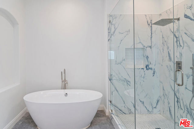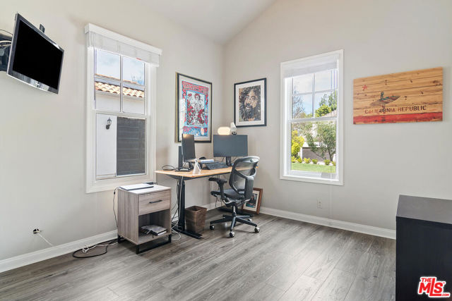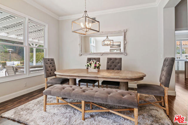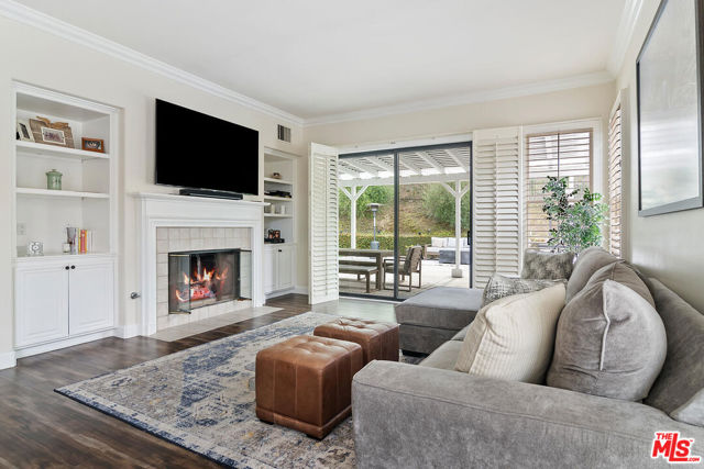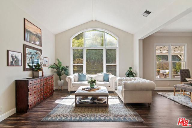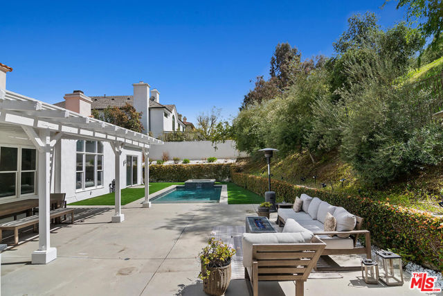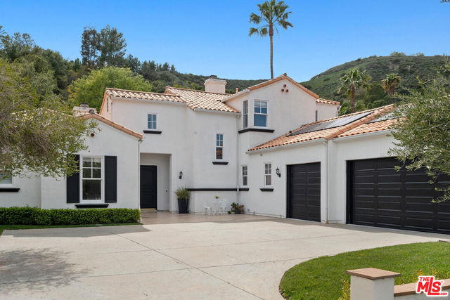 Nestled within the prestigious guard-gated community of Calabasas Park Estates, this stunning residence boasts incredible curb appeal, a spacious motor court driveway, and a newly updated backyard with pool and spa. Thoughtfully designed to live like a one-story home, the main level features the primary suite, two additional bedrooms, and expansive living and entertaining areas.The charming exterior is enhanced by beautiful windows, gorgeous landscaping, and a stately entry door that welcomes you inside. The light-infused interior is a serene retreat, with soaring ceilings and an elegant arched window that frames the lush outdoor scenery. French doors lead from the formal living and dining rooms into a spacious family room with a cozy fireplace, seamlessly connecting to the newly remodeled gourmet kitchen. Designed for both beauty and function, the designer-inspired kitchen showcases decorative quartz counters, subway tile backsplashes, white cabinetry, and premium Viking appliances, including a built-in refrigerator, range, dishwasher, and microwave. The private primary suite offers a tranquil sanctuary, highlighted by a vaulted ceiling, fireplace, custom built-ins, and a spa-like newly renovated ensuite bath with dual sinks, a separate shower, a large soaking tub, and a walk-in closet. Downstairs are 2 additional bedrooms. Upstairs, two additional bedrooms, a full bath, and a bonus room with lofted ceilings and built-ins provide flexibility for work, play, or guest accommodations. The totally transformed backyard is an entertainer's dream, featuring a sparkling pool, outdoor kitchen, and a covered trellis patio is the perfect setting for dining al fresco or unwinding in the serene surroundings. The elegant landscaping creates a private oasis, blending simplicity with sophistication. This home has solar! Set back from the street for ultimate privacy, this exceptional home offers a rare combination of charm, functionality, and luxury living in one of Calabasas' most sought-after communities.
