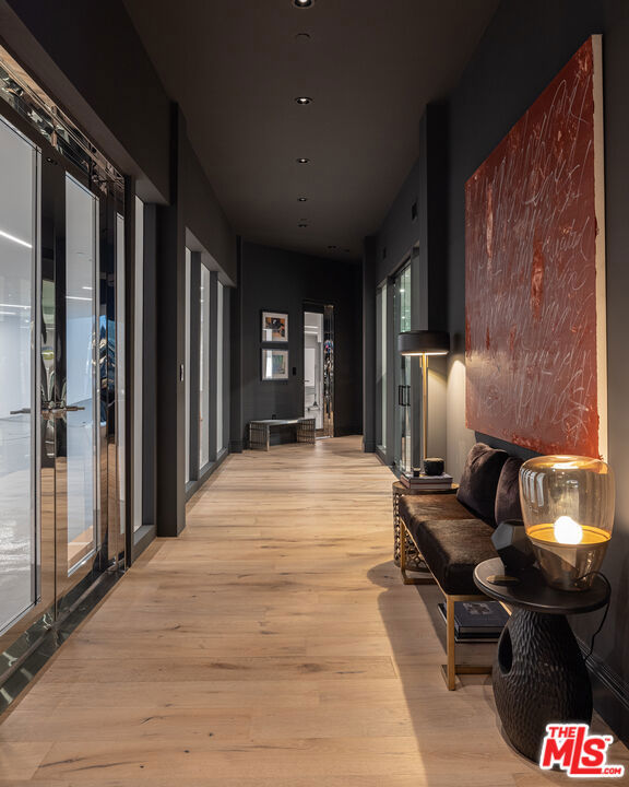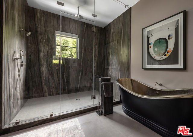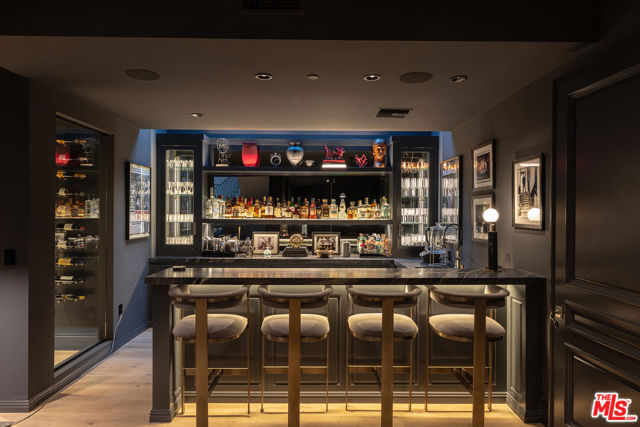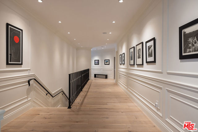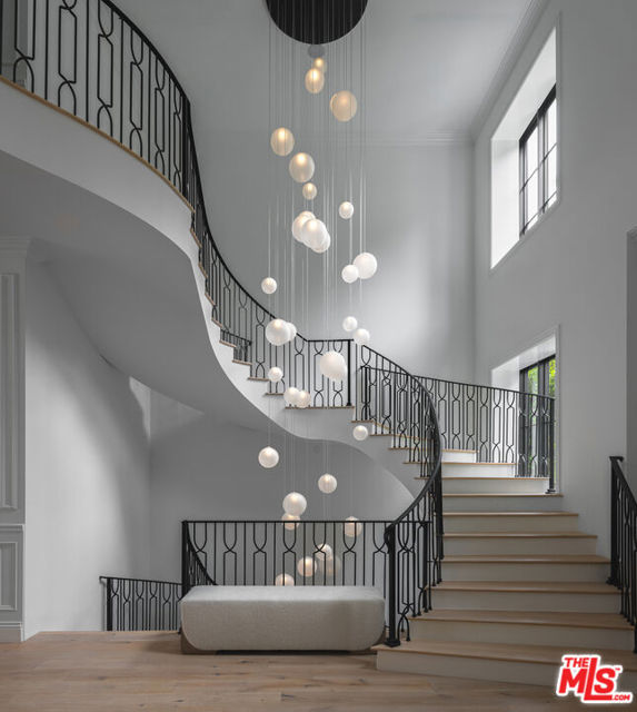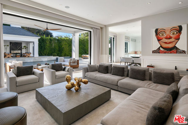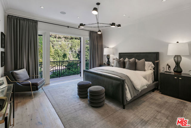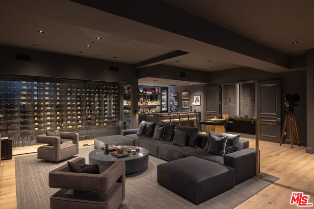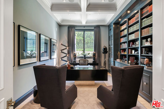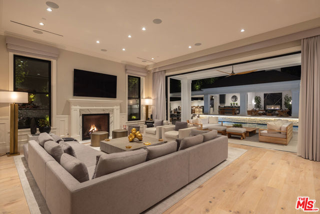 Positioned within the coveted Hidden Valley enclave of Beverly Hills, this impeccable estate offers privacy and tranquility behind secure gates, with 24/7 guard protection and lush, mature landscaping. Situated in one of the area's most prestigious guard-gated communities, this residence showcases timeless design, grand proportions, and a thoughtfully updated aesthetic that harmonizes with its natural surroundings. Every element of this home has been masterfully conceived to deliver an unparalleled living experience. A dramatic 24-foot ceiling in the entry foyer sets the tone, featuring custom-crafted millwork and elegant wrought-iron accents that echo throughout the interiors. Spanning approximately 12,000 square feet, the residence is graced with wide-plank white oak floors, 12-foot-high ceilings, and expansive windows that frame serene canyon vistas. The main level unfolds with a series of distinguished spaces, including a formal living room, office, formal dining room, and multiple powder rooms. A spacious family room seamlessly connects to the outdoor entertaining areas, where a sprawling backyard oasis includes a pool, spa, outdoor kitchen, bar, dining pavilion, and fire pit lounge. The chef's kitchen is a masterpiece of both design and functionality, outfitted with honed Calacatta marble countertops, a La Cornue 1908 range and oven, Wolf microwave, Sub-Zero refrigerator and freezer, dual Miele dishwashers, a wine fridge, and an oversized eat-in island, all framed by crisp white cabinetry. Two ensuite bedrooms and a two-car garage complete the main floor. Effortless access to the estate's three levels is provided by a private elevator. Upstairs, the opulent primary suite offers a serene retreat with a fireplace, a balcony with picturesque views, dual marble bathrooms featuring soaking tubs, and a pair of custom dressing rooms with abundant built-in storage. Four additional ensuite bedrooms, each with spacious dressing closets, complete this floor. The lower level features a host of amenities for relaxation and entertainment. With 11-foot ceilings, this space includes a cozy home theater, a wet bar, lounge, gaming area, temperature-controlled wine room, fully equipped fitness studio, and laundry facilities. Additionally, the subterranean auto gallery spanning approximately 2,590 square feet boasts a revolving car turntable and accommodates up to six vehicles, offering limitless opportunities for customization. Fully automated through Savant and Lutron systems, the home's technology provides seamless control over lighting, drapery, audio, televisions, fireplaces, and entry systems, ensuring modern convenience at every turn. Perfectly positioned within top-tier school districts and offering convenient access to Beverly Hills, the Westside, and the Valley's finest shopping, dining, and nightlife, this estate is a rare offering that combines sophistication, comfort, and cutting-edge amenities.