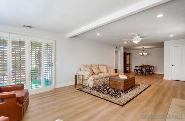 Discover easy living and timeless charm in this beautifully updated single-story 2BR/2BA home located in the desirable Seven Oaks 55+ community of Rancho Bernardo. Offering approx. 1,358 sq. ft. of light-filled living space, this residence blends modern comfort with low-maintenance living. Step inside to an open-concept great room and dining area featuring new LVP flooring, new moldings, recessed can lighting, and plantation shutters throughout. The well-appointed kitchen boasts KraftMaid semi-custom cabinetry, granite countertops, and newer appliances—ideal for everyday living or entertaining. A spacious primary suite includes built-in closet wardrobes and a beautifully bath. Additional highlights include a tankless water heater, new roof, and a private side patio with views, perfect for relaxing outdoors. This charming home also includes a lighted carport and a lockable golf cart garage, ideal for storage or a small workshop. Residents enjoy a vibrant lifestyle with access to the community clubhouse, pool, spa, fitness center, pickleball courts, woodshop, library, and a full calendar of social events. Upgrades/Features list: - Newer interior paint 2025 - Newer LVP flooring - Newer moldings - New roof 2025 - Tankless water heater - Plantation Shutters throughout -Recessed can lights - Kraftsmade semi custom cabinets - Open concept great room/dining -Well appointed kitchen -Spacious master suite - Built in closet wardrobes - Designer laundry room - View rear patio deck (Paint colors by Sherwin Williams - Shoji white walls, Pure white enamel doors and moldings)