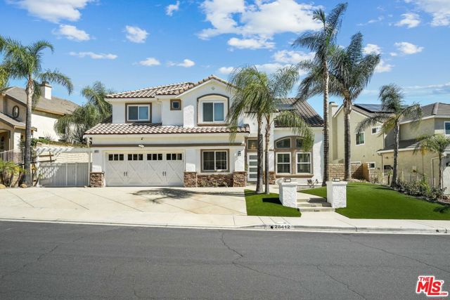 Welcome to 28412 Rock Canyon Drive, a beautifully designed 5-bedroom, 3-bathroom home offering 3,182 square feet of spacious living on a 6,647 square foot lot in one of Santa Clarita's most desirable neighborhoods. This residence seamlessly blends elegance, functionality, and energy efficiency featuring solar panels, a large side yard ideal for RV or boat parking, and a layout perfectly suited for modern family living. As you enter, you're welcomed by soaring ceilings and an abundance of natural light that fill the open-concept formal living and dining areas, creating an inviting and airy atmosphere. The thoughtful floor plan flows effortlessly into the heart of the home a ~ spacious kitchen that overlooks the family room. Here, you'll find ample cabinetry, generous counter space, and a layout designed for both everyday living and entertaining. The adjoining family room features a cozy fireplace and direct access to the backyard, making it the perfect space to gather with loved ones or unwind after a long day. Downstairs, a full bedroom and bathroom offer versatility for guests, in-laws, or a private home office. Upstairs, the expansive primary suite provides a serene retreat complete with a large ensuite bathroom featuring dual vanities, a soaking tub, separate shower, and a walk-in closet. Three additional bedrooms upstairs offer ample space for family, a home gym, or creative workspace, while the open hallway and landing maintain the home's bright and open feel. Step outside to a private backyard designed for relaxation and outdoor enjoyment. The spacious patio is perfect for barbecues, family gatherings, or simply soaking up the Santa Clarita sunshine. The large side yard offers plenty of room for RV or boat parking, adding a rare and valuable feature to this already impressive property. With a 2-car attached garage, low-maintenance landscaping, and solar panels, this home combines practicality and comfort with significant long-term savings. Ideally located in a peaceful and family-friendly community, this home is just minutes from top-rated schools, parks, shopping, dining, and freeway access. 28412 Rock Canyon Drive embodies the perfect balance of style, functionality, and convenience offering the space, comfort, and energy efficiency today's homeowners are looking for.