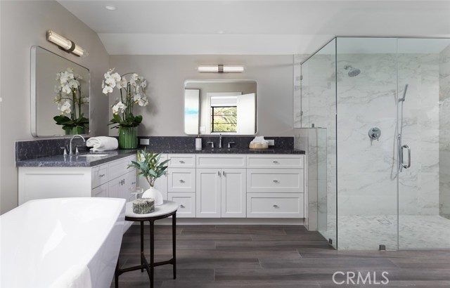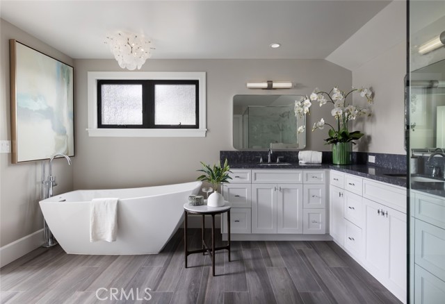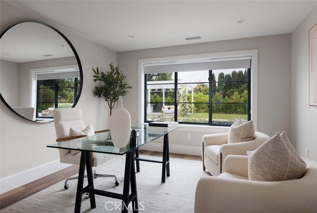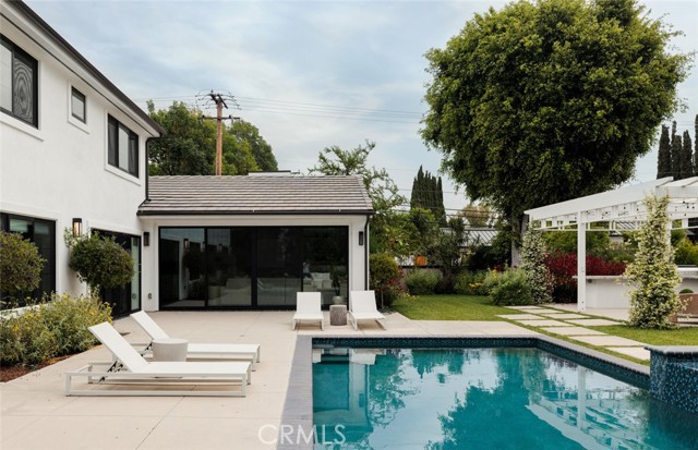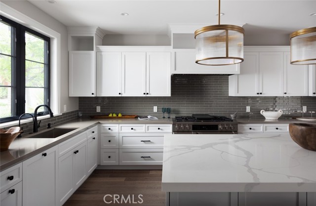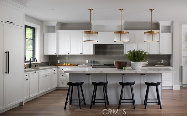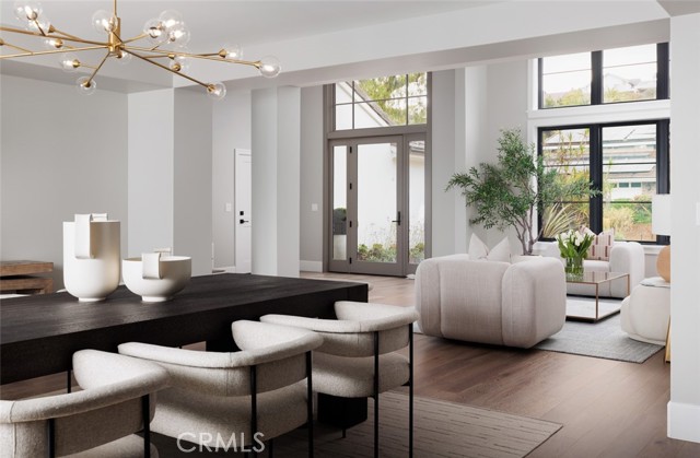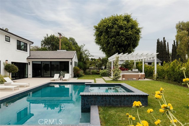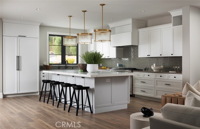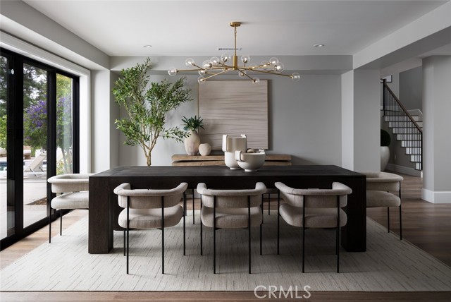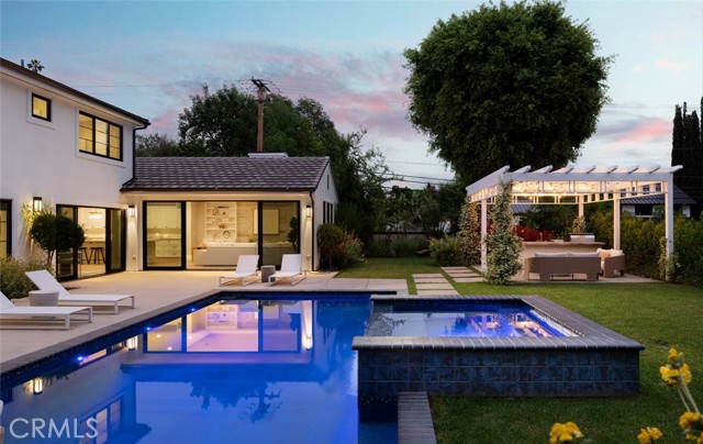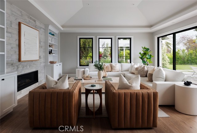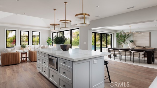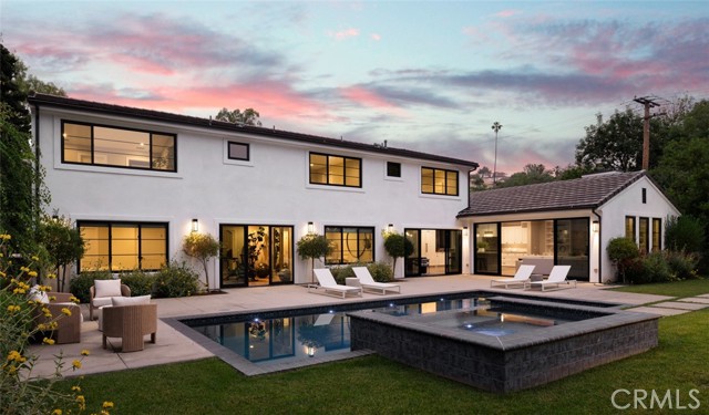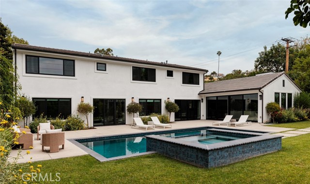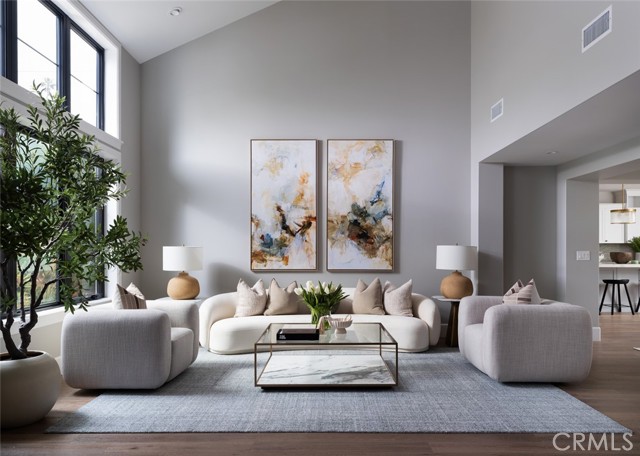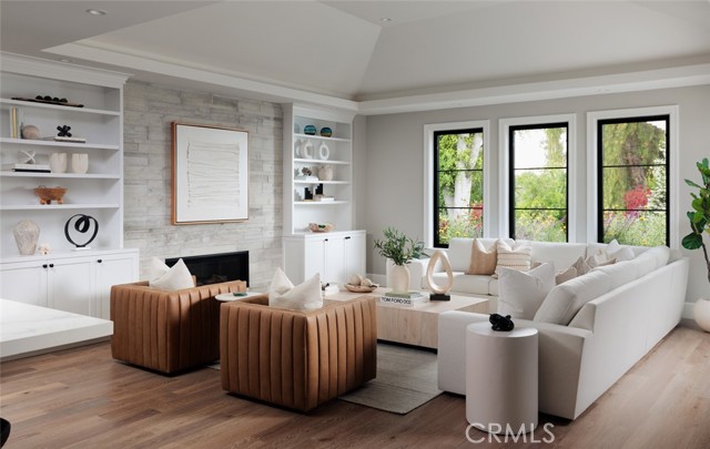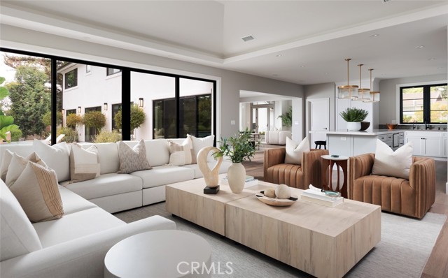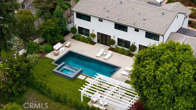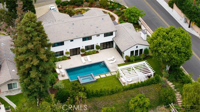Newly rebuilt in late 2022 from the studs out and completely reimagined and expanded, this fabulous new home in Villa Park is truly unparalleled. Move-in ready, the residence offers the rare and enviable combination of newer construction in an established neighborhood, with mature landscaping and a prime corner homesite of about .46 acres adding to its undeniable appeal. Bathed in natural light that shines through an abundance of large windows, the open design showcases a foyer and living room with double-height ceilings, a contemporary staircase and a lofty interior balcony above. The grand dining room is certain to be a favorite place to share memorable occasions, and it opens to the backyard, creating a seamless indoor/outdoor vibe. Equally open and stylish, the on-trend kitchen displays white Shaker cabinetry, a large island with bar seating, quartz countertops, subway tile backsplash, a stainless steel pro-caliber range, and a built-in cabinet-matched refrigerator. The kitchen flows effortlessly to a family room that is distinguished by a high ceiling, backyard access, and a stone fireplace flanked by custom built-in shelving and cabinetry. Sophisticated and modern, the home’s aesthetic is embellished with warm white and gray hues, wood-plank flooring and chic LED lighting. Five bedrooms plus office/gym and four and a half baths are featured in approximately 4,005 square feet, including ensuite bedrooms, a main-level bedroom, an office, and an upscale-modern primary suite with a vaulted ceiling, freestanding tub, separate shower and two sinks. Grounds are impeccable, with low-water plantings, a tranquil pathway, and an attached three-car garage with a large paver-finished driveway in the front yard. The rear yard reveals a brand-new pool and spa, a large patio, verdant lawn, a lower level with fragrant orange trees, and a beautiful pavilion with a built-in BBQ bar. Excellent schools serving K-12 are nearby, and parks, shopping centers, trails, and restaurants are close to home.