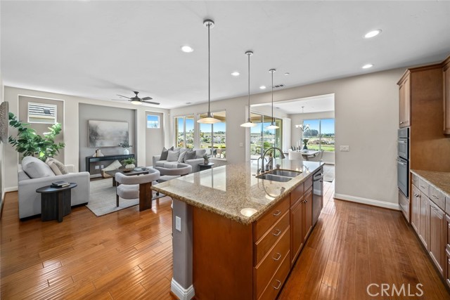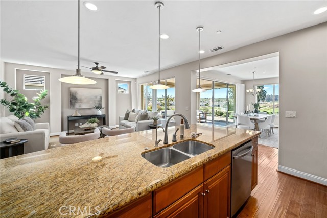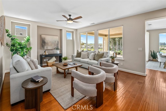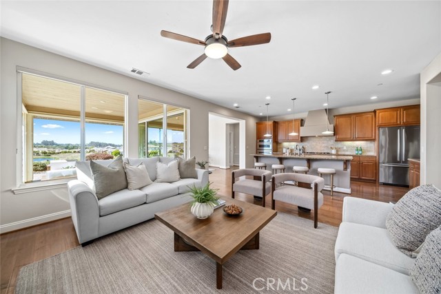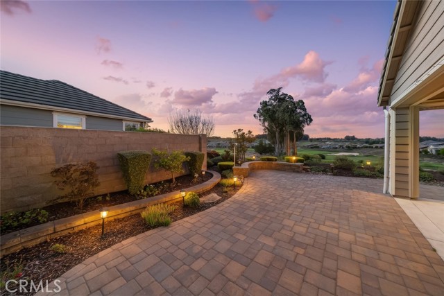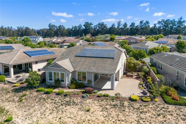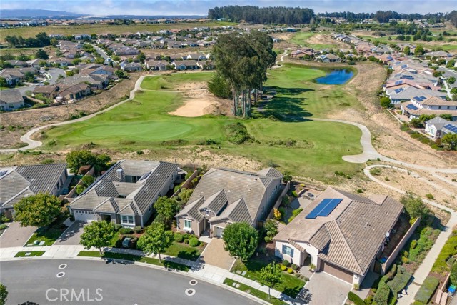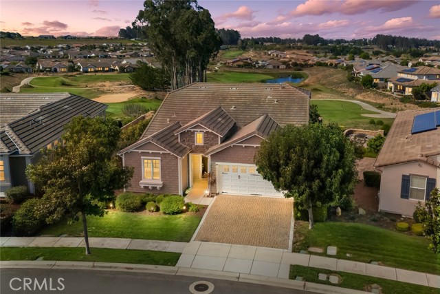 Resort living begins in this California Coastal “Nice” floor-plan home, beautifully situated on a very desirable cul-de-sac with a birds-eye panoramic view of the 5th, 6th and 7th holes of the Challenge Golf Course, plus the magnificent coastal sunsets. This 1,945 sq. ft. home, built in 2014, offers 2 bedrooms, 2 full bathrooms, plus a den with French door enclosure. Designer upgrades abound, including gorgeous hand scraped engineered wood floors, sweeping granite island with custom lighting, plantation shutters, ceiling fans and a rolling wall of glass providing exquisite views. Enter the gallery hallway and head toward the culinary kitchen - you’ll love the raised panel cabinetry, granite countertops and island, tile backsplash, JennAir stainless steel appliances, including a 5-burner cooktop and a walk-in pantry - it’s a chefs dream! Around the corner is the coveted SmartSpace/laundry, designed for optimum organization with a built-in desk, storage cabinets and countertops - it’s a great space for working from home or enjoying your favorite hobbies. Across from the kitchen is a super comfortable living room with a spacious den next door, and a large dining room with loads of natural light and incredible views. Head outside the rolling wall of glass to the covered patio - it’s the perfect spot to relax and enjoy the incredible central coast sunsets. The patio is surrounded by gorgeous, lush landscaping which frames the breathtaking golf course and lake views, and features plenty of hardscape space to entertain family and friends. Meandering pathways lead to the side yards, one outfitted with a raised garden bed. When it’s time to head indoors you can retire to your luxurious owner’s suite with a spacious bedroom which overlooks the backyard, and an en-suite bathroom with separate dual sinks, tile shower with seamless glass enclosure, and a large walk-in closet. Your guests will enjoy the comfort of their own wing with a light and airy bedroom and a full bath with tub/shower. In addition, there’s energy-efficient solar and a 2-car garage. Best of all, this spectacular home is located in Trilogy with all the amenities to fully enjoy life on the Central Coast.