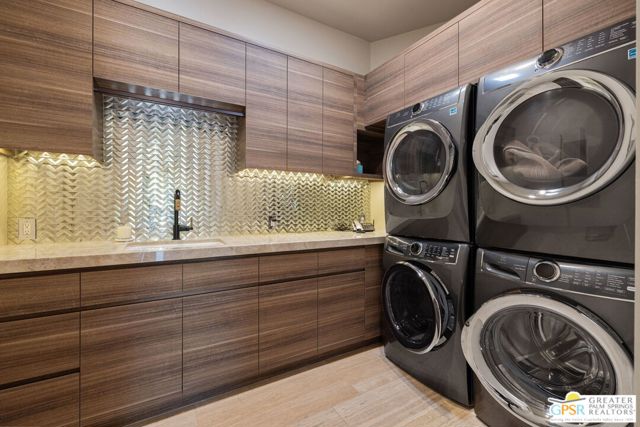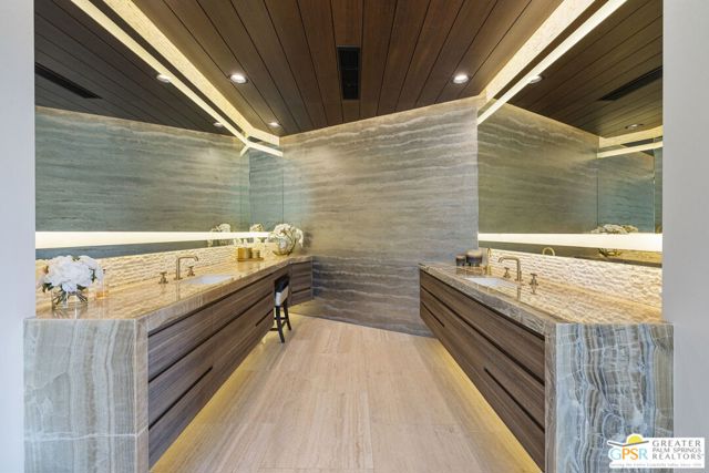 LIKE NOWHERE ELSE. Perched on an elevated, tiered setting in Tamarisk's coveted Sterling Ridge, this architectural residence dissolves the boundary between indoors and out. Motorized walls of glass reveal a sculpted landscape of boulders, desert plantings, and unrivaled outdoor living. Offering 5 bedrooms and 7 baths, the home delivers fantastic separation of bedrooms with two primary retreats, each a sanctuary unto itself. Soaring ceilings, refined finishes, and lush surroundings create an ultra-private compound that has been meticulously maintained. Every detail is elevated with a Crestron Smart Home system controlling fire and water features, motorized sliders, lighting, shades, and more. A new whole-home water filtration and softener system enhances everyday comfort and convenience. The professional-grade kitchen showcases Wolf, Sub-Zero, and Miele appliances, complemented by a full bar, hidden prep kitchen/butler's pantry, and a glass-enclosed, climate-controlled wine room bordering the dining area. Resort-style amenities abound: an oversized spa, dramatic pool with waterfall, and a separate 25-meter lap pool. The expansive covered patio is equipped with misting systems, recessed heaters, a pool bath, a 75" pop-up TV, and a 52" Kalamazoo BBQ station designed for year-round enjoyment. The oversized garage, finished with A/C and custom cabinetry, completes the offering. Retreats of distinction: Primary Suite One with fireplace and panoramic views opens directly to both the spa and lap pool. Primary Suite Two features its own fireplace, a private patio, and an outdoor shower in a secluded wing. Junior Ensuite Three enjoys a patio framed by boulders, while Junior Ensuite Four opens to the lap pool. Ensuite Five offers direct motor-court access. With only 11 residences in Sterling Ridge, the community offers unmatched exclusivity. Here, sunrises and sunsets against the mountain backdrop provide a daily spectacle, an ever-changing canvas that owners describe as pure entertainment.