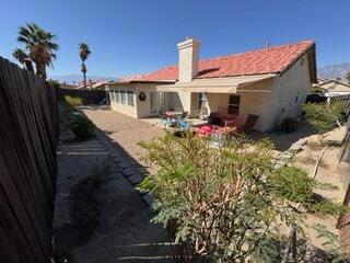 Welcome to this wonderful home in a quiet community with quick access to the I-10 freeway, Costco, Sam's Club and other shops and delicious restaurants in Rancho Mirage and Palm Desert. It features 2 bedrooms and 2 baths with a fully insulated bonus sun room, including a swamp cooler (for when you don't want to use the central air conditioning), which leads through double doors to the back yard. An open, charming living room with high ceilings and a cozy fireplace greets you from the front door. Low maintenance desert landscaping in the front and back yards with a retractable awning over the pavers giving a nice shade when you want it, and close it for those beautiful desert nights when you want to gaze at the stars. Bedroom featuring distressed laminate flooring and a master bathroom with dual vanity and walk in closet. Guest bathroom has a single vanity, deep soak tub with shower, and another walk-in closet. Stainless steel appliances in the kitchen with expansive granite countertops, designer back-splash and plenty of cabinets and drawers for all of your culinary tools.