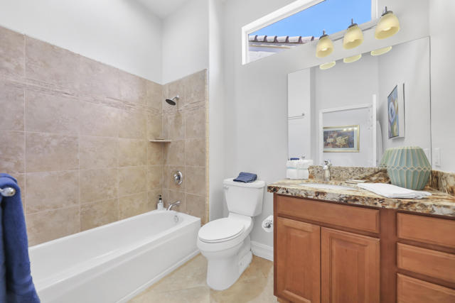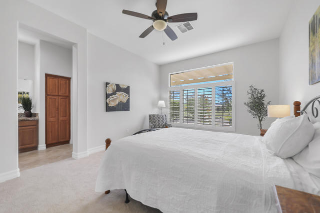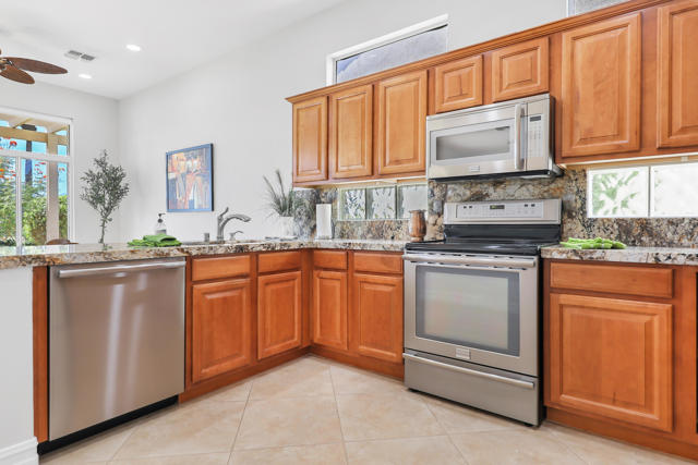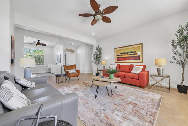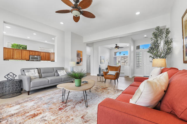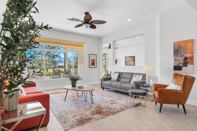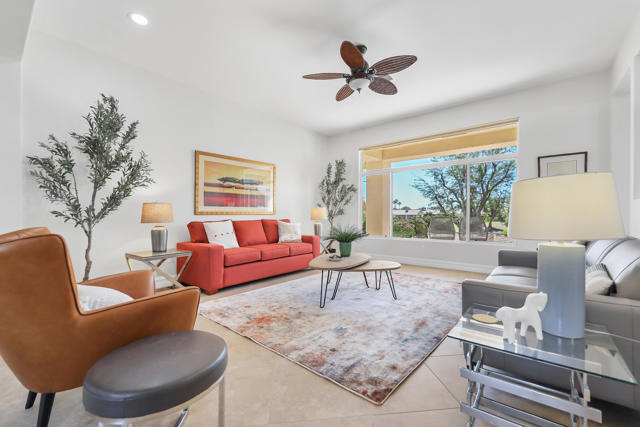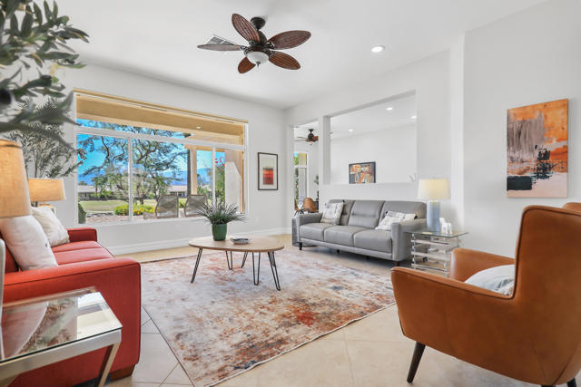 Welcome to sought after Sun City Palm Desert. This home is a Tangier model with stunning south-facing golf course and mountain views! It is back on the market at a significantly reduced price. Located near the Sunset View Clubhouse, this beautifully maintained home features 10-ft ceilings, transom windows, and an open-concept layout filled with natural light. The upgraded kitchen includes granite counters, stainless appliances, and maple cabinetry. The primary suite offers a custom tile shower, dual sinks, and a large walk-in closet with built-ins. Enjoy the den/office, granite-updated bathrooms, and tile flooring throughout most living areas. Outside, relax on the salt-finished patio with an Alumawood cover overlooking the fairway. Upgrades include AC (2016) and water heater (2017). Two-car garage with golf cart nook. Experience resort-style living with golf, tennis, fitness centers, pools, and more in this vibrant 55+ gated community!