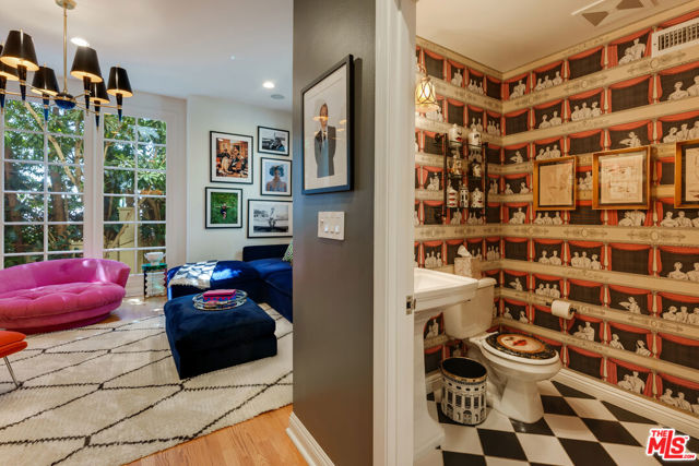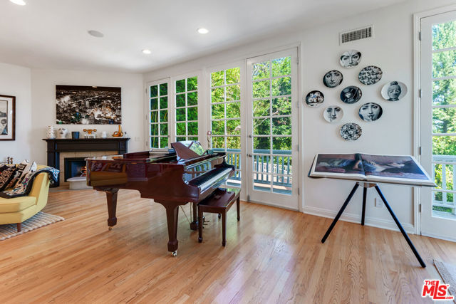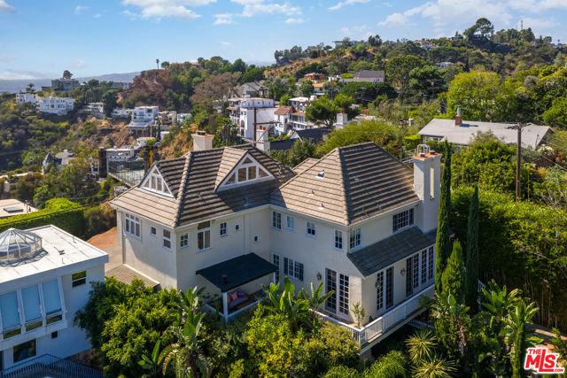 Perched high in the Hollywood Hills West, on a celebrity lined street, this private apx 4,000 sq ft hillside retreat offers modern sophistication with sweeping views of the city, mountains, and the iconic Hollywood sign - just minutes from the flats of West Hollywood, the legendary Sunset Strip, Studio City, and close to everything of interest. A dramatic entry courtyard, complete with Italian Cypress, lavender, and a custom fountain, sets the stage. Inside, soaring 14-foot ceilings and designer details - including Fornasetti and Scalamandre wall-coverings, Ralph Lauren and Jonathan Adler lighting throughout, oak floors, and George Nelson pendants - create a refined yet inviting atmosphere. The open living and dining areas flow seamlessly to expansive terraces designed for entertaining. A chef's kitchen boasts a glass-door Sub-Zero refrigerator, Viking appliances, and generous counter space. Multiple outdoor dining and lounging areas are enhanced by a fireplace, outdoor kitchen, and fruiting lemon trees. Three spacious ensuite bedrooms each feature walk-in closets and stunning views. Dual primary suites offer fireplaces, steam showers, and private balconies, while a separate staircase leads to a third ensuite bedroom and a custom loft. A den/screening room with surround sound and fireplace completes the interior. Outdoors, meandering stone pathways lead to a half basketball court under custom lighting - perfect for recreation or gatherings. A two-car garage, natural light throughout, and layered landscaping enhance this hillside oasis. Located within the award-winning Wonderland School District, this property offers privacy, style, and an entertainer's dream setting in the heart of the Hollywood Hills.
