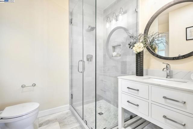 Beautifully remodeled 5 bedroom, 3 bathroom, 2741sf home with attached two-car garage in the highly sought-after neighborhood of Upper Rockridge. Designer touches include a Spanish inspired interior, inviting archways, newly refinished oak hardwood and porcelain tile floors, limestone tiling, a TOTO smart bidet, Google NEST Smart thermostat and smoke/carbon monoxide alarms, all LED lighting, Milgard windows, new paint, plumbing and electrical throughout and much more. An elegant kitchen boasts brand new stainless steel appliances by Bosch, a large island and a breakfast nook. Also on the main floor is a formal dining area, living/family room with high ceilings and a wood burning fireplace. Top level features two spacious bedrooms and a double-sink bathroom. Down the hall is a second primary bedroom with en suite bathroom. Lower levels include a beautiful main primary bedroom with a luxurious bathroom and walk-in closet; a convenient laundry room; and a fifth bedroom/office. There’s even a large rumpus room that could be transformed into a home theater or media/gaming retreat. Secluded backyard is easy-to-maintain and features a large deck. Close to award winning coveted schools, Montclair, BART and Claremont Country Club & Golf Course.