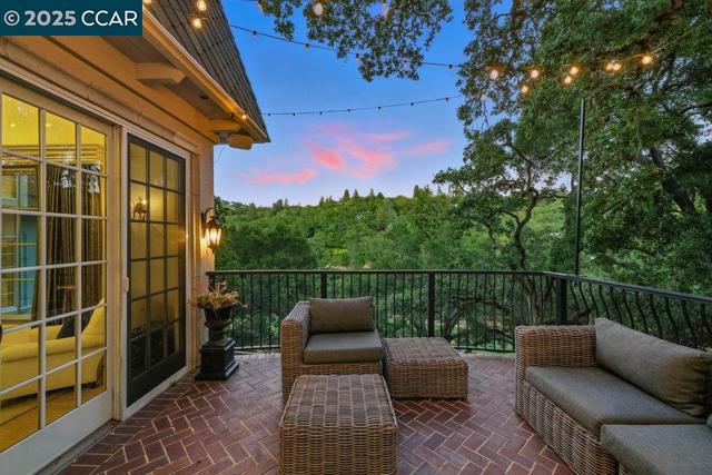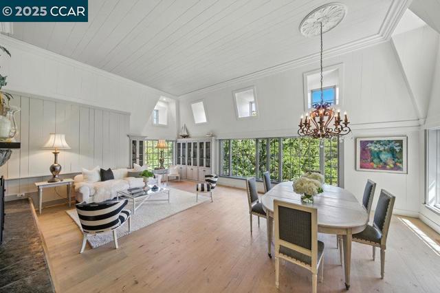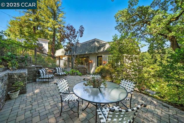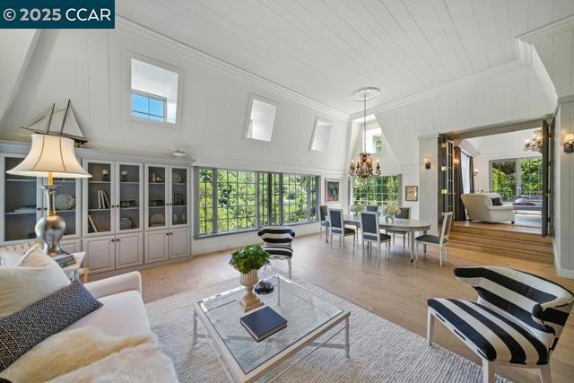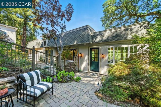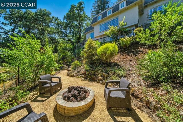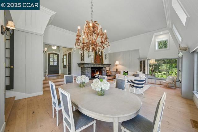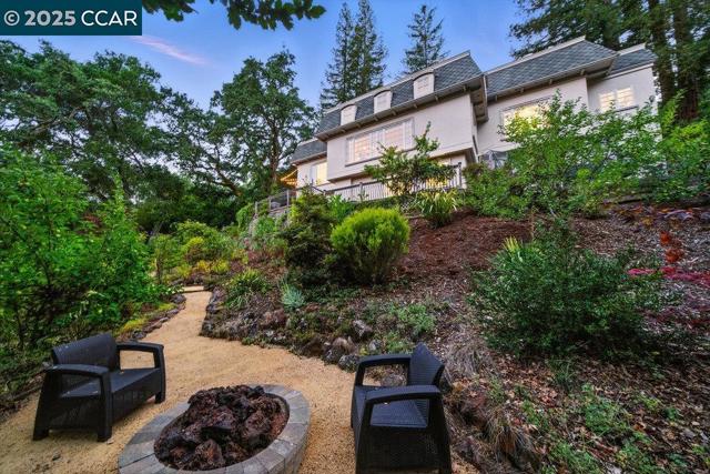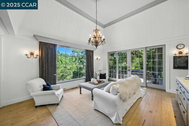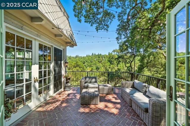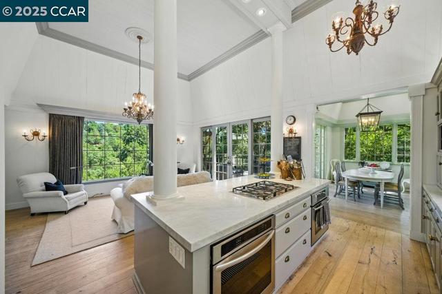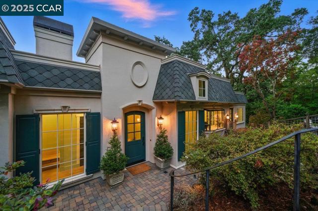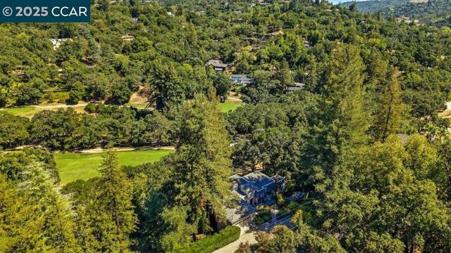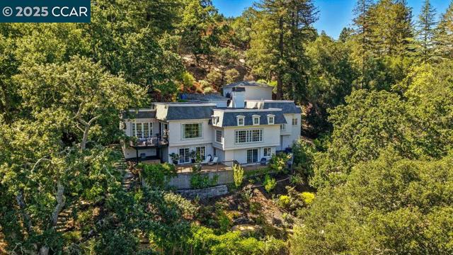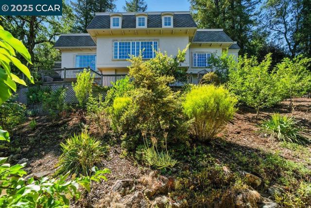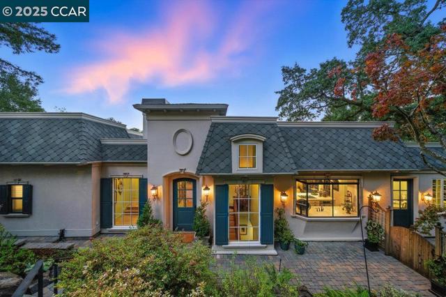 Perched above the 5th Fairway of Orinda Country Club, this stunning French Country home offers sweeping views of the golf course and oak-studded hills. Renovated in 2016, it features soaring ceilings, dormer windows, and walls of glass that fill the home with light and seamlessly blend indoor and outdoor living. The state-of-the-art eat-in kitchen boasts Carrera marble counters, custom cabinetry, a large island, pantry, and charming breakfast room, all opening to a spacious family room and expansive deck. The grand living room is anchored by a dramatic stone fireplace and flows to the elegant dining area, perfect for entertaining. The serene primary suite includes a private office, luxurious bath, and cedar-lined walk-in closet. Downstairs offers three additional bedrooms, one en suite, an updated bath, and a flexible bonus area. With European white oak floors, new roof, beautifully landscaped yard, gas fire pit, and timeless architectural details, this home is a rare Orinda gem. All this charm in a fantastic centrally located location - moments from down town Orinda, Orinda Country Club and all k-12 years of top rated schools. Welcome Home!