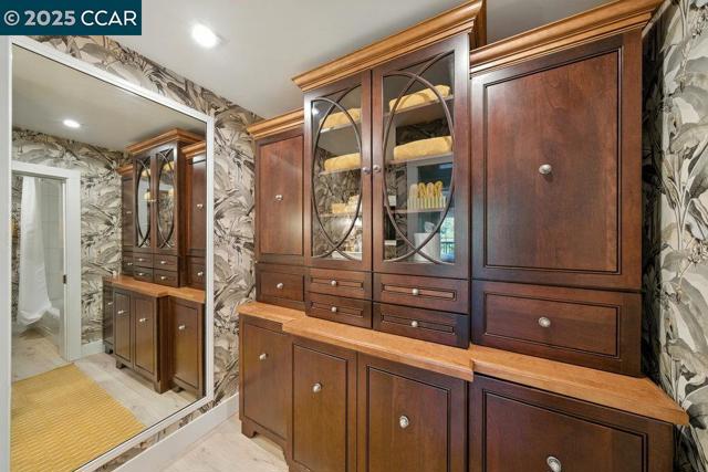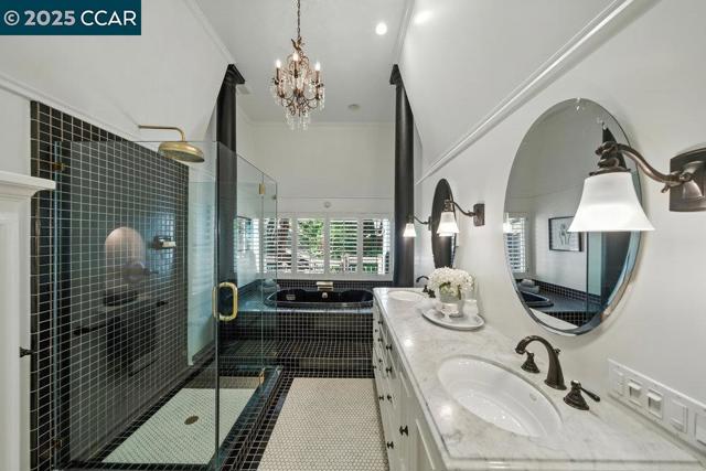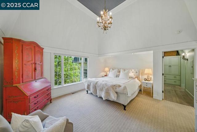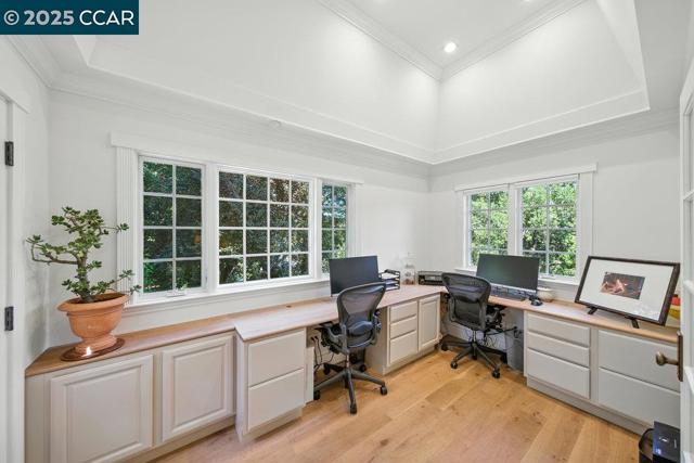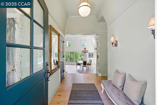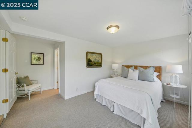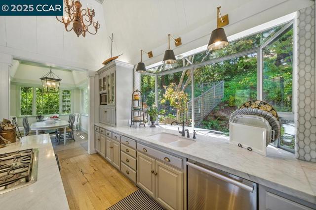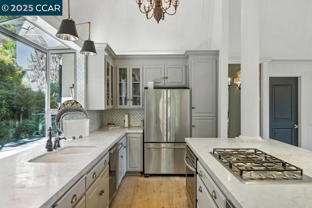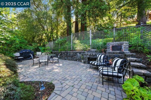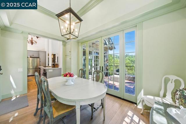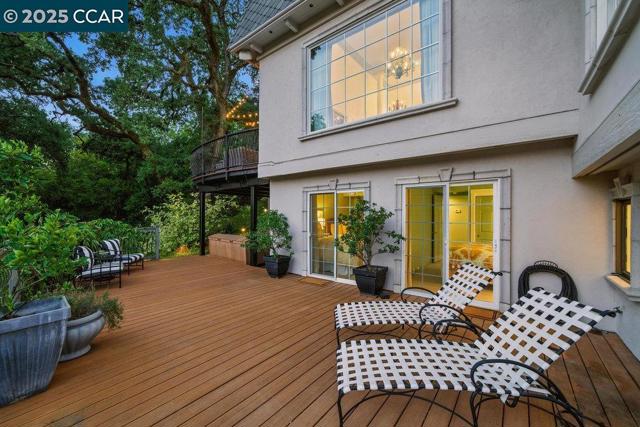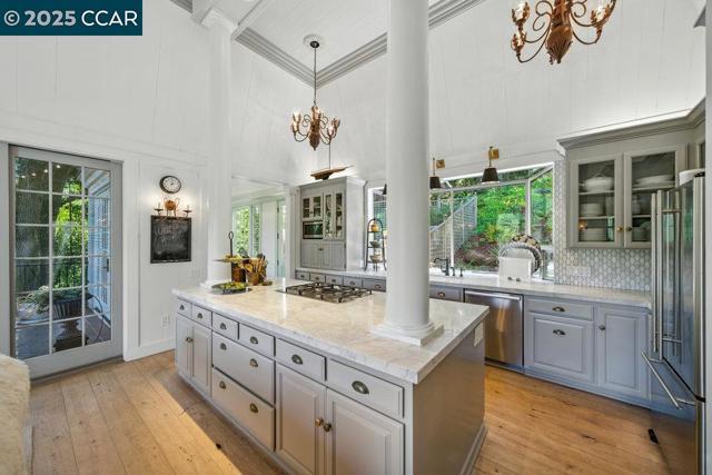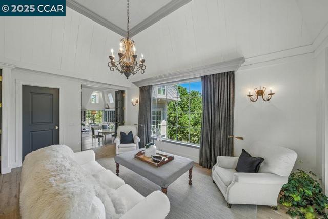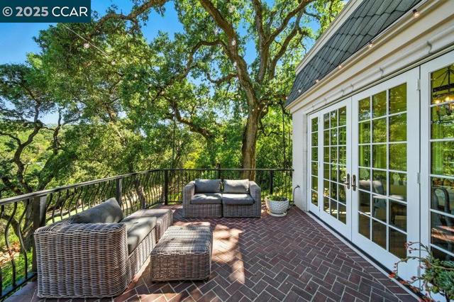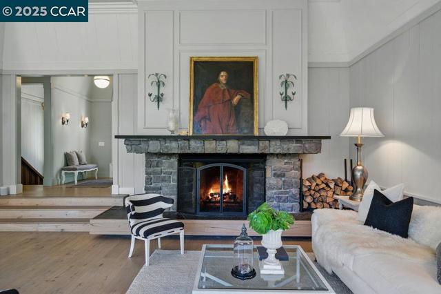 Perched above the 5th Fairway of Orinda Country Club, this stunning French Country home offers sweeping views of the golf course and oak-studded hills. Renovated in 2016, it features soaring ceilings, dormer windows, and walls of glass that fill the home with light and seamlessly blend indoor and outdoor living. The state-of-the-art eat-in kitchen boasts Carrera marble counters, custom cabinetry, a large island, pantry, and charming breakfast room, all opening to a spacious family room and expansive deck. The grand living room is anchored by a dramatic stone fireplace and flows to the elegant dining area, perfect for entertaining. The serene primary suite includes a private office, luxurious bath, and cedar-lined walk-in closet. Downstairs offers three additional bedrooms, one en suite, an updated bath, and a flexible bonus area. With European white oak floors, new roof, beautifully landscaped yard, gas fire pit, and timeless architectural details, this home is a rare Orinda gem. All this charm in a fantastic centrally located location - moments from down town Orinda, Orinda Country Club and all k-12 years of top rated schools. Welcome Home!