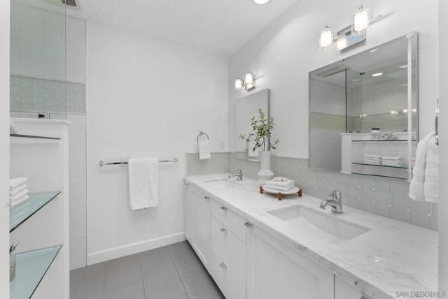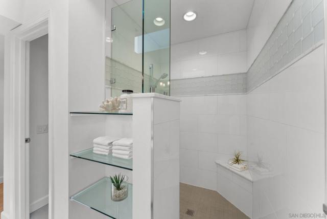 Experience coastal living at its finest in this immaculate, top-floor corner residence offering panoramic views stretching all the way to the Pacific. Flooded with natural light, this 3-bedroom, 2-bath home combines modern design with relaxed elegance. The open-concept living area showcases vaulted ceilings, wide-plank white oak flooring, and seamless flow between the living, dining, and kitchen spaces. The custom kitchen stands out with white shaker cabinetry, quartz countertops, and premium stainless steel appliances — the perfect setting for entertaining or enjoying everyday meals with a view. The spacious primary suite is a private retreat, featuring two walk-in closets and a spa-inspired bathroom with designer tile, dual vanities, and a luxurious walk-in shower. Two additional bedrooms offer flexibility for guests or a home office, complemented by an equally stylish secondary bath. Additional features include in-unit laundry hookups, a private one-car garage plus an assigned parking space, and thoughtful upgrades throughout. Located within the sought-after Sea Point Tennis Club, residents enjoy access to tennis courts, multiple pools and spas, and beautifully maintained grounds. All just minutes from La Costa’s best shopping, dining, golf, hiking trails, and beaches.