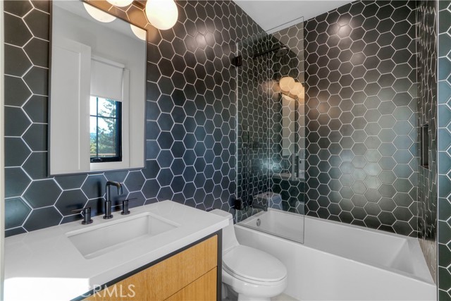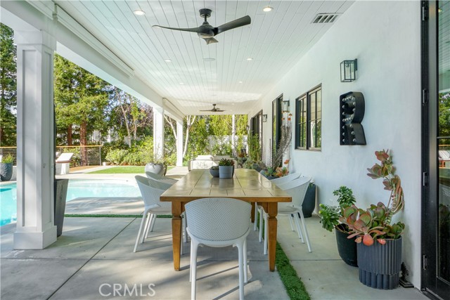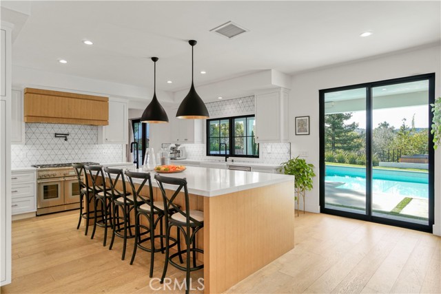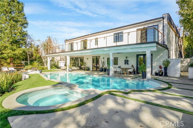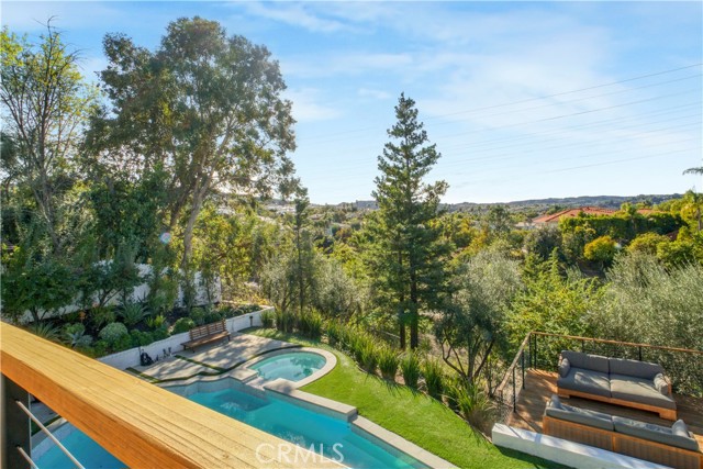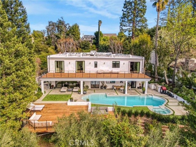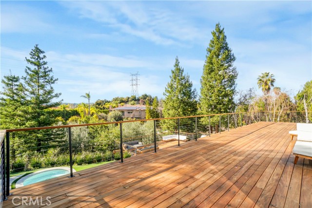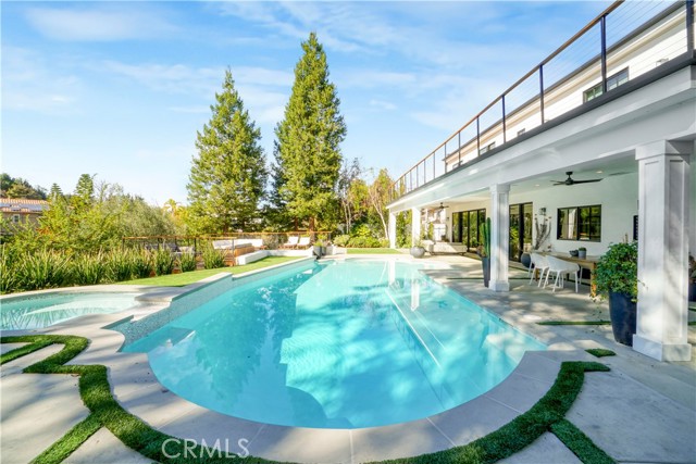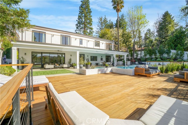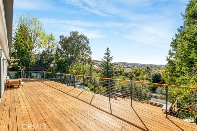 Nestled in the quiet and serene neighborhood of Encino Hills and surrounded by mature trees, this recently and completely renovated home offers stunning views and a thoughtfully designed floor plan featuring five spacious en-suite bedrooms, a powder room and library that could also function as a playroom. The expansive primary suite includes a large walk-in closet and a peaceful seating area, creating a true retreat. A beautiful wooden deck on the second floor, extending across the length of the house, provides a panoramic viewing point. The gourmet kitchen boasts high-end stainless steel appliances and custom cabinetry, complemented by abundant natural light throughout the home. Set on nearly half an acre, the property features a sparkling pool and jacuzzi—both with new tile and plaster—a dedicated dog run, fruit trees, and a vegetable garden. The yard is thoughtfully divided into several seating areas, perfect for relaxation and entertaining. Additional highlights include a three-car garage, integrated smart home technology for convenience and security, and a community tennis court. Elegant interior finishes evoke a relaxed yet refined atmosphere. This home is perfect for entertaining or simply relaxing and enjoying the serene surroundings.
